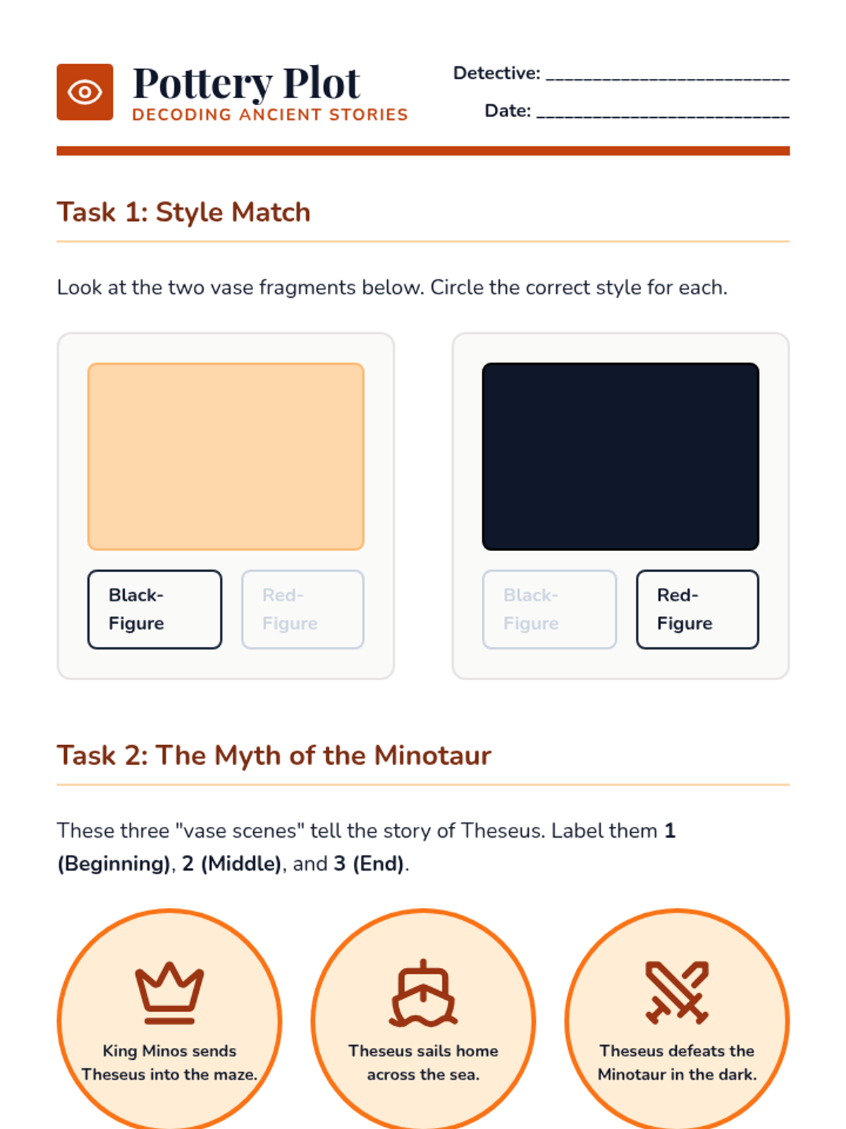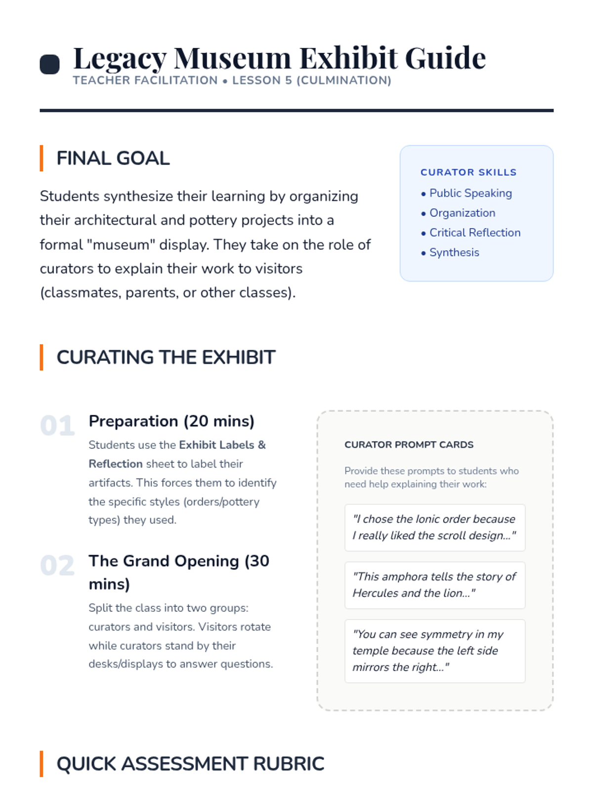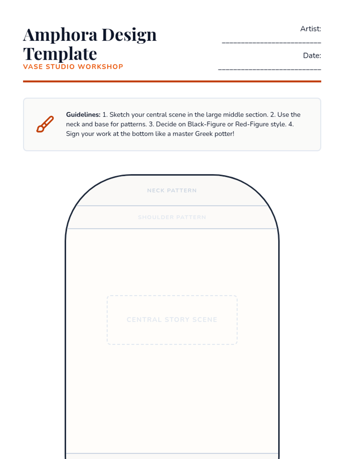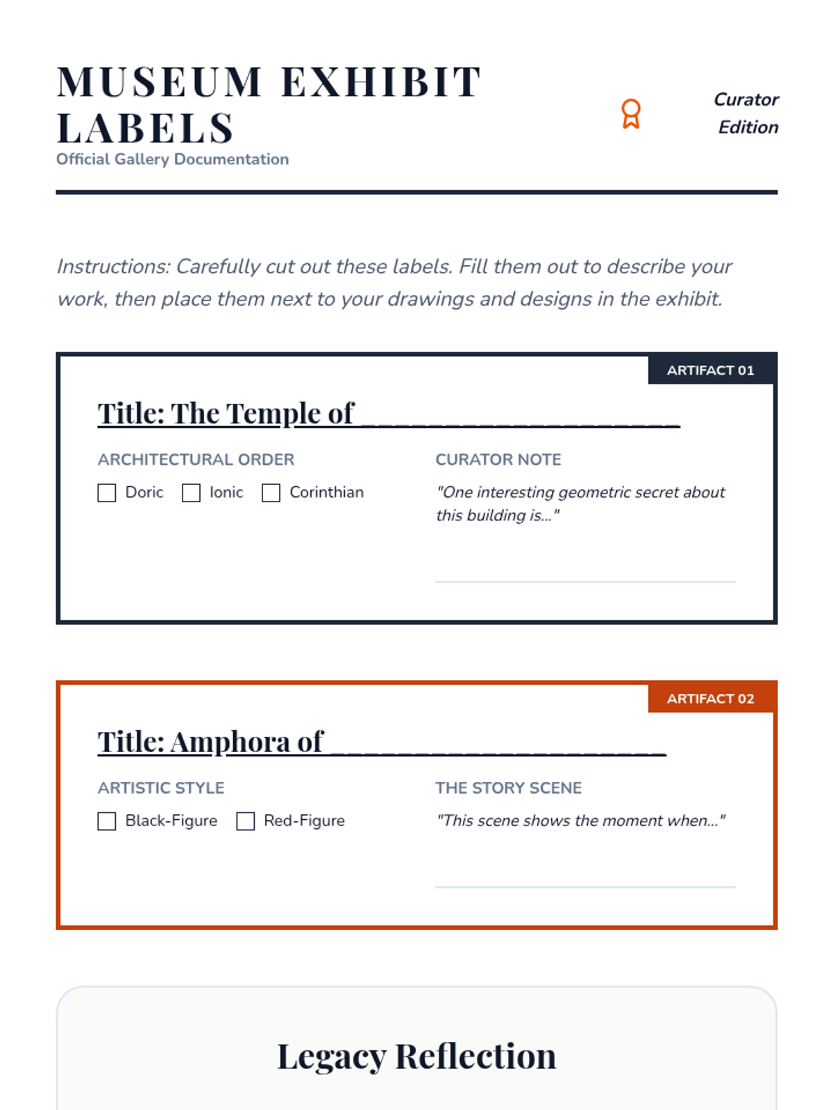 A project-based sequence for 3rd grade exploring ancient Greek architecture and art, focusing on columns, the Parthenon, and pottery storytelling. Students learn to identify architectural orders and create their own Greek-inspired designs.