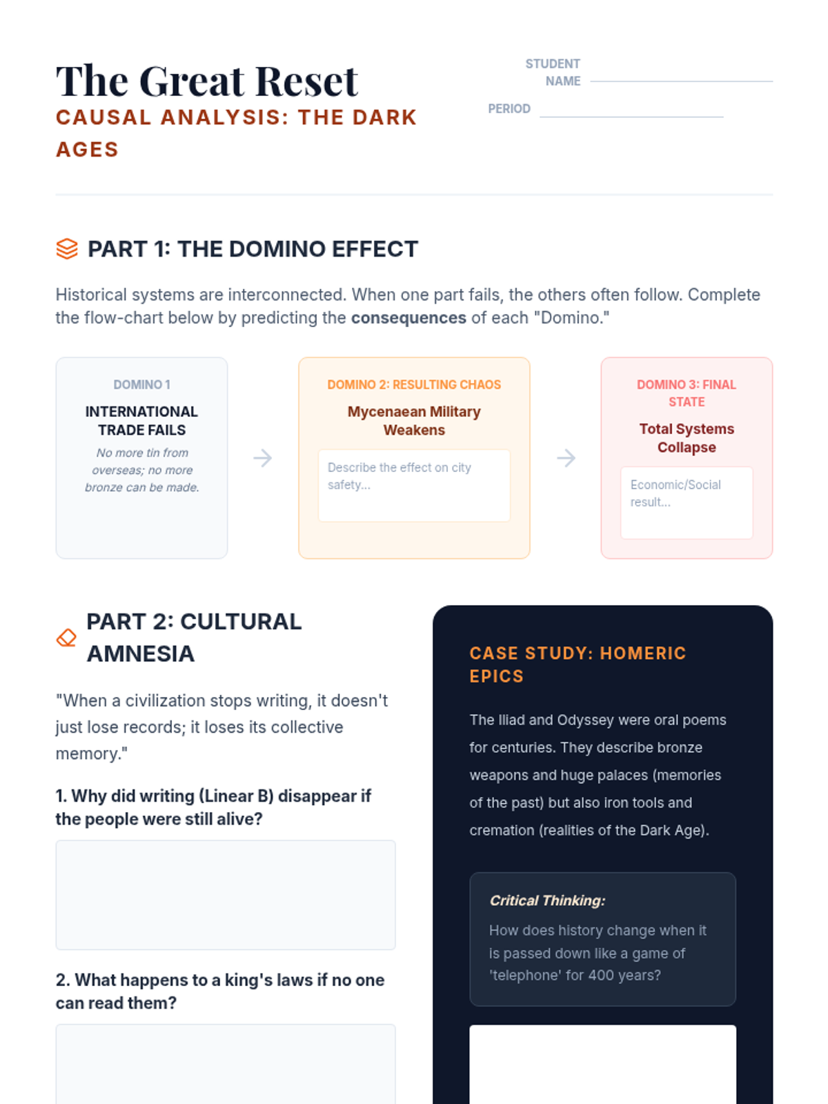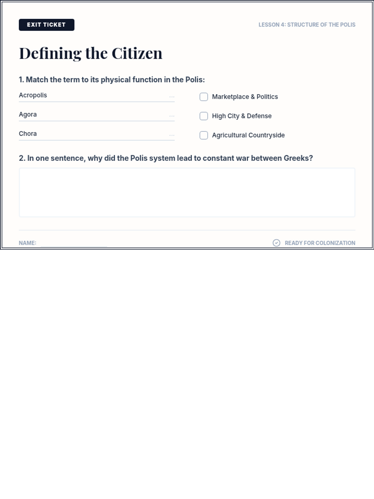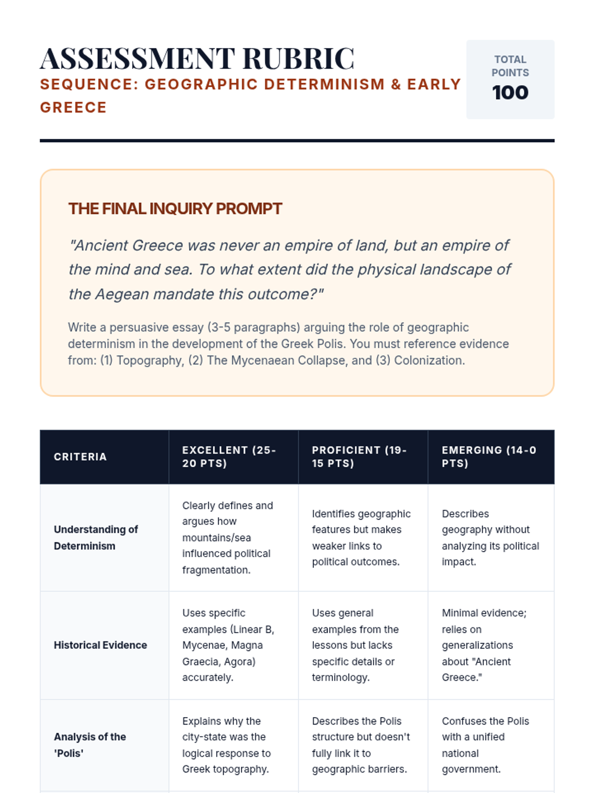This inquiry-based sequence explores how the unique geography of the Balkan Peninsula influenced the development of independent city-states rather than a unified empire. Students analyze topographical maps, Minoan and Mycenaean artifacts, the Bronze Age collapse, and the structure of the Polis to understand the roots of Greek culture and the concept of geographic determinism.