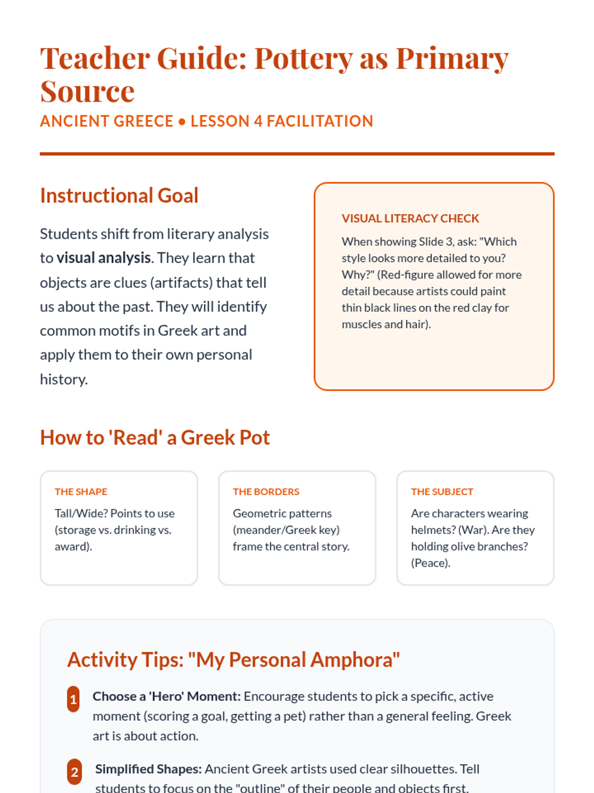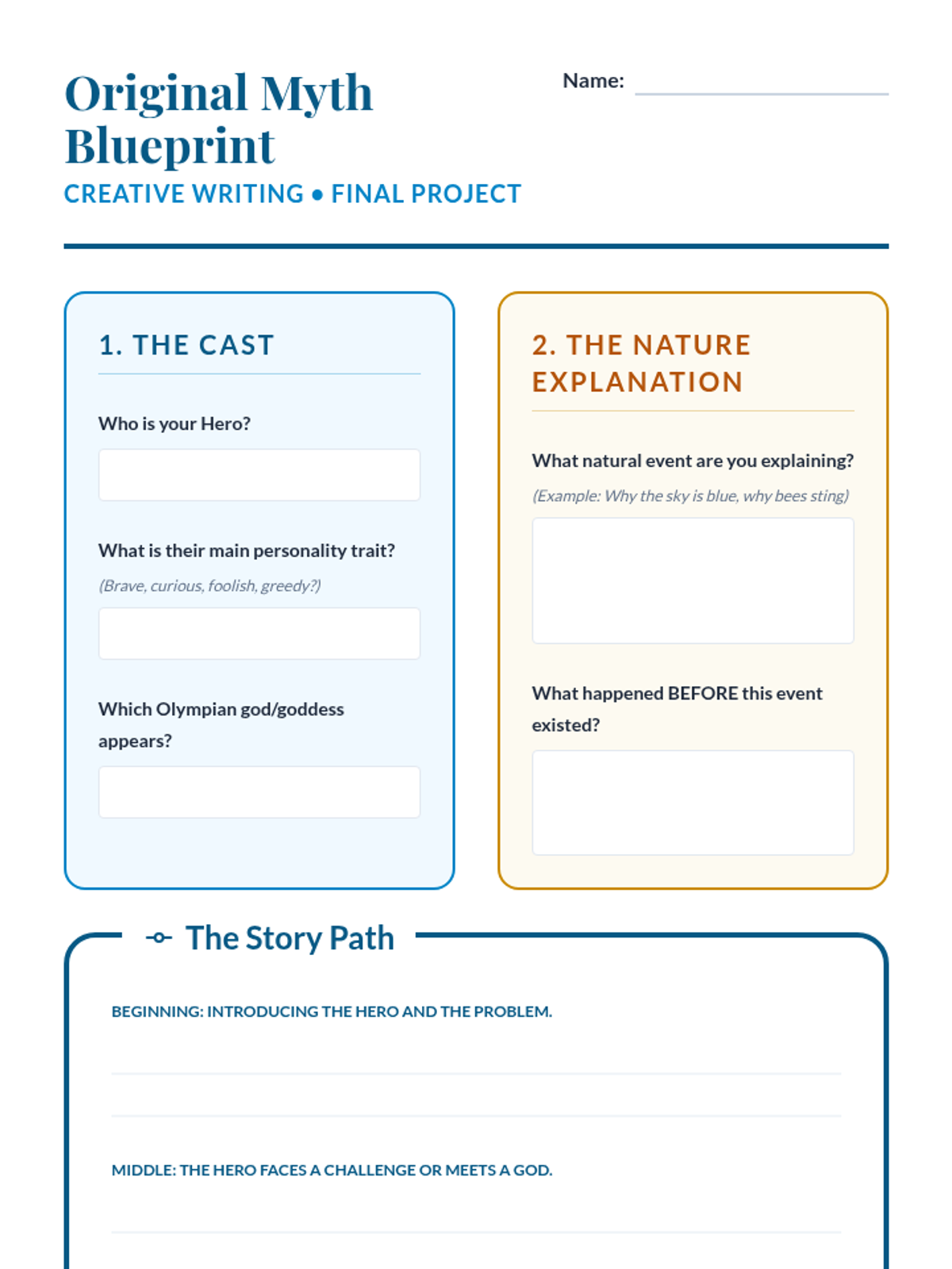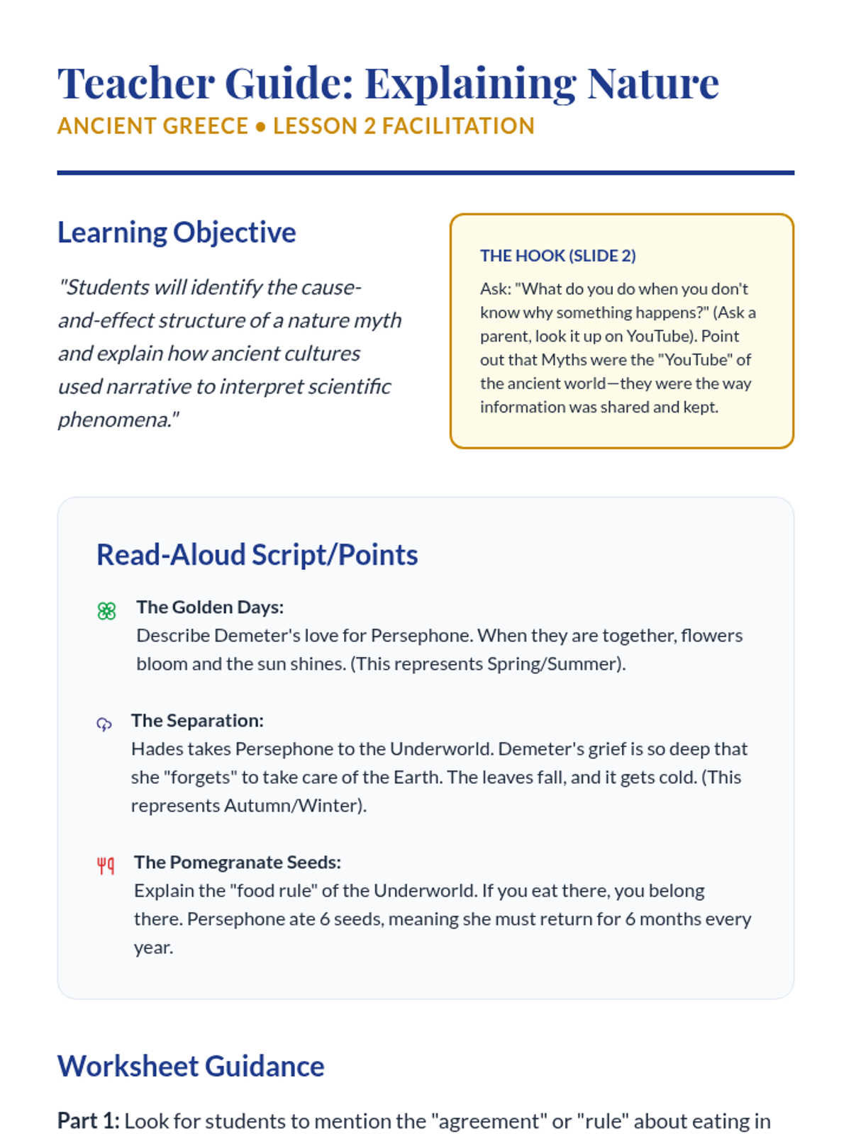 A comprehensive 5-lesson unit for 3rd grade students exploring Ancient Greek culture through the lens of mythology, fables, and art. Students learn how ancient people used stories to explain the world and establish moral values, culminating in the creation of their own original myths.