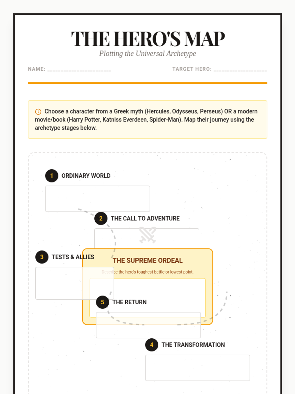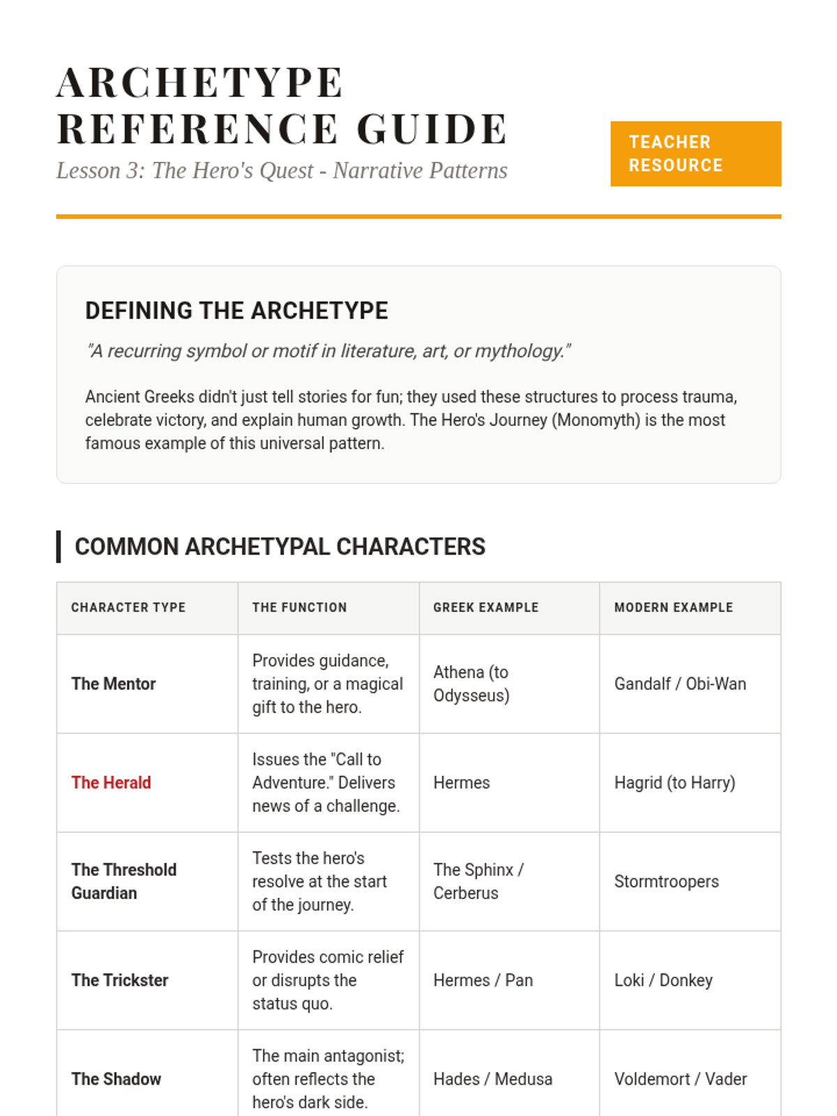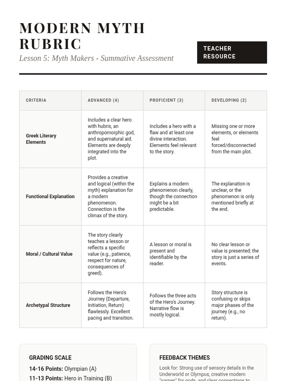 This sequence explores the cultural fabric of Ancient Greece through mythology, religion, and theater. Students analyze myths as explanations for natural events and reflections of cultural values, study the Hero's Journey archetype, and explore the origins of drama.