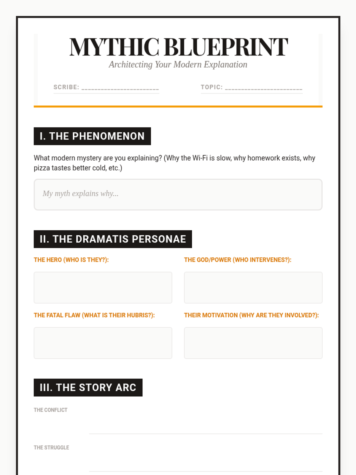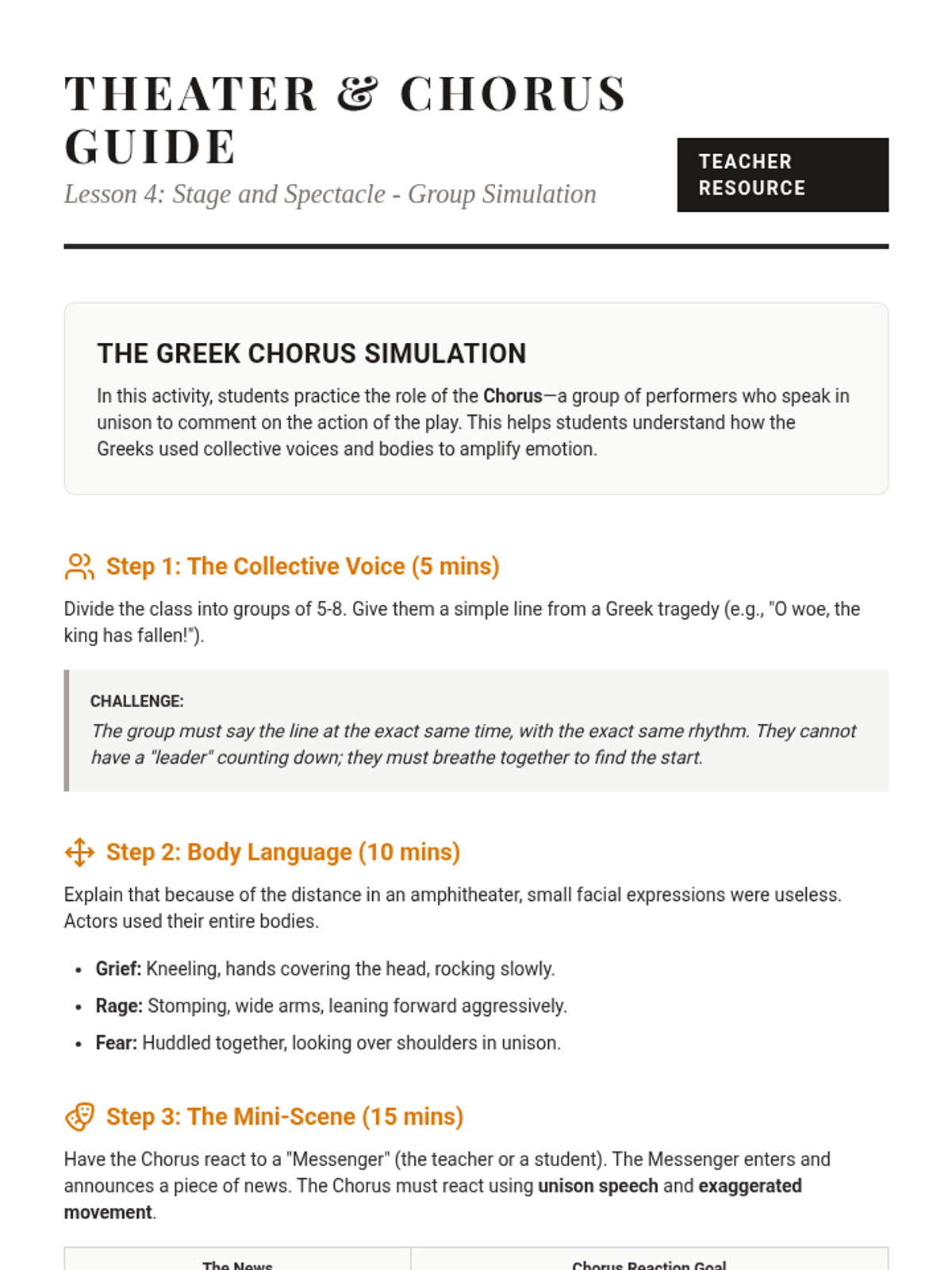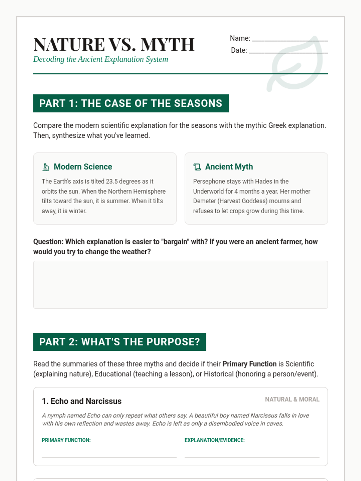 This sequence explores the cultural fabric of Ancient Greece through mythology, religion, and theater. Students analyze myths as explanations for natural events and reflections of cultural values, study the Hero's Journey archetype, and explore the origins of drama.