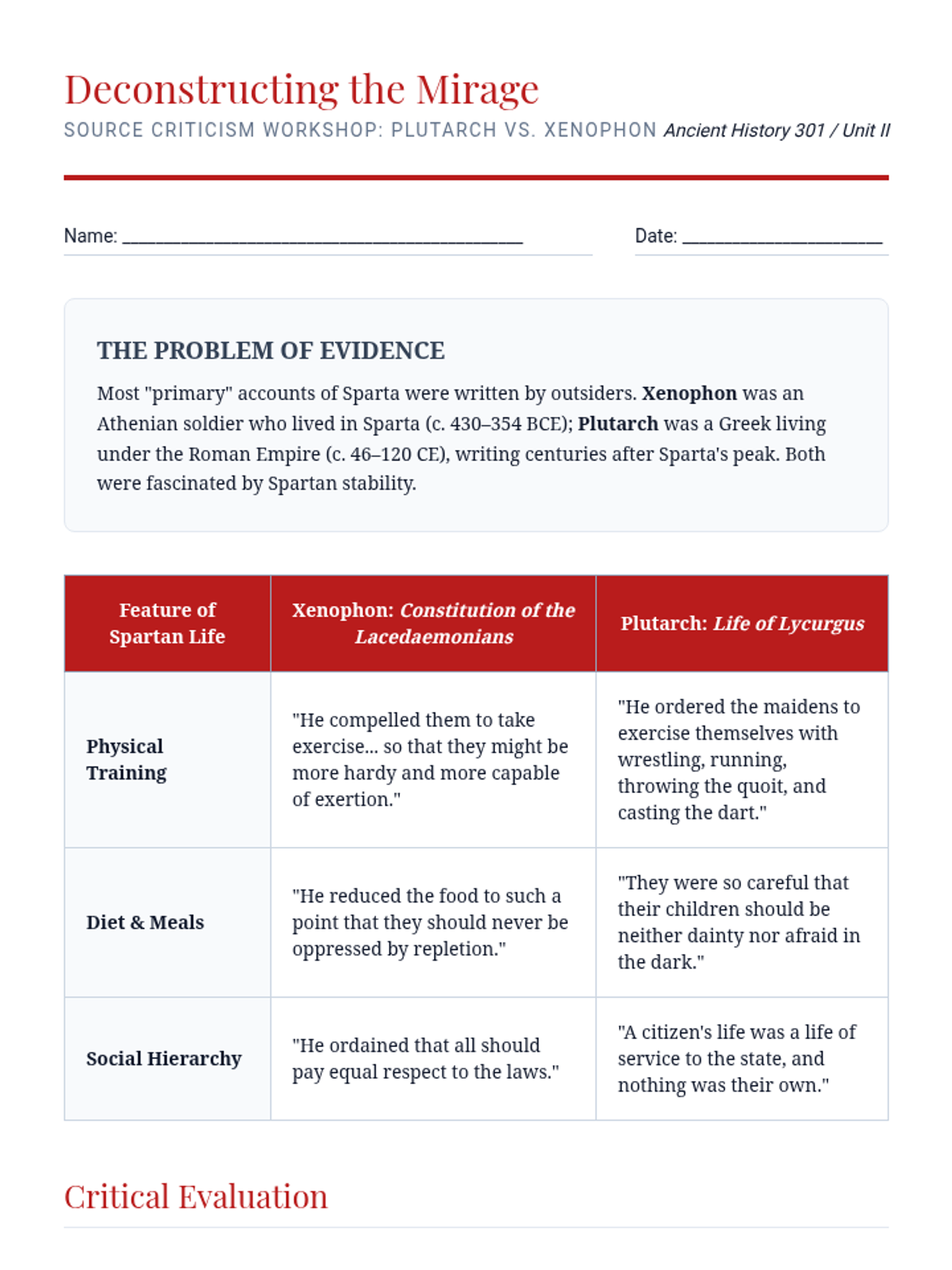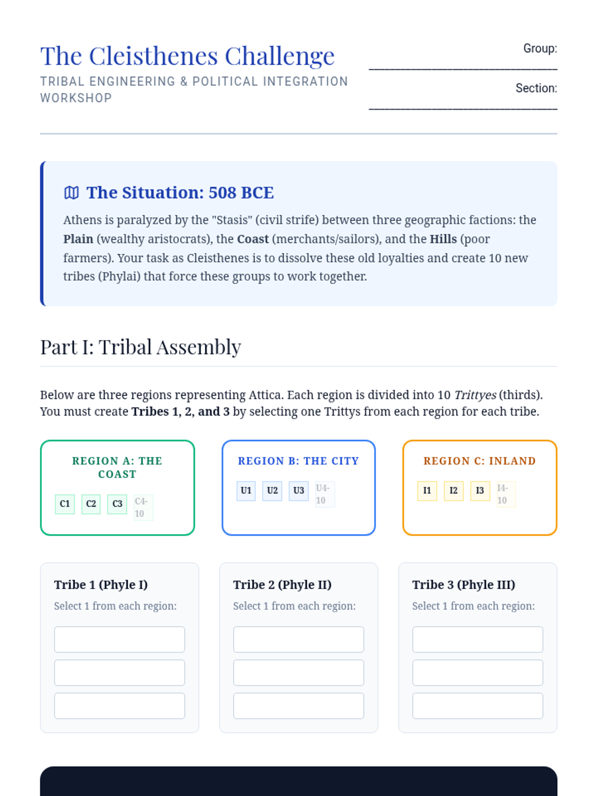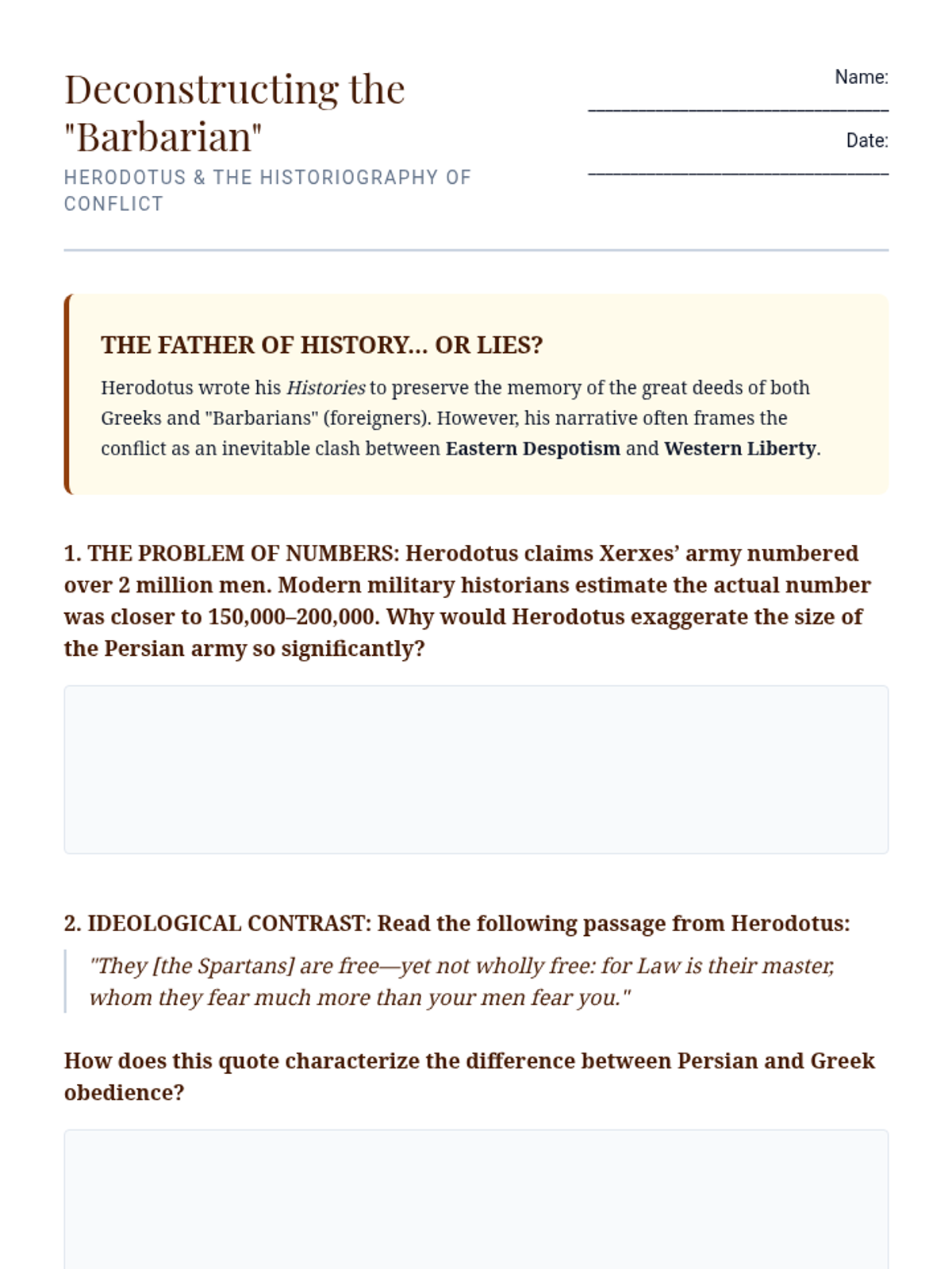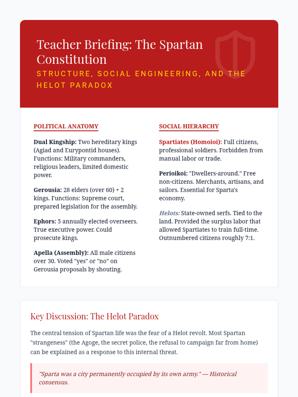 This sequence investigates the divergent political and social trajectories of Athens and Sparta from the end of the Greek Dark Ages through the Persian Wars. Students engage with primary sources and archaeological evidence to evaluate the transition from aristocratic rule to the specialized systems of the Spartan oligarchy and Athenian democracy.