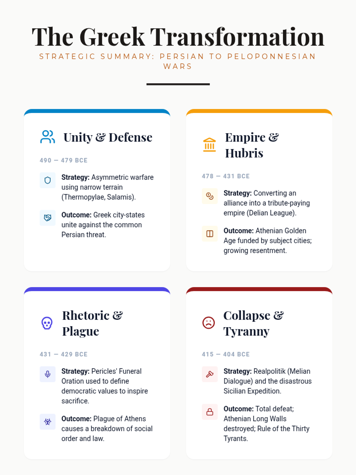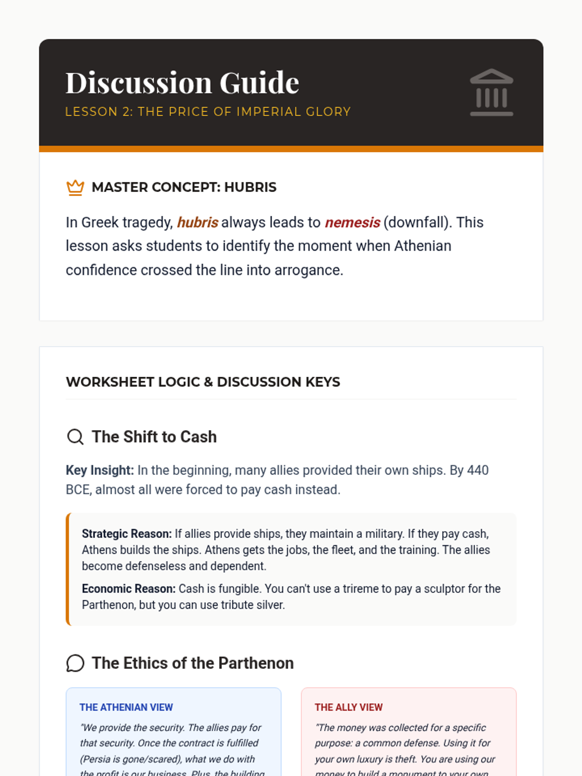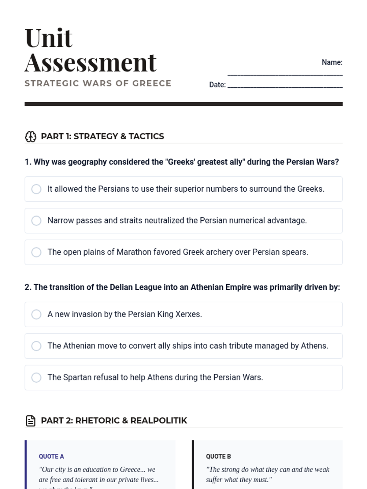 A comprehensive 10th-grade history sequence examining the Persian and Peloponnesian Wars through the lens of strategic decision-making and political transformation. Students engage with primary sources like Thucydides and the Melian Dialogue to explore the evolution of democracy and empire.
