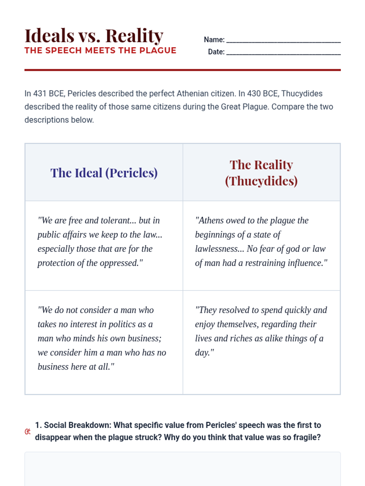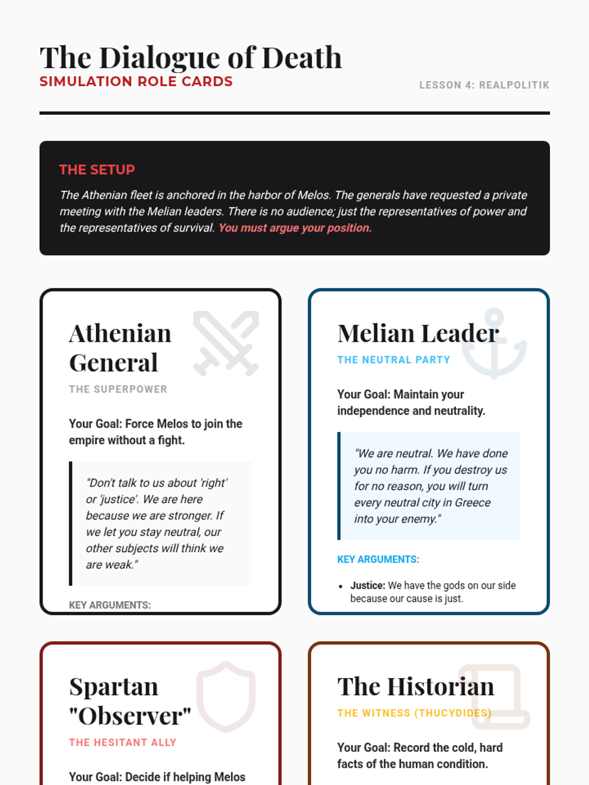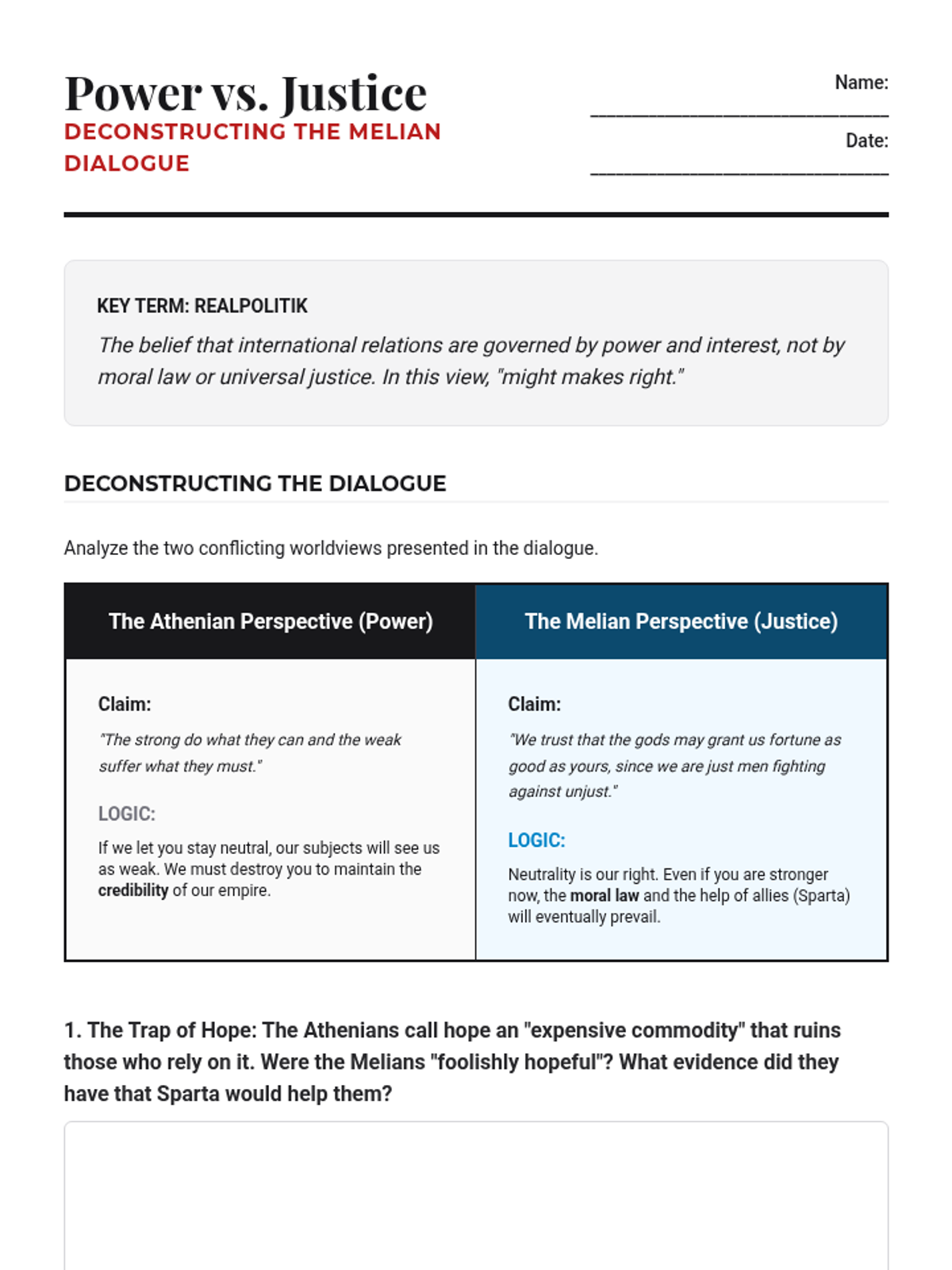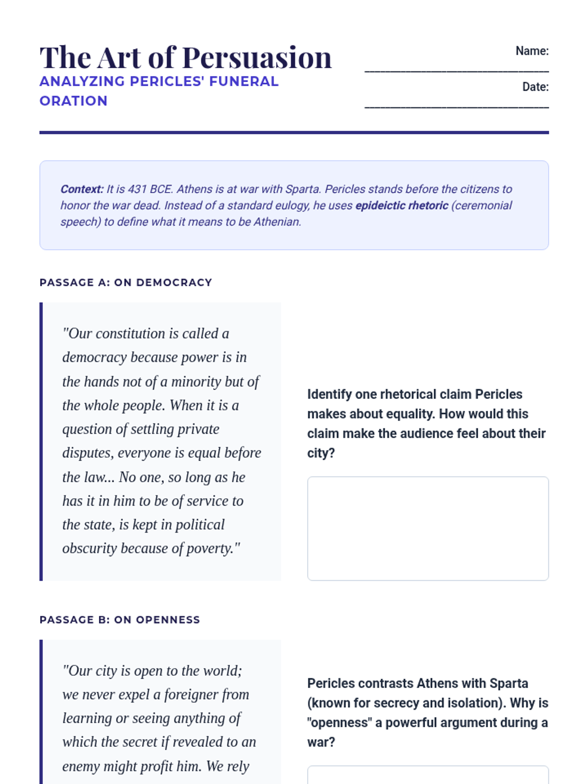 A comprehensive 10th-grade history sequence examining the Persian and Peloponnesian Wars through the lens of strategic decision-making and political transformation. Students engage with primary sources like Thucydides and the Melian Dialogue to explore the evolution of democracy and empire.