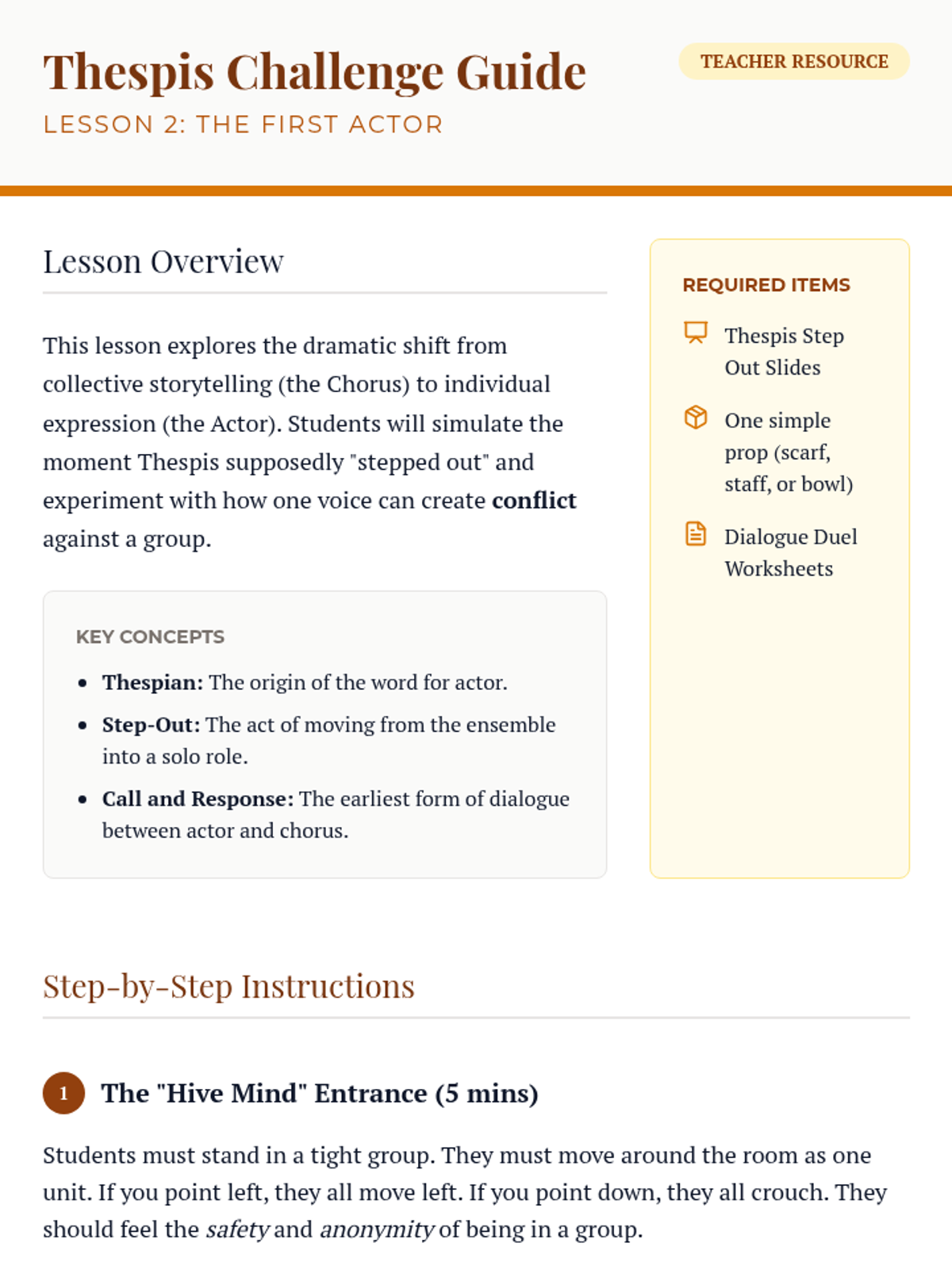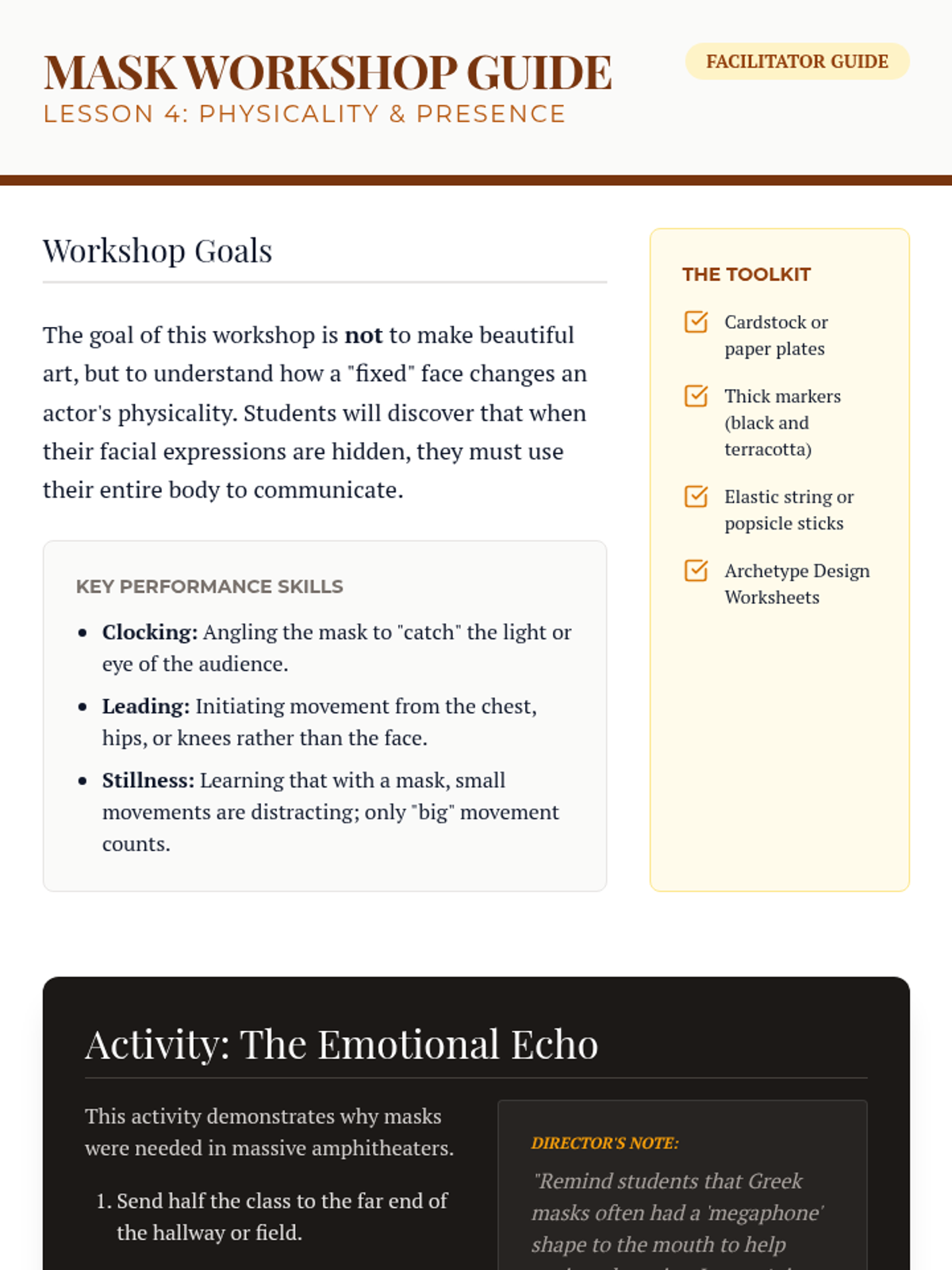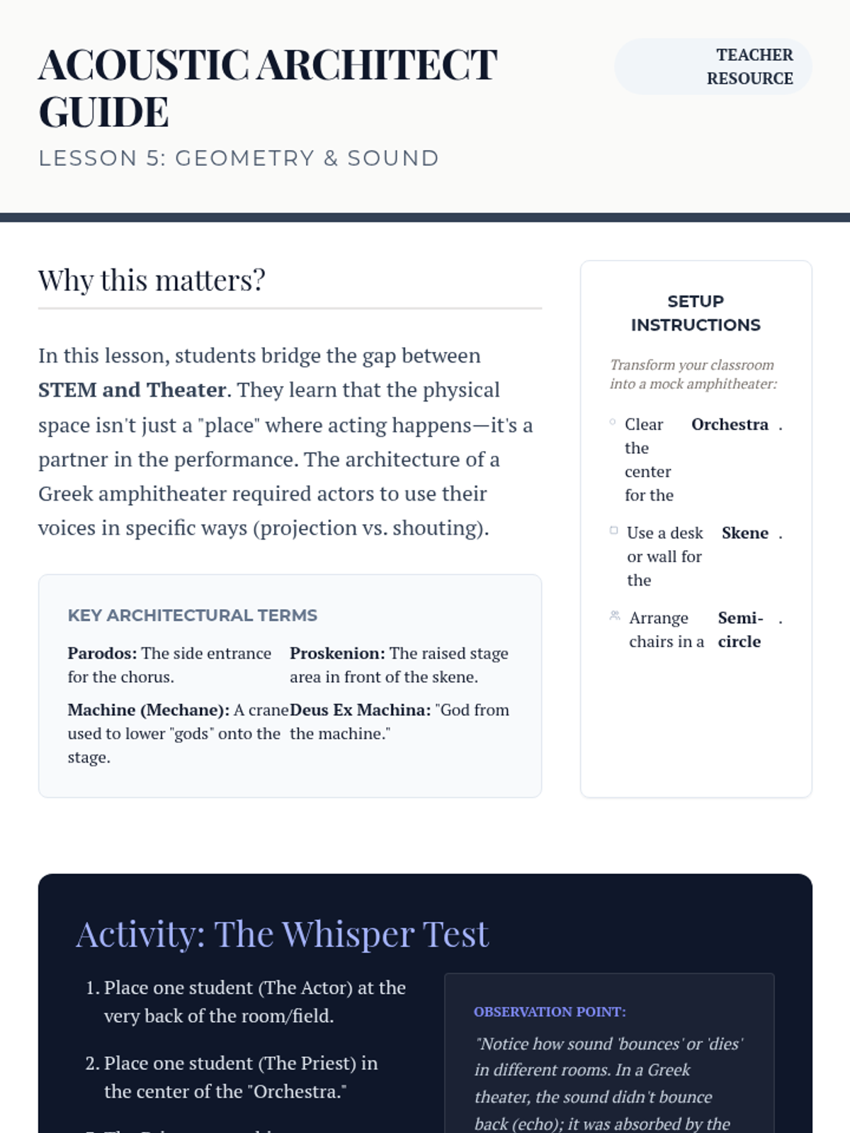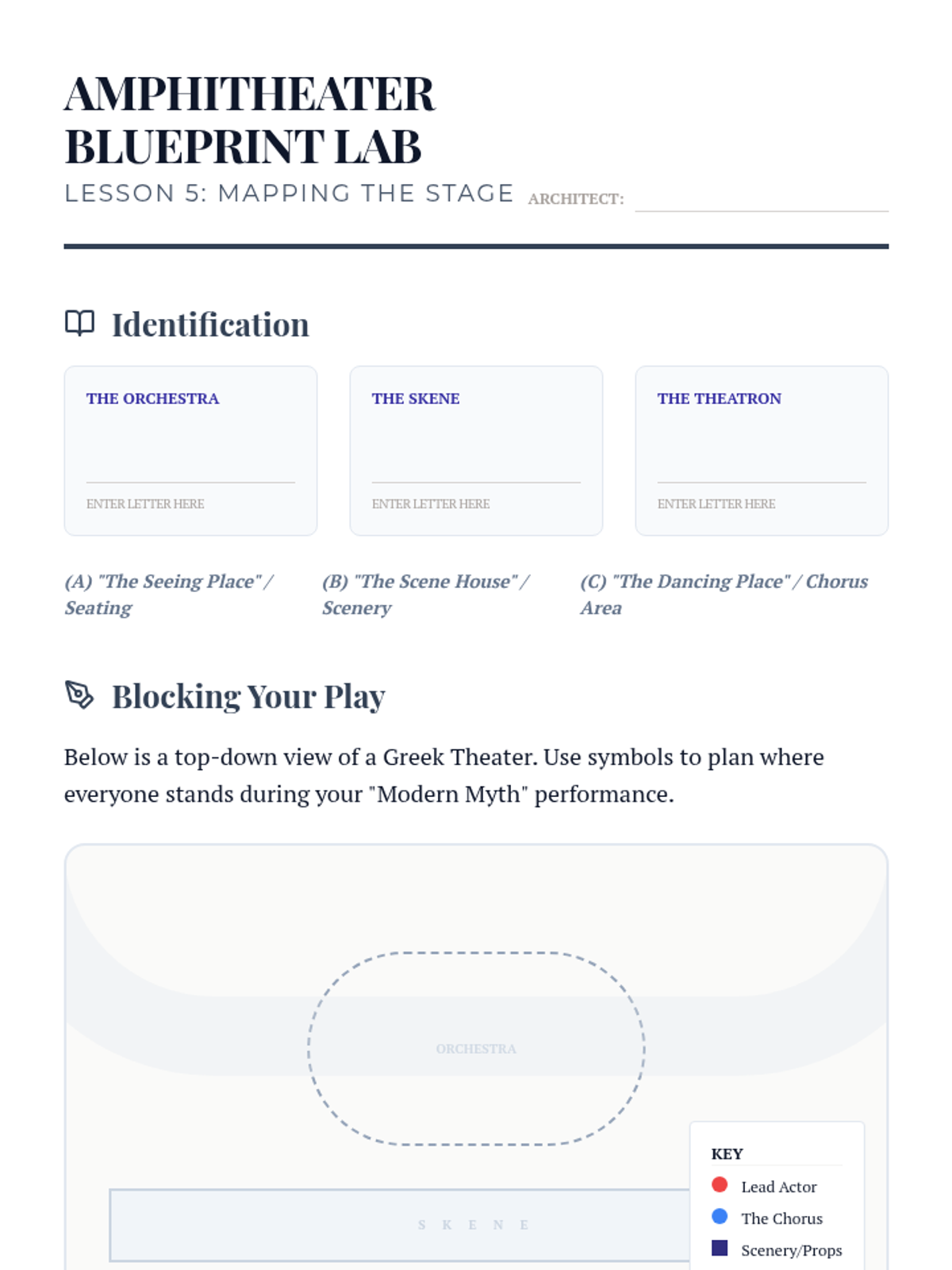 A 5-lesson unit for 6th-grade theater students exploring the ritual origins, physical conventions, and architectural innovations of Ancient Greek theater. Students learn how masks, the chorus, and amphitheaters shaped storytelling.