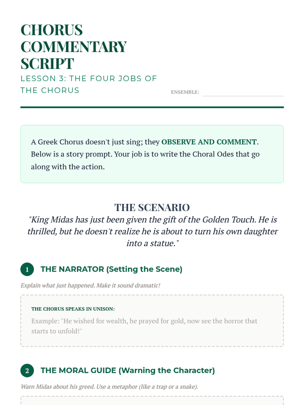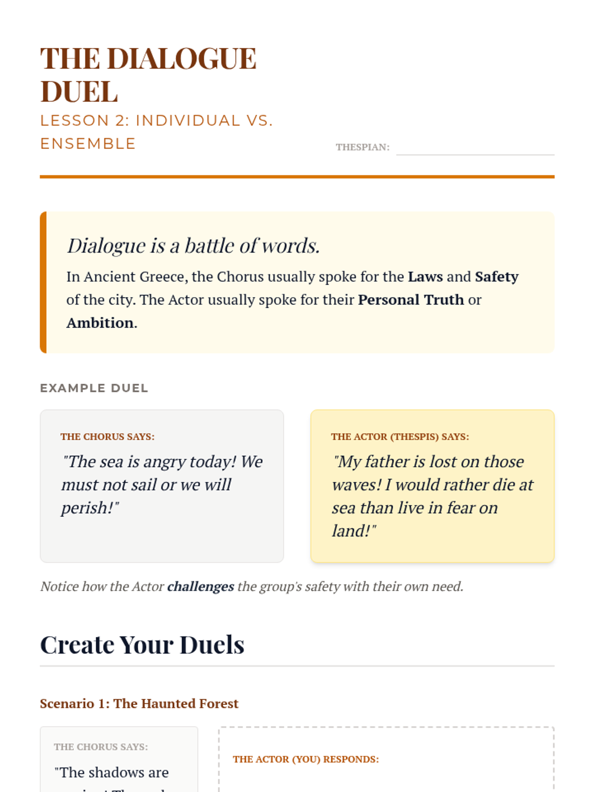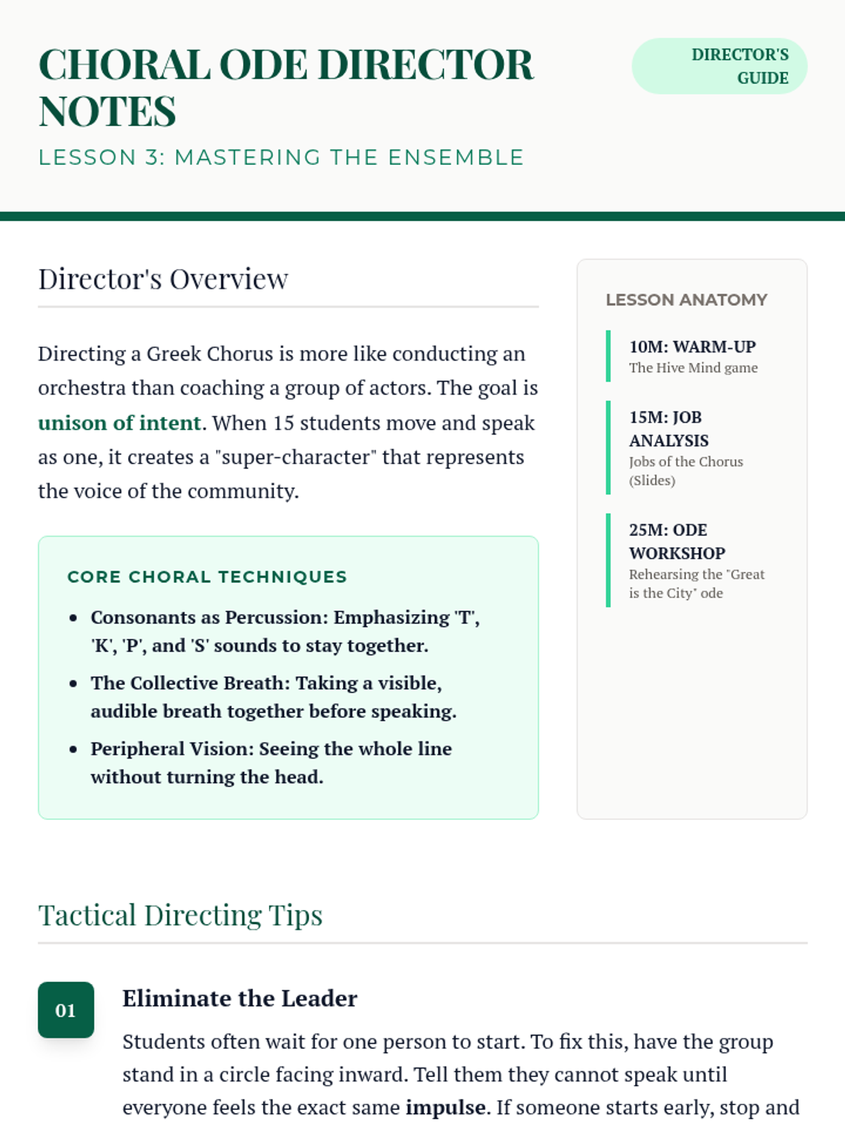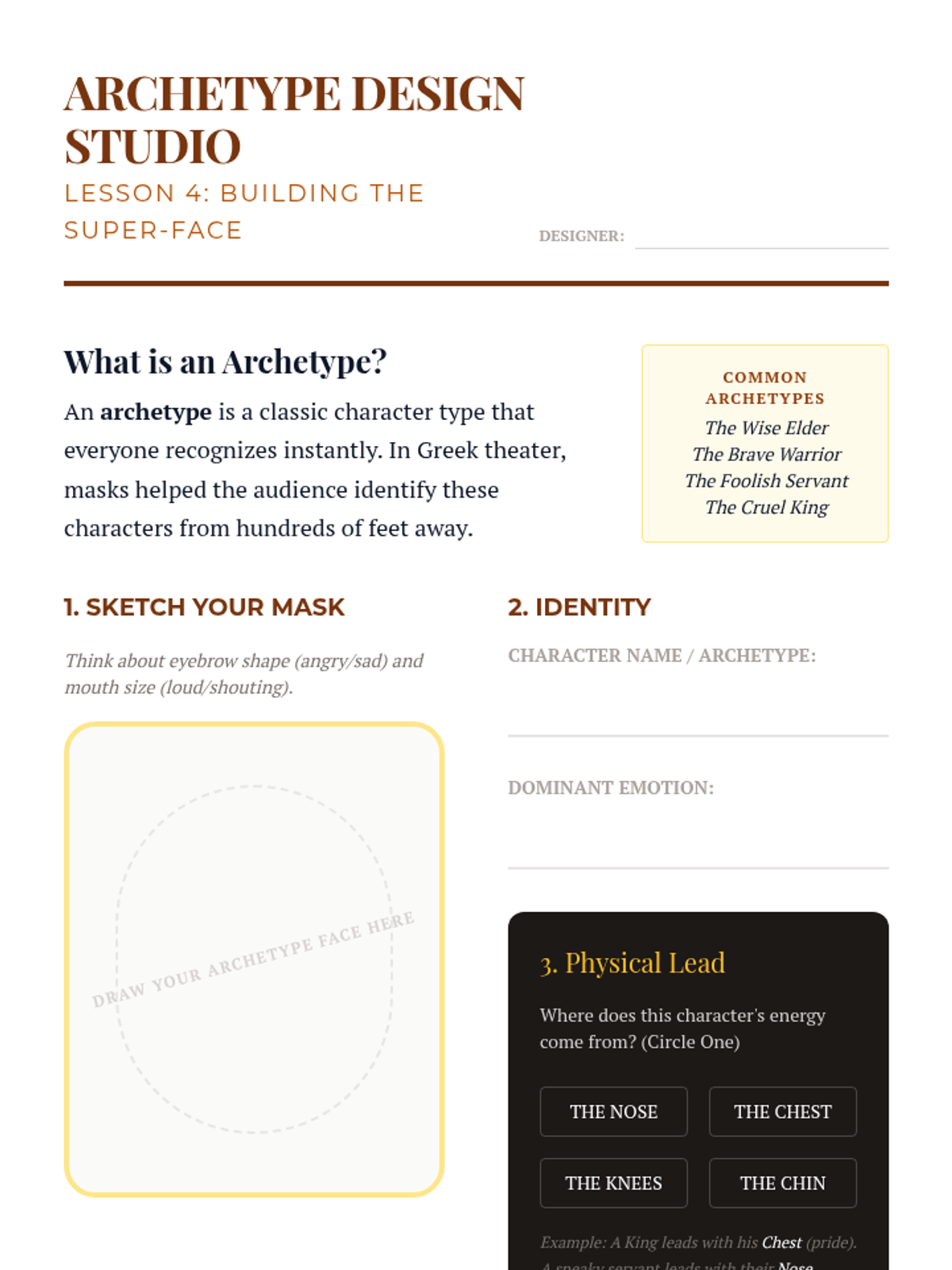 A 5-lesson unit for 6th-grade theater students exploring the ritual origins, physical conventions, and architectural innovations of Ancient Greek theater. Students learn how masks, the chorus, and amphitheaters shaped storytelling.