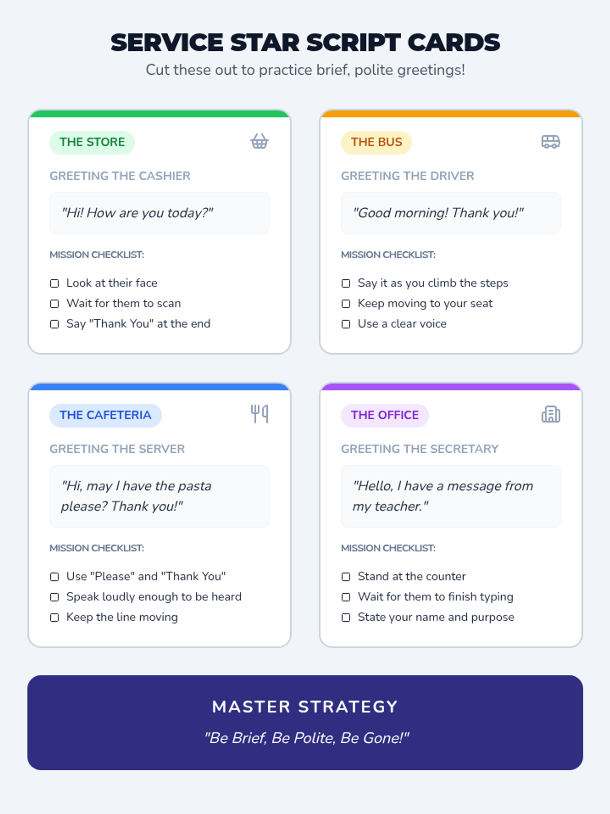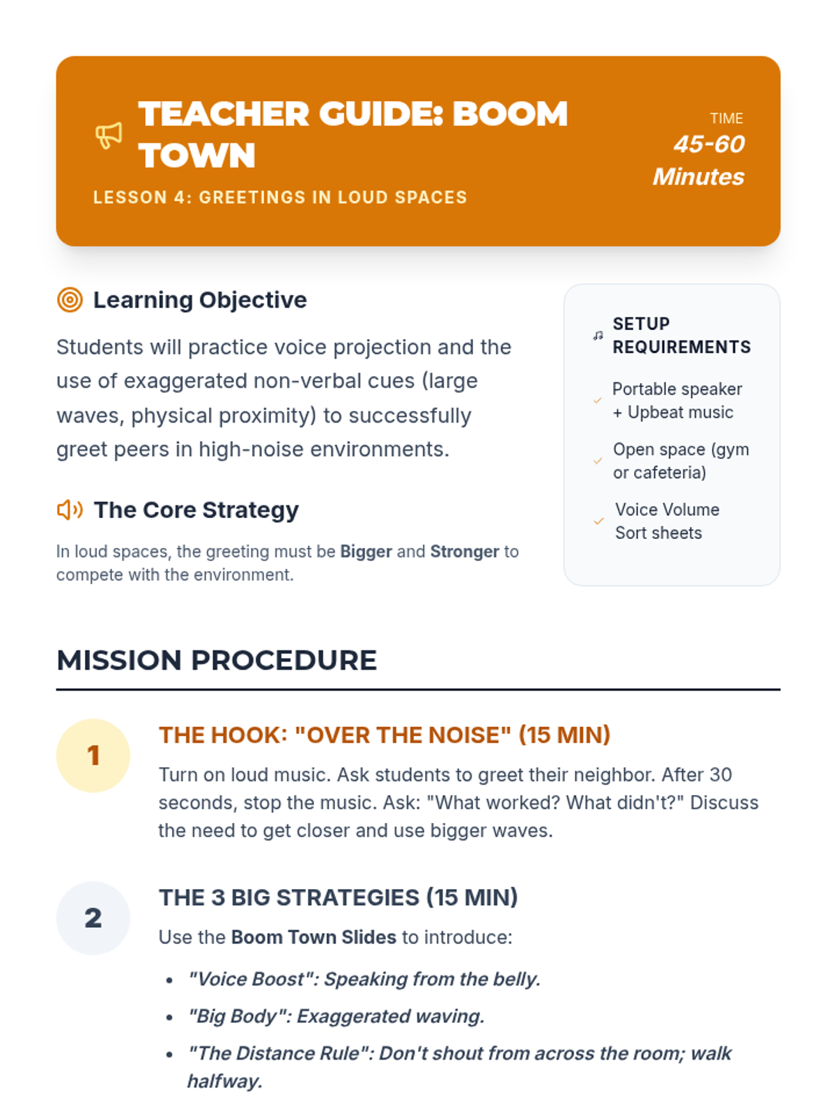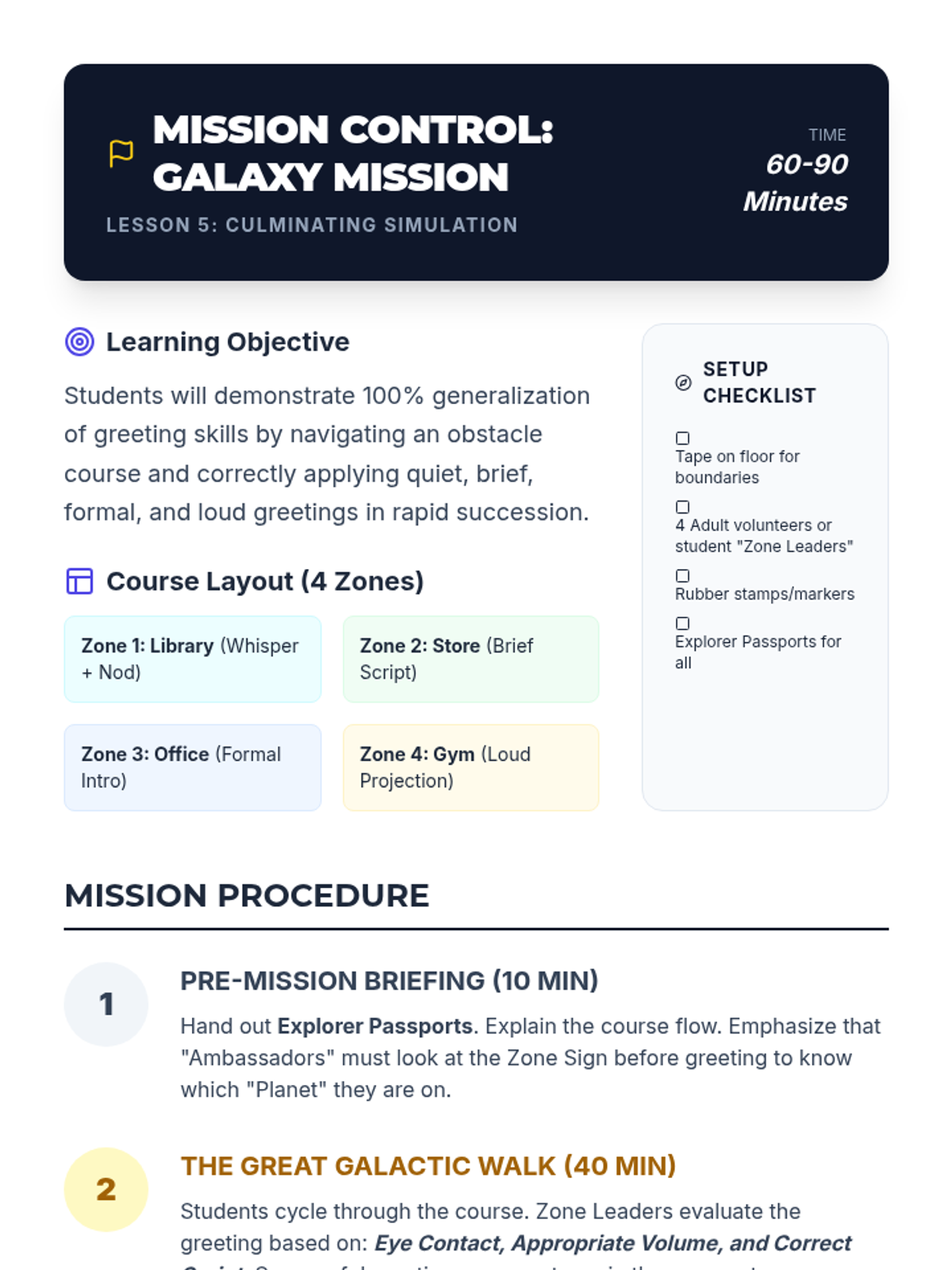 A simulation-based sequence where 3rd grade students practice context-appropriate greetings across different community environments, using a 'Space Explorer' theme to navigate 'Quiet Zones', 'Service Planets', and 'Loud Moons'.