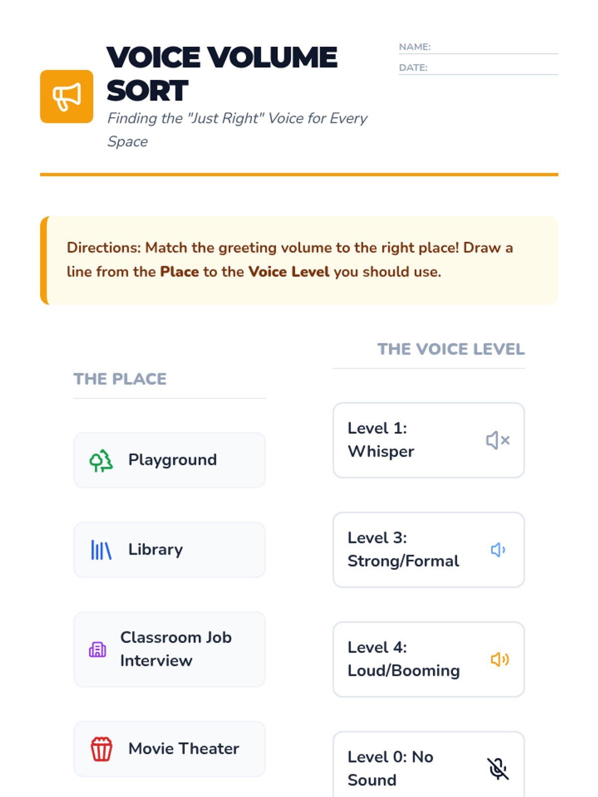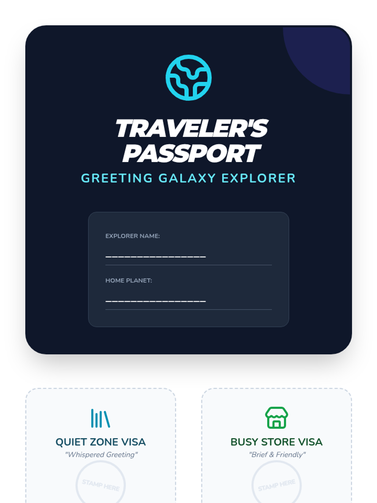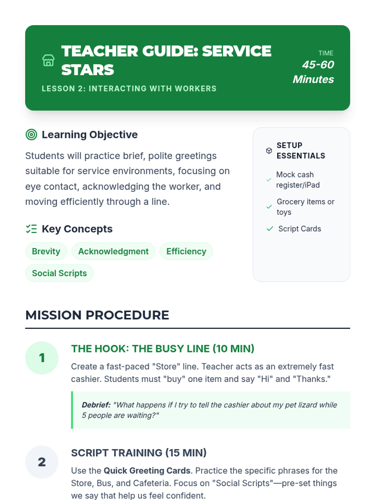 A simulation-based sequence where 3rd grade students practice context-appropriate greetings across different community environments, using a 'Space Explorer' theme to navigate 'Quiet Zones', 'Service Planets', and 'Loud Moons'.