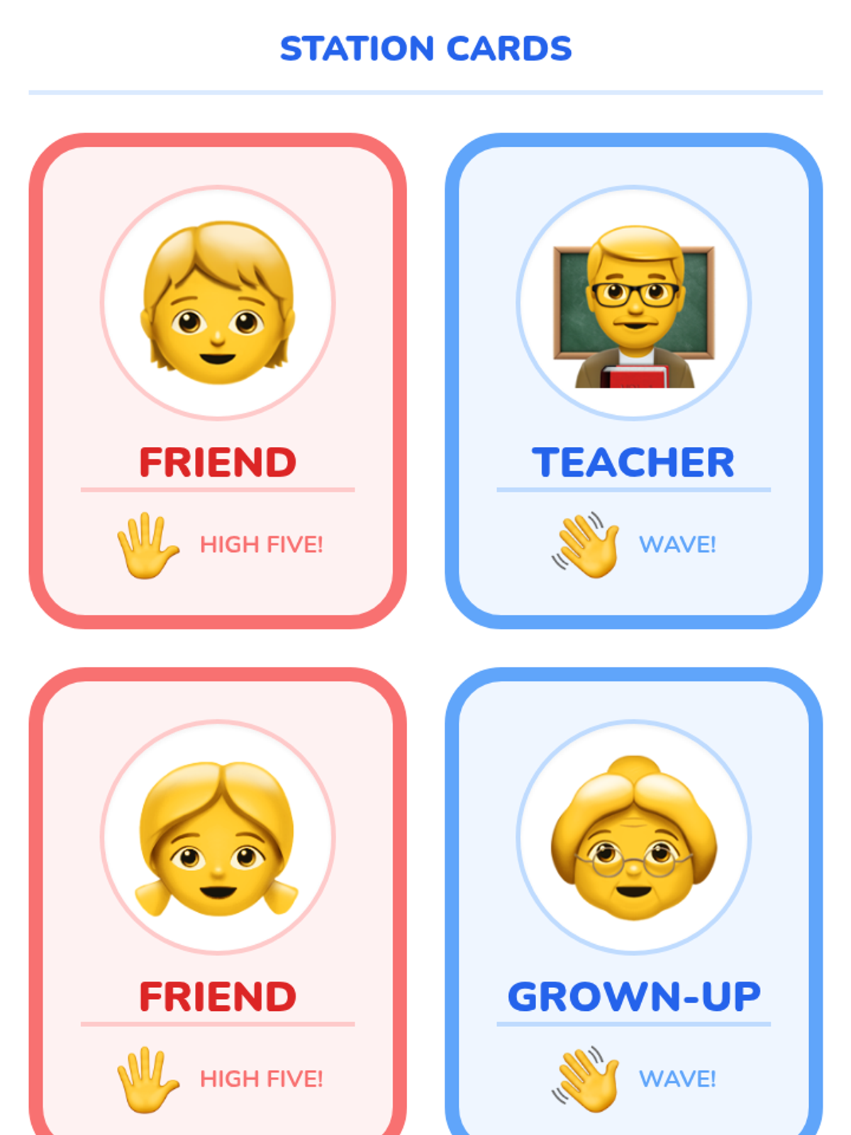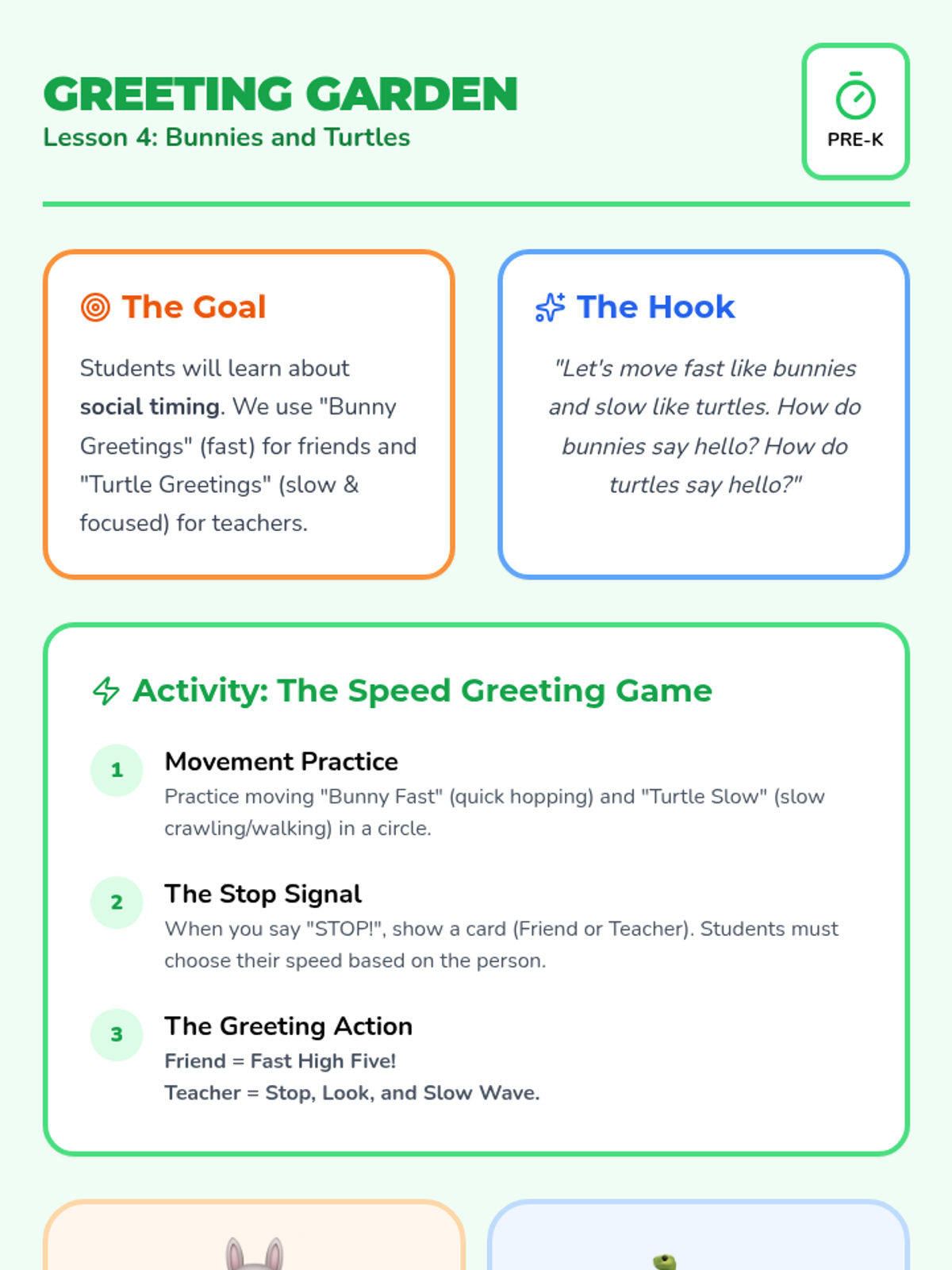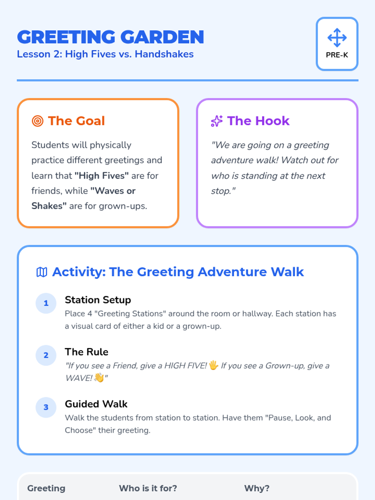 A game-based social communication sequence for Pre-K students to differentiate between greetings for peers (friends) and adults (teachers/parents). Through sorting, movement, and roleplay, students build the foundational skills needed for context-appropriate social interactions.