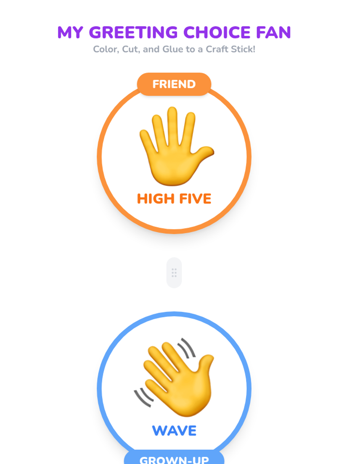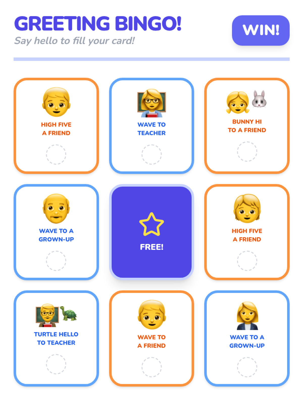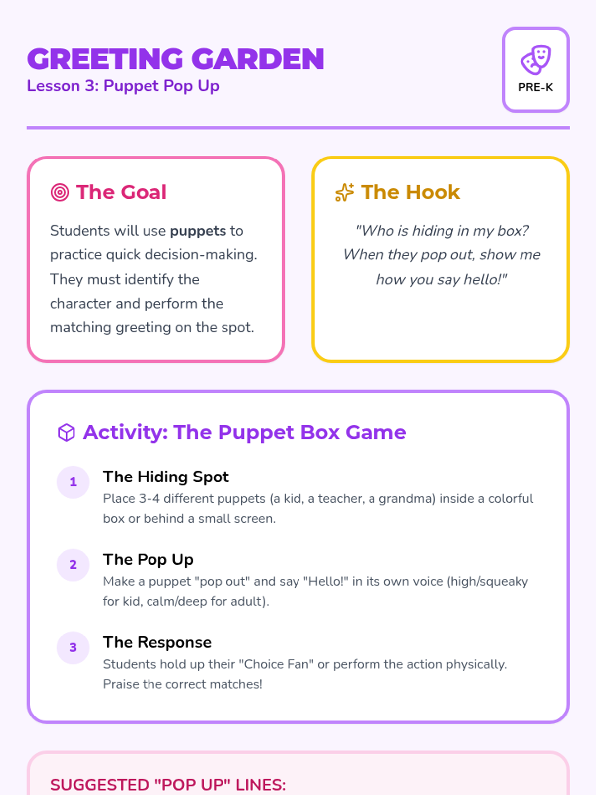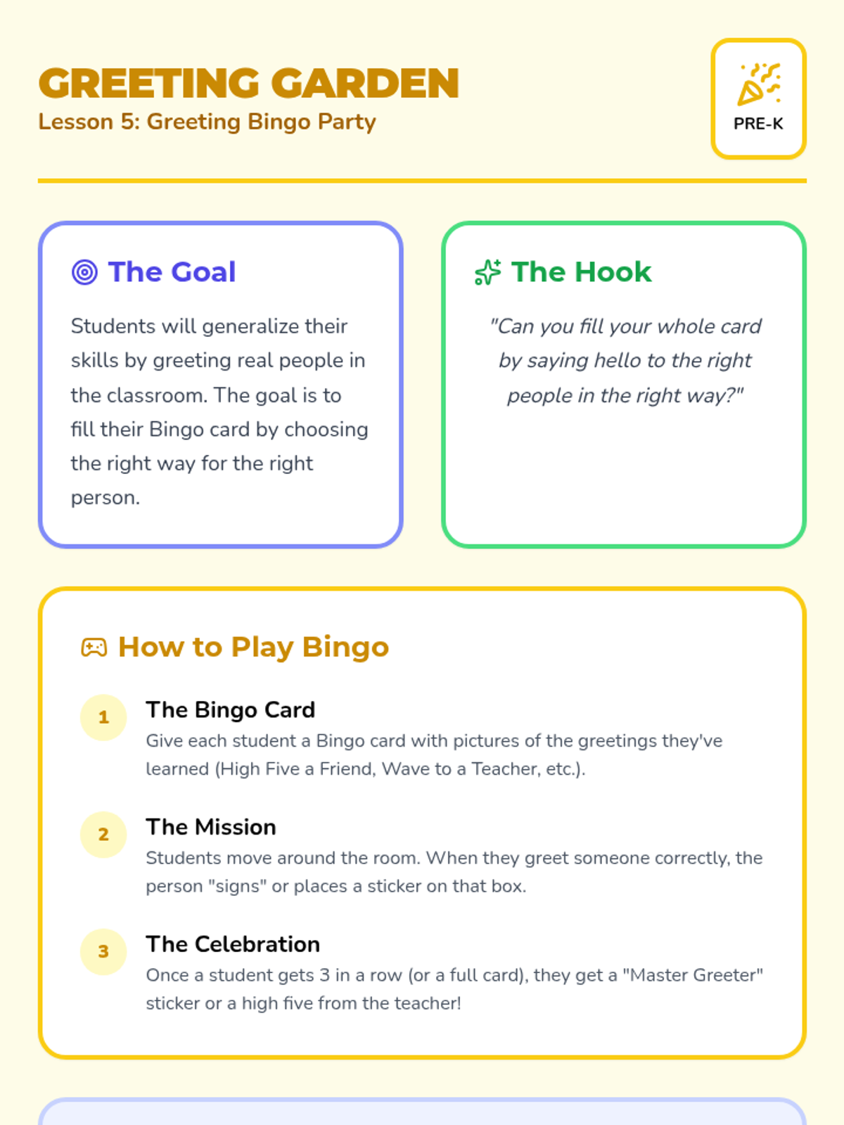 A game-based social communication sequence for Pre-K students to differentiate between greetings for peers (friends) and adults (teachers/parents). Through sorting, movement, and roleplay, students build the foundational skills needed for context-appropriate social interactions.