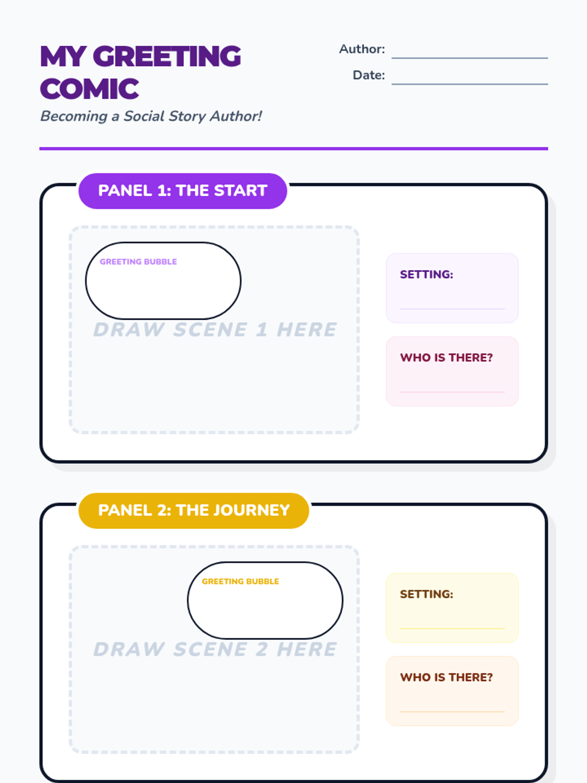Students become 'Social Story' authors, creating a comic strip that demonstrates context-appropriate greetings across different daily settings. This project-based sequence emphasizes narrative comprehension, sequencing, dialogue choice, and non-verbal communication cues.