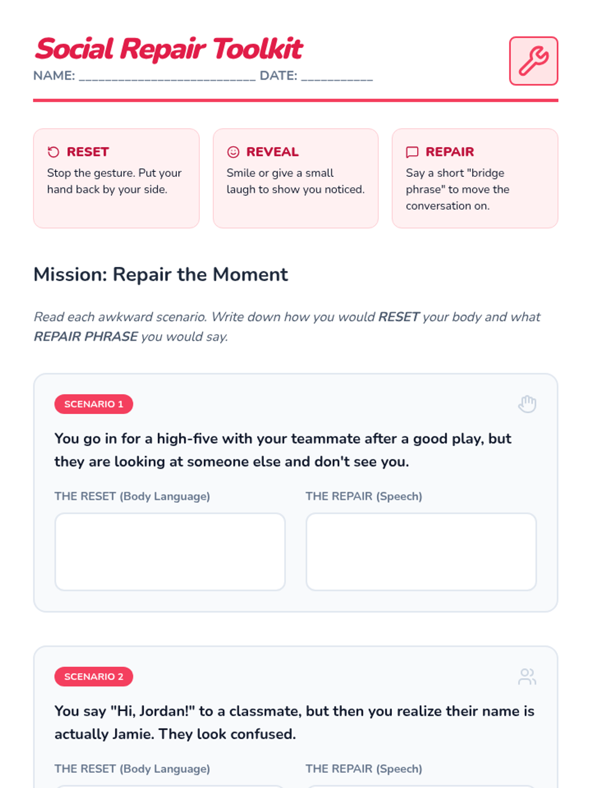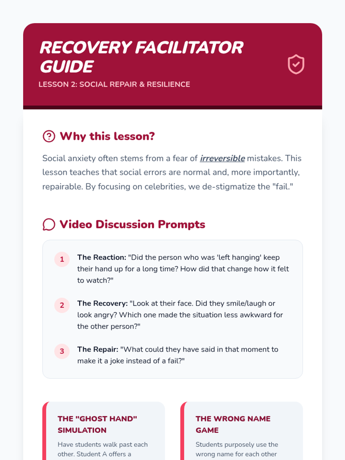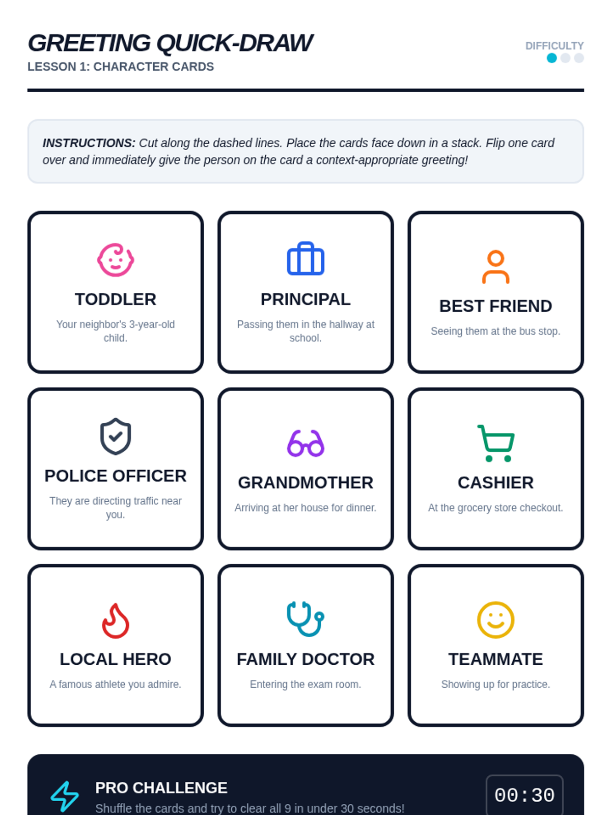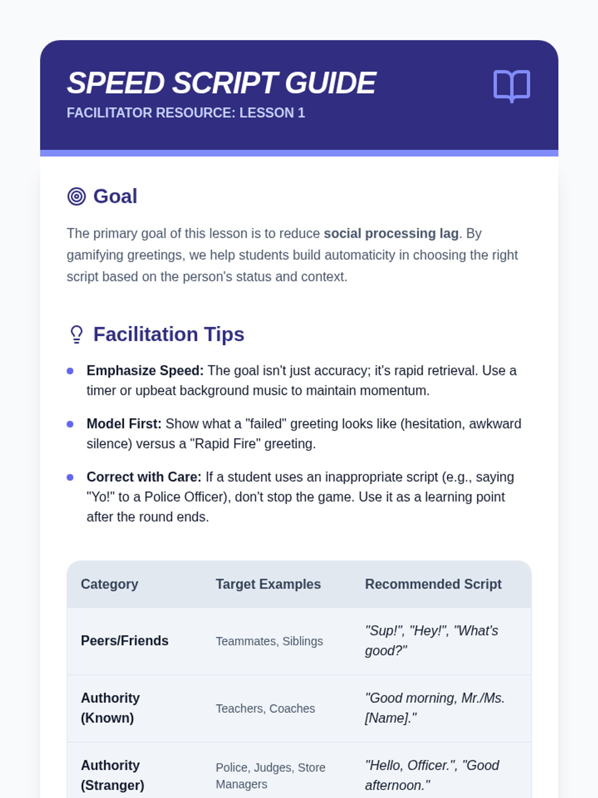 A game-based sequence designed for 9th-grade social communication students to master the art of quick, context-appropriate greetings and social recovery. Through fast-paced activities and simulations, students build resilience and adaptability in various social scenarios.