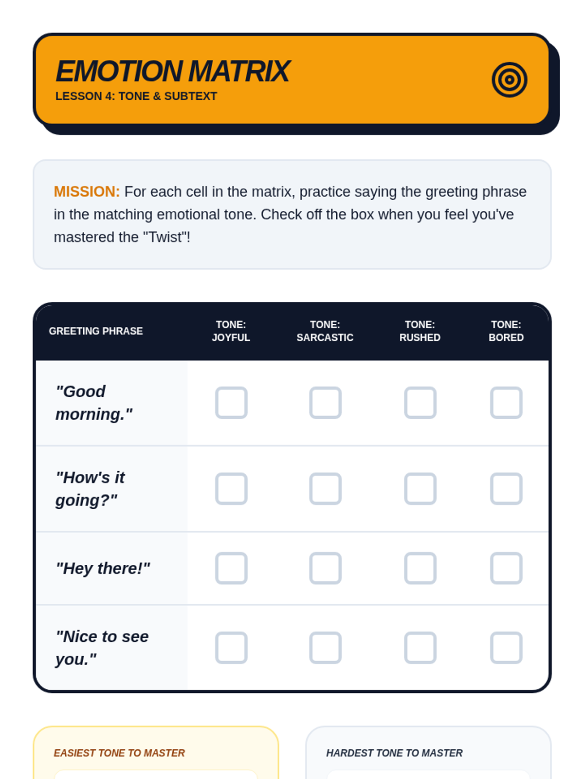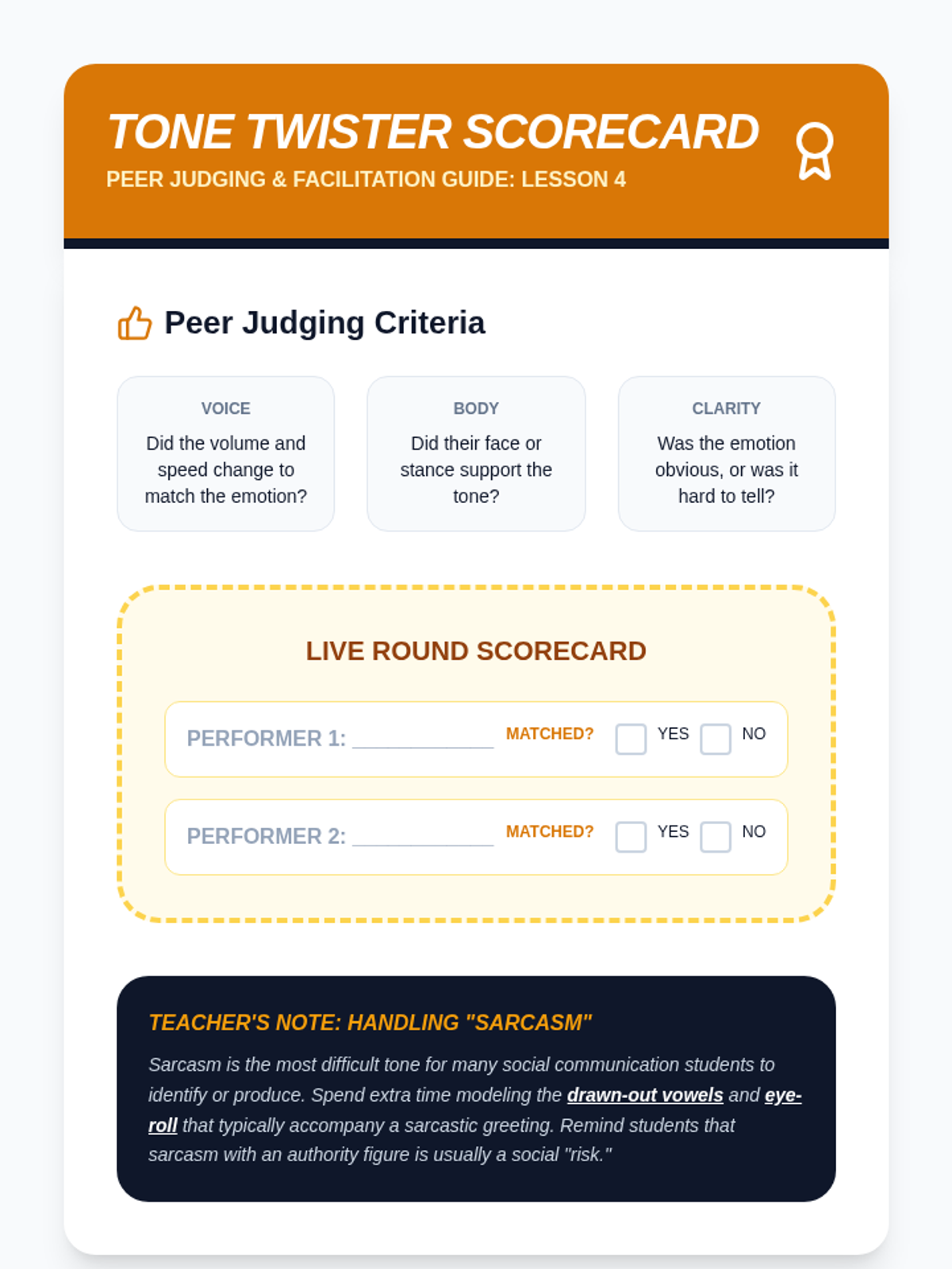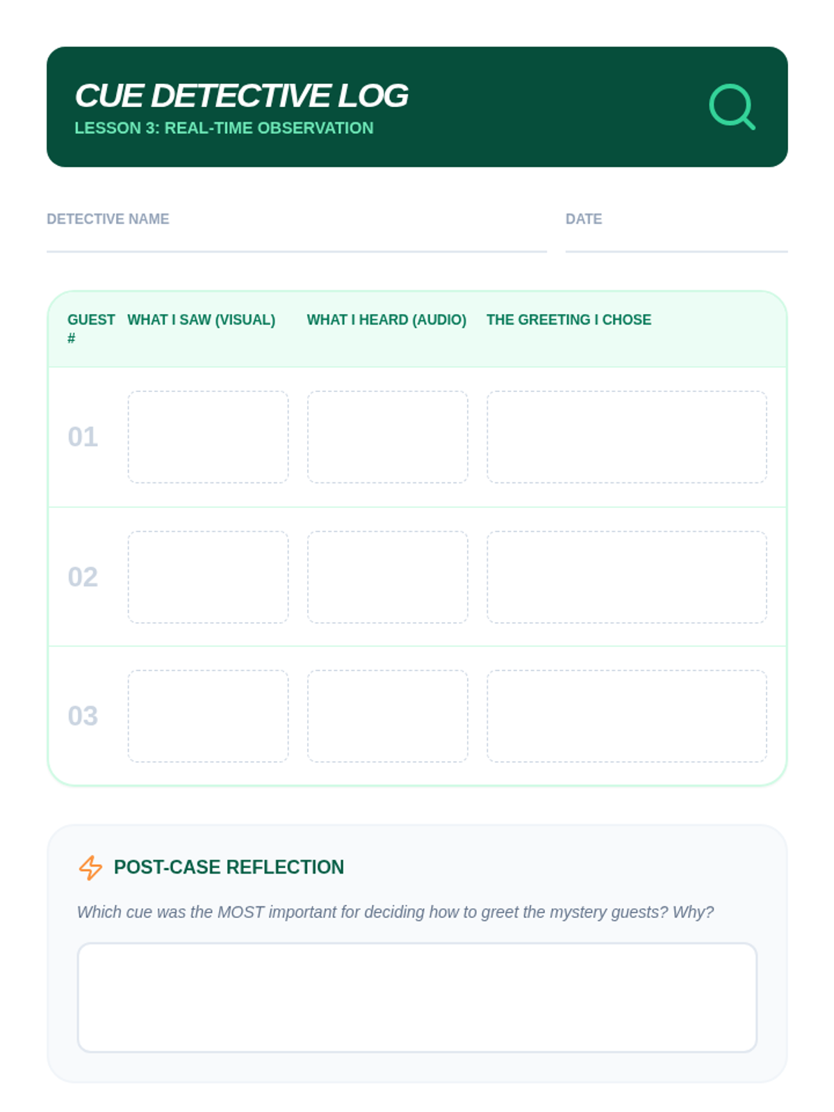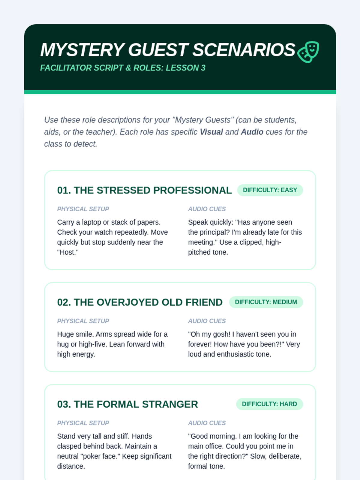 A game-based sequence designed for 9th-grade social communication students to master the art of quick, context-appropriate greetings and social recovery. Through fast-paced activities and simulations, students build resilience and adaptability in various social scenarios.