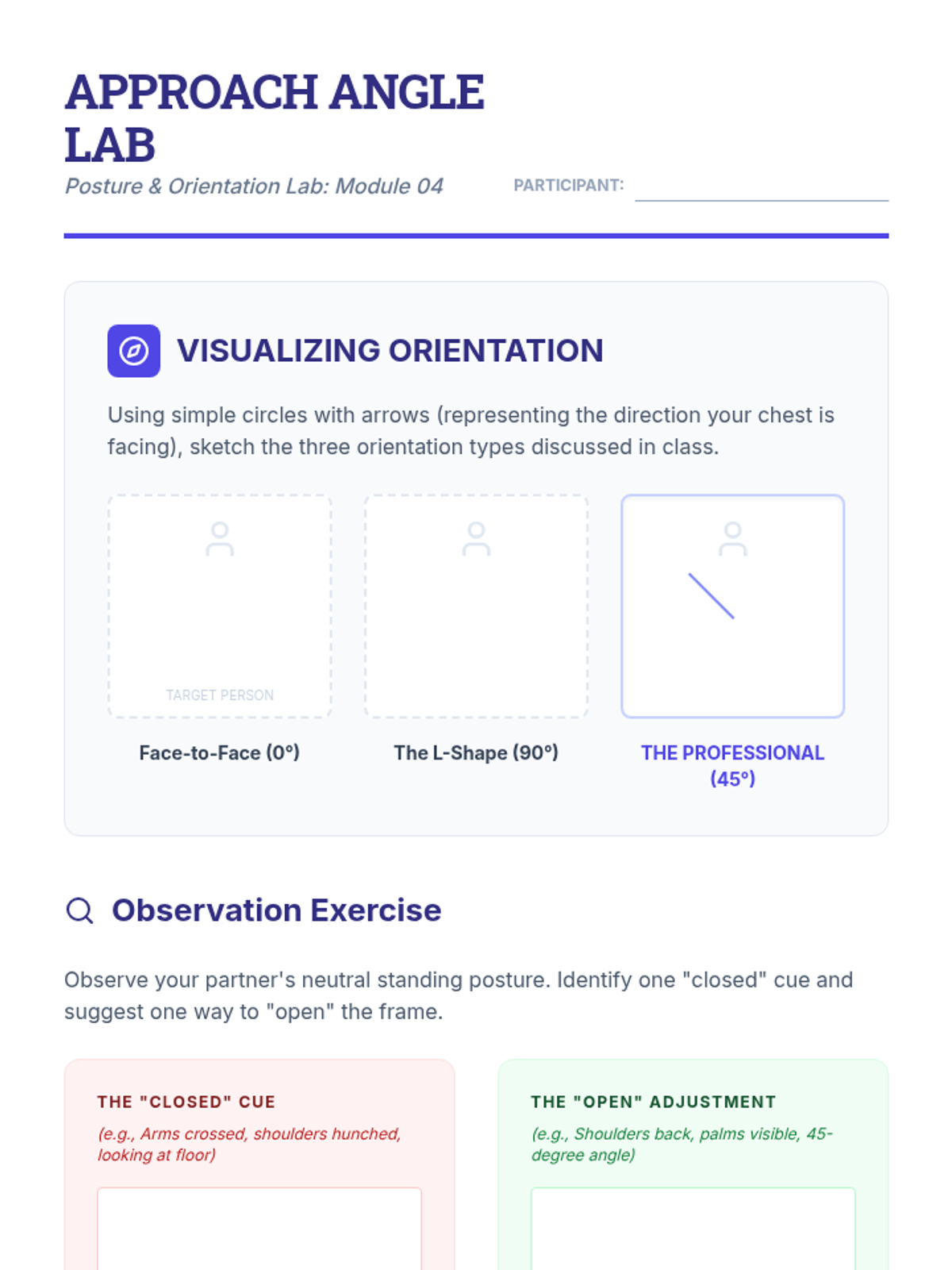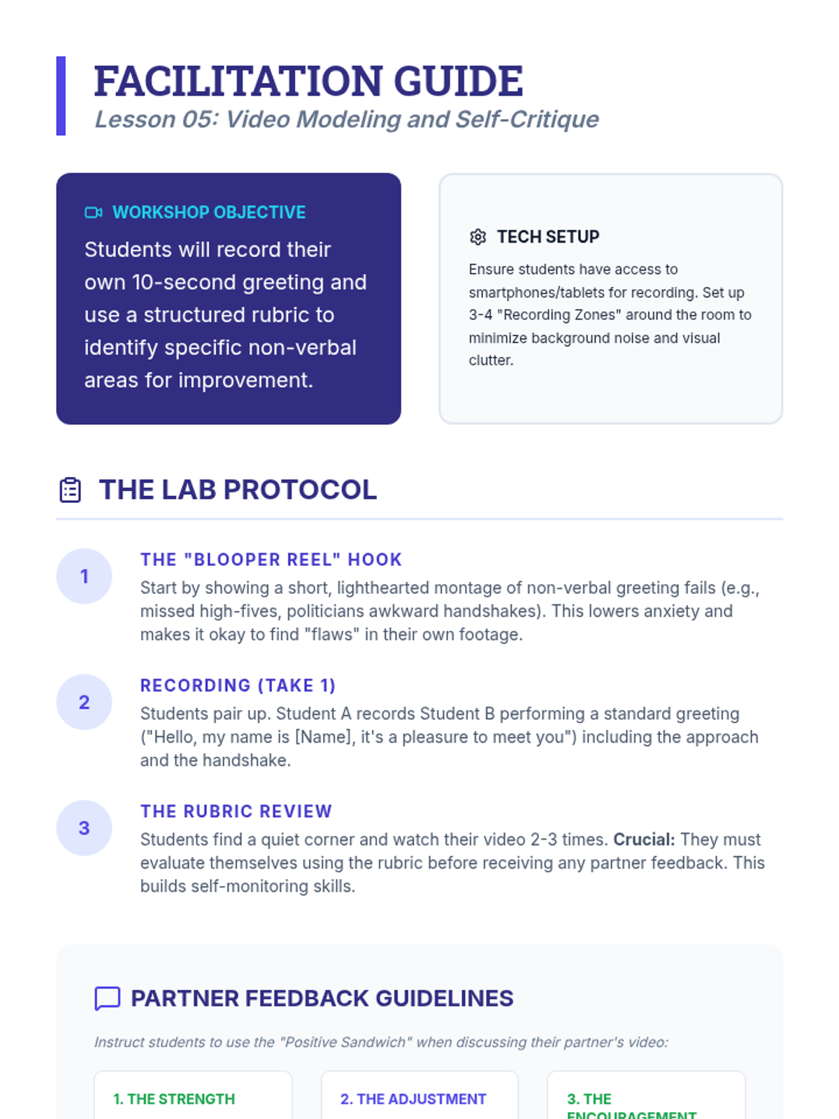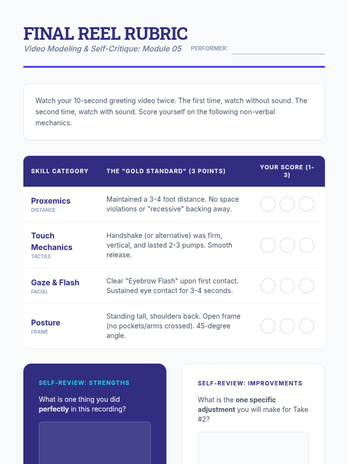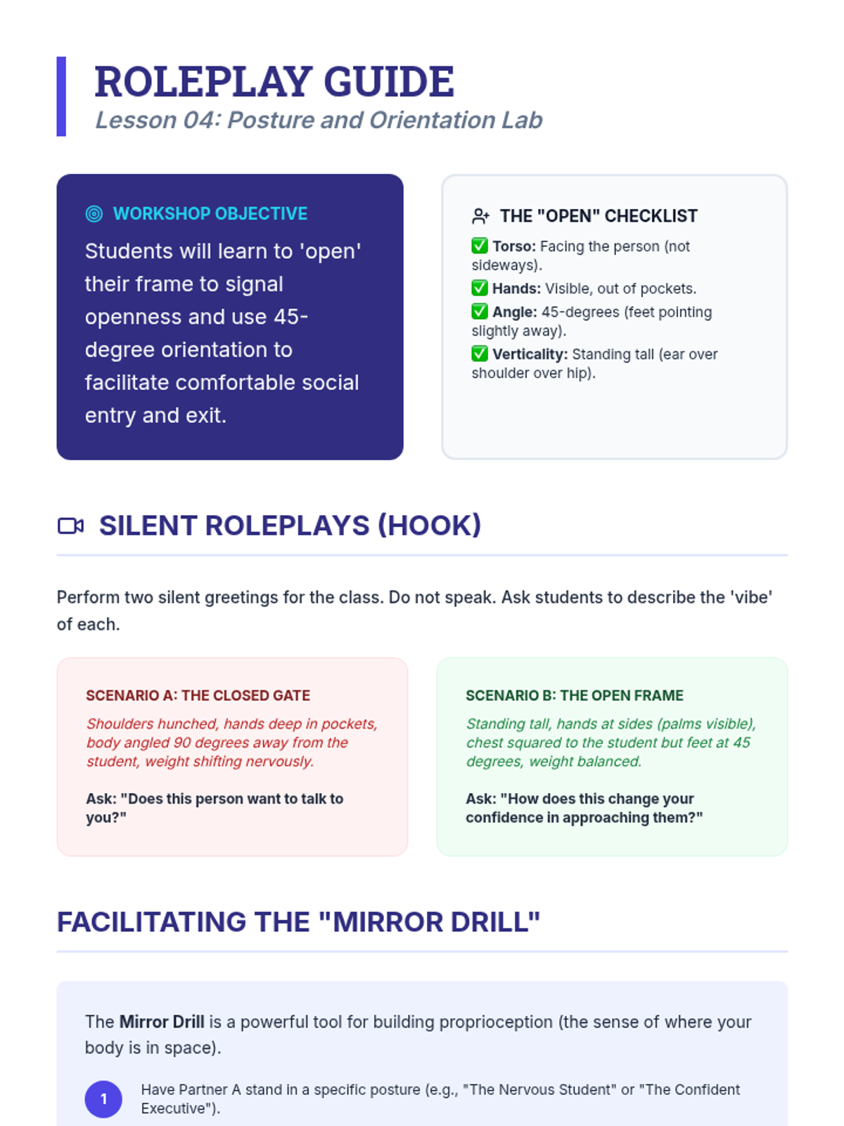 A comprehensive workshop-style sequence for undergraduate students focusing on the non-verbal mechanics of greetings. This unit covers proxemics, tactile interaction, eye contact, and postural orientation through simulations and video feedback.
