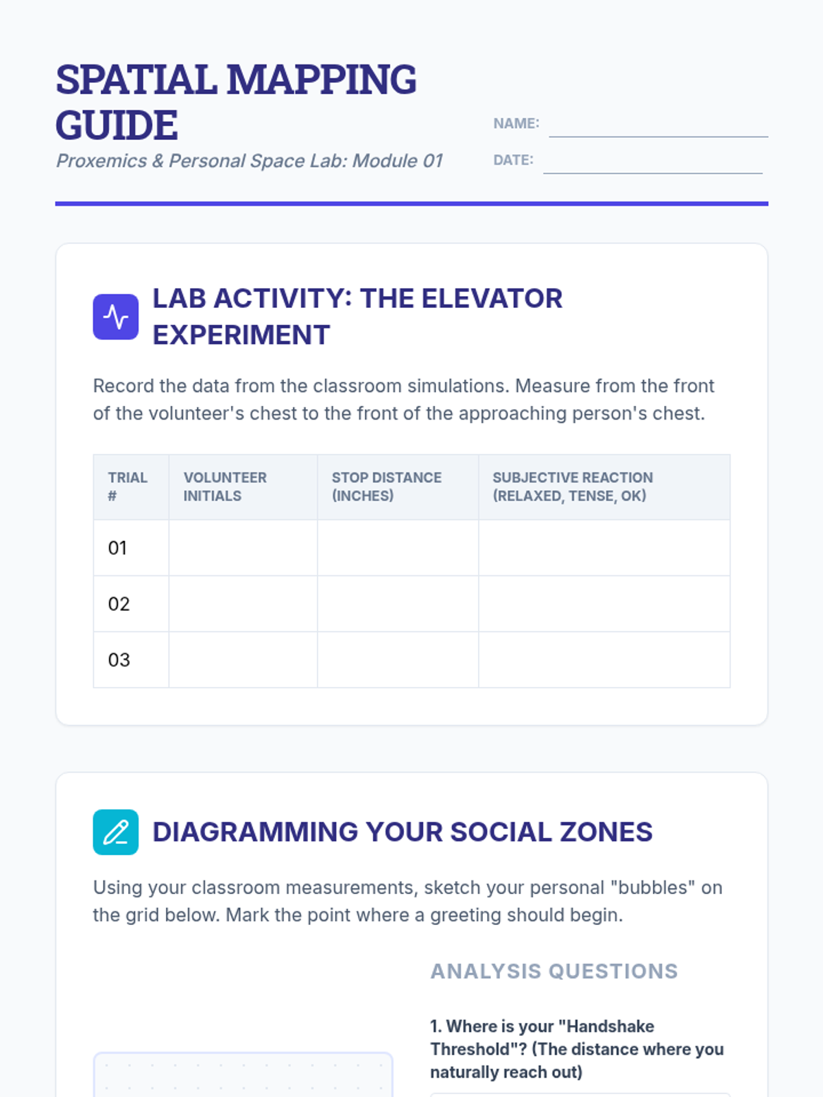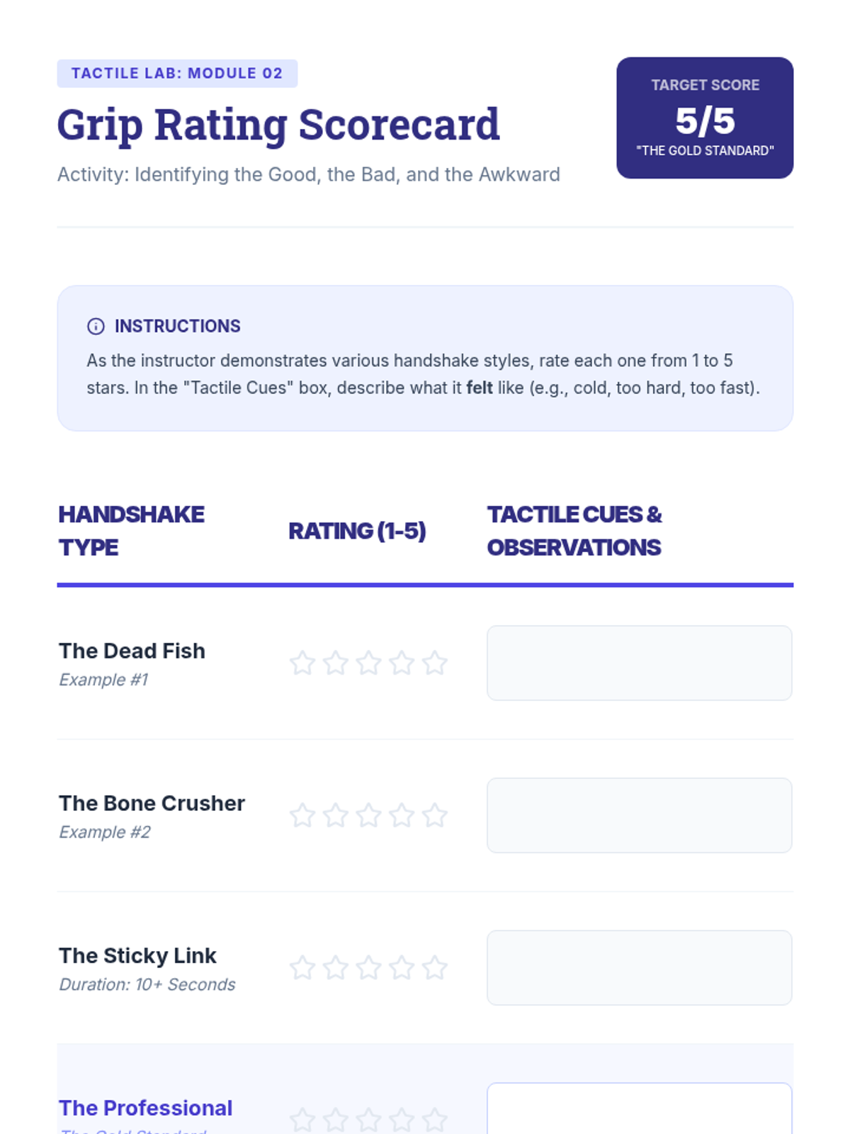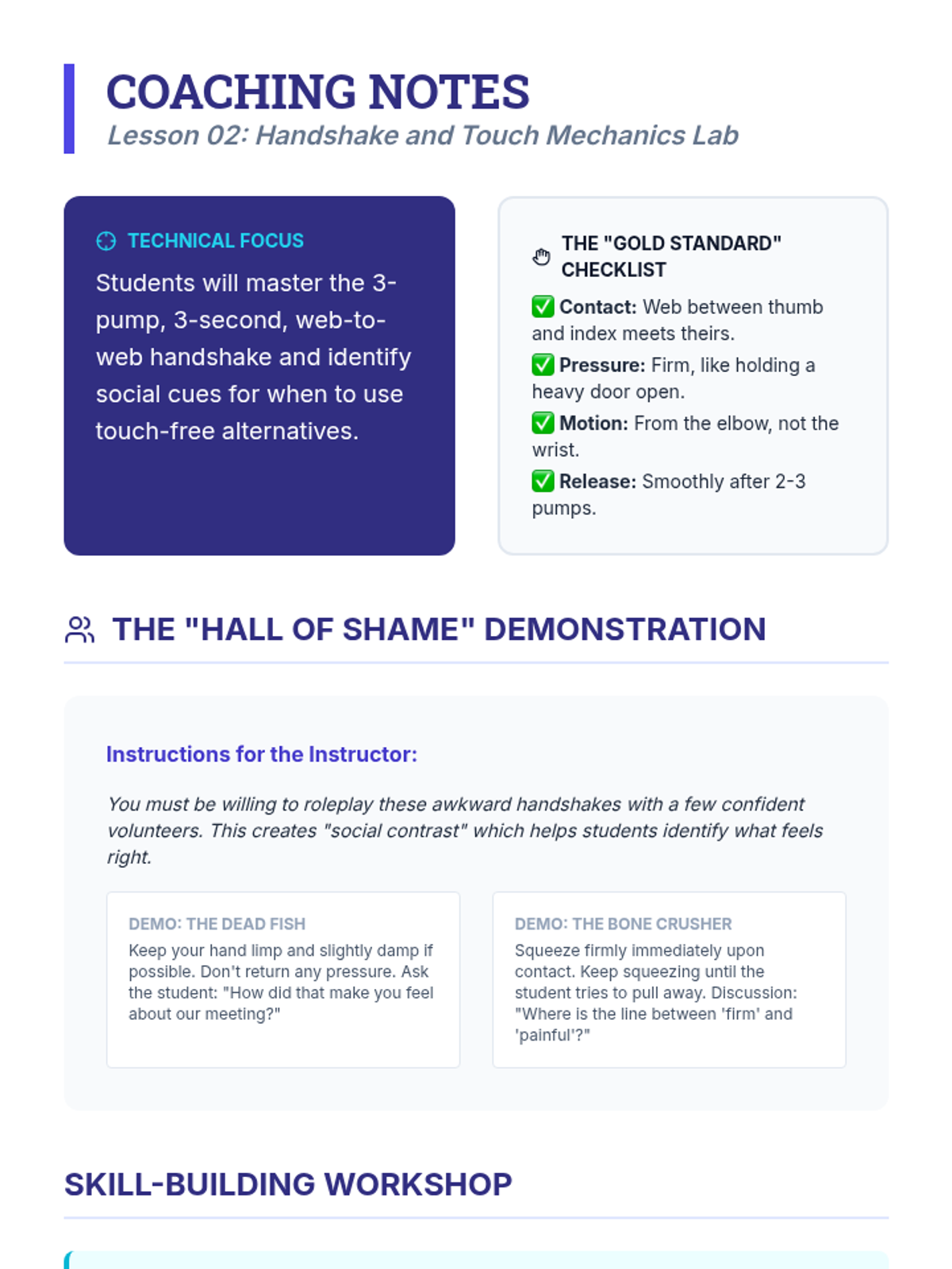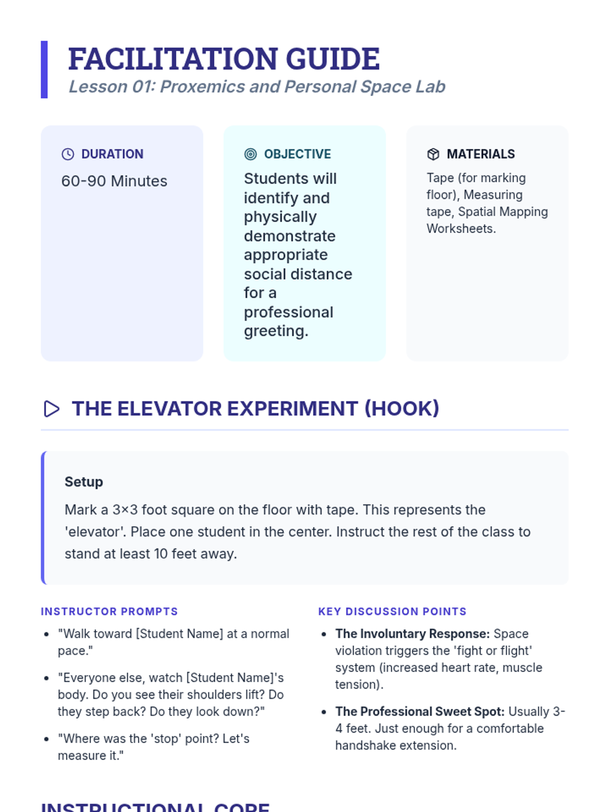 A comprehensive workshop-style sequence for undergraduate students focusing on the non-verbal mechanics of greetings. This unit covers proxemics, tactile interaction, eye contact, and postural orientation through simulations and video feedback.