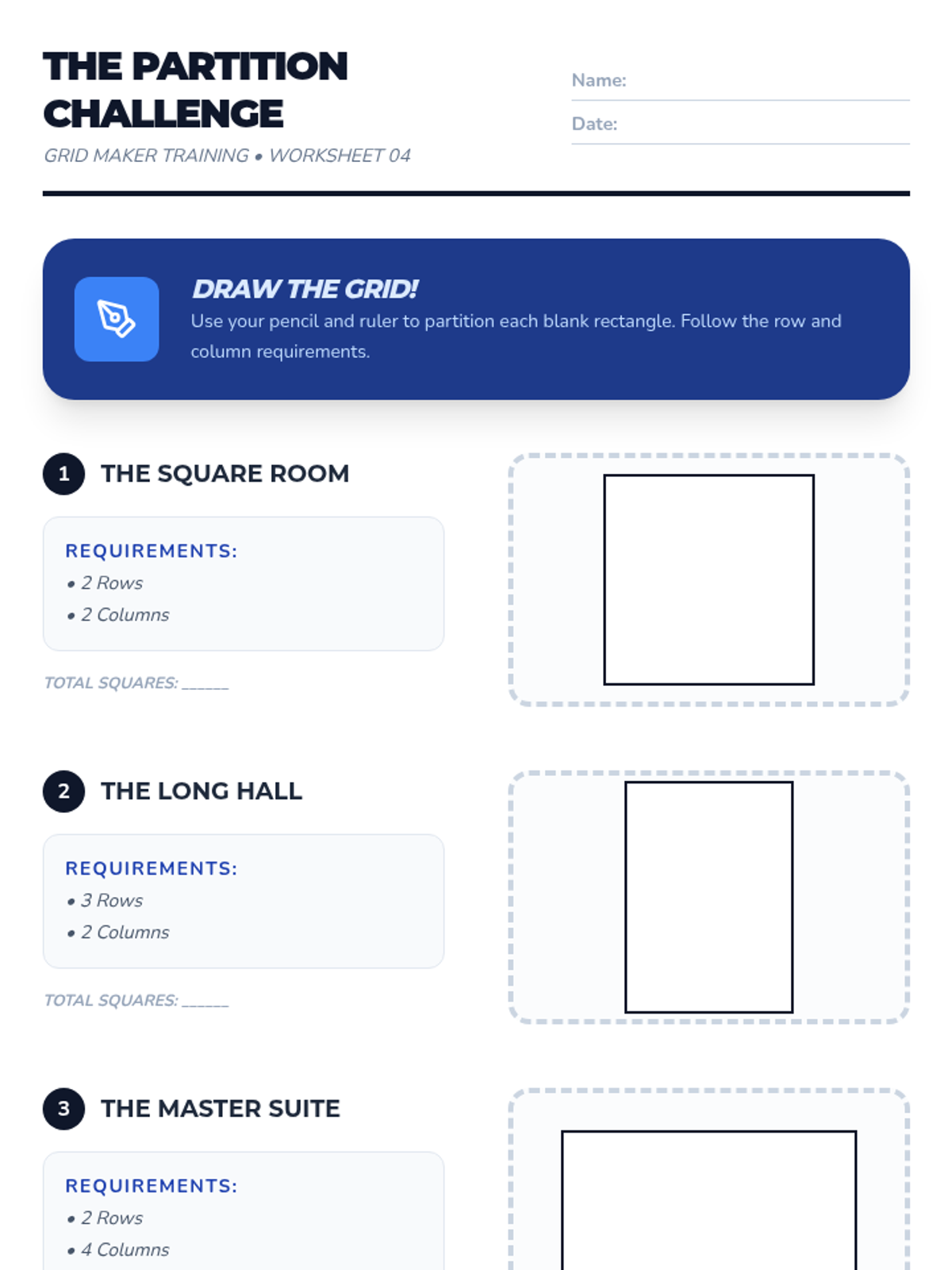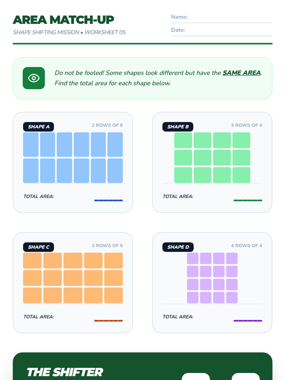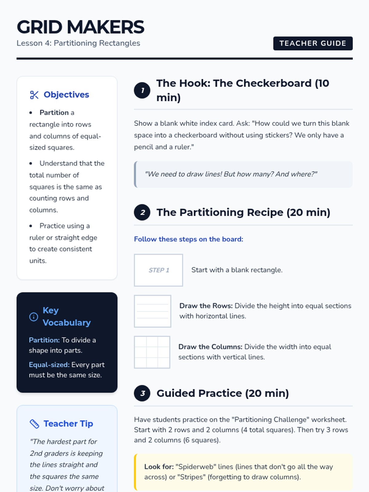 A 2nd-grade sequence exploring the relationship between geometry and arithmetic through area models. Students learn to tile rectangles, count units efficiently, partition shapes, and understand that different dimensions can yield the same area.