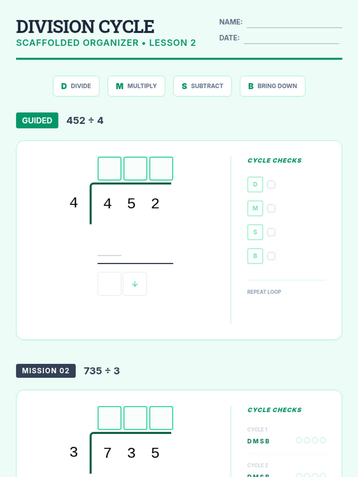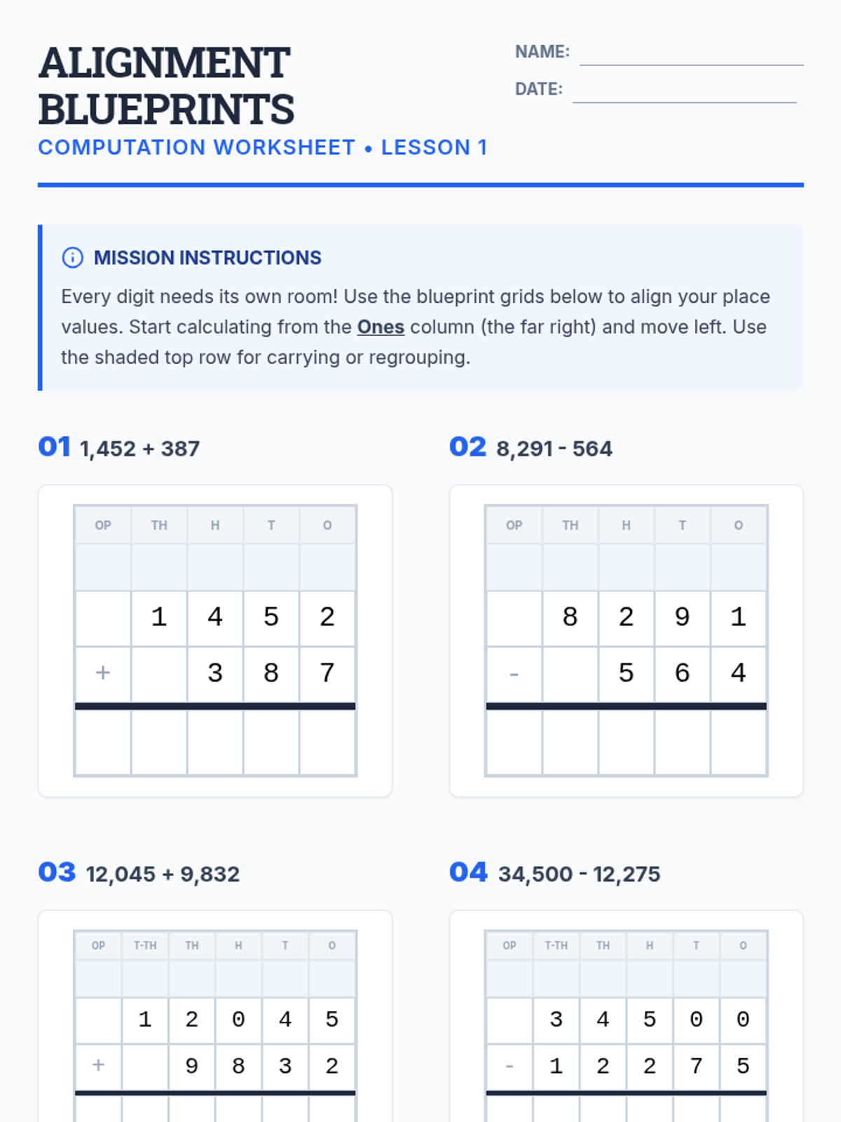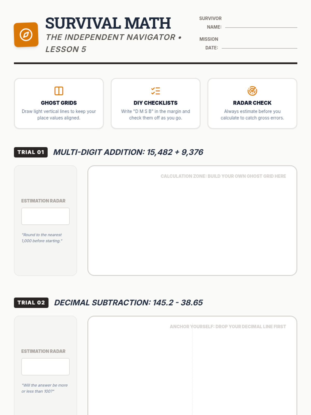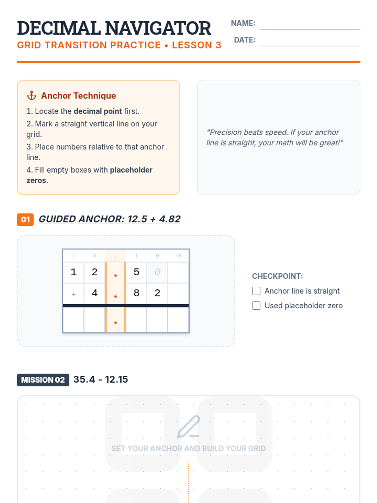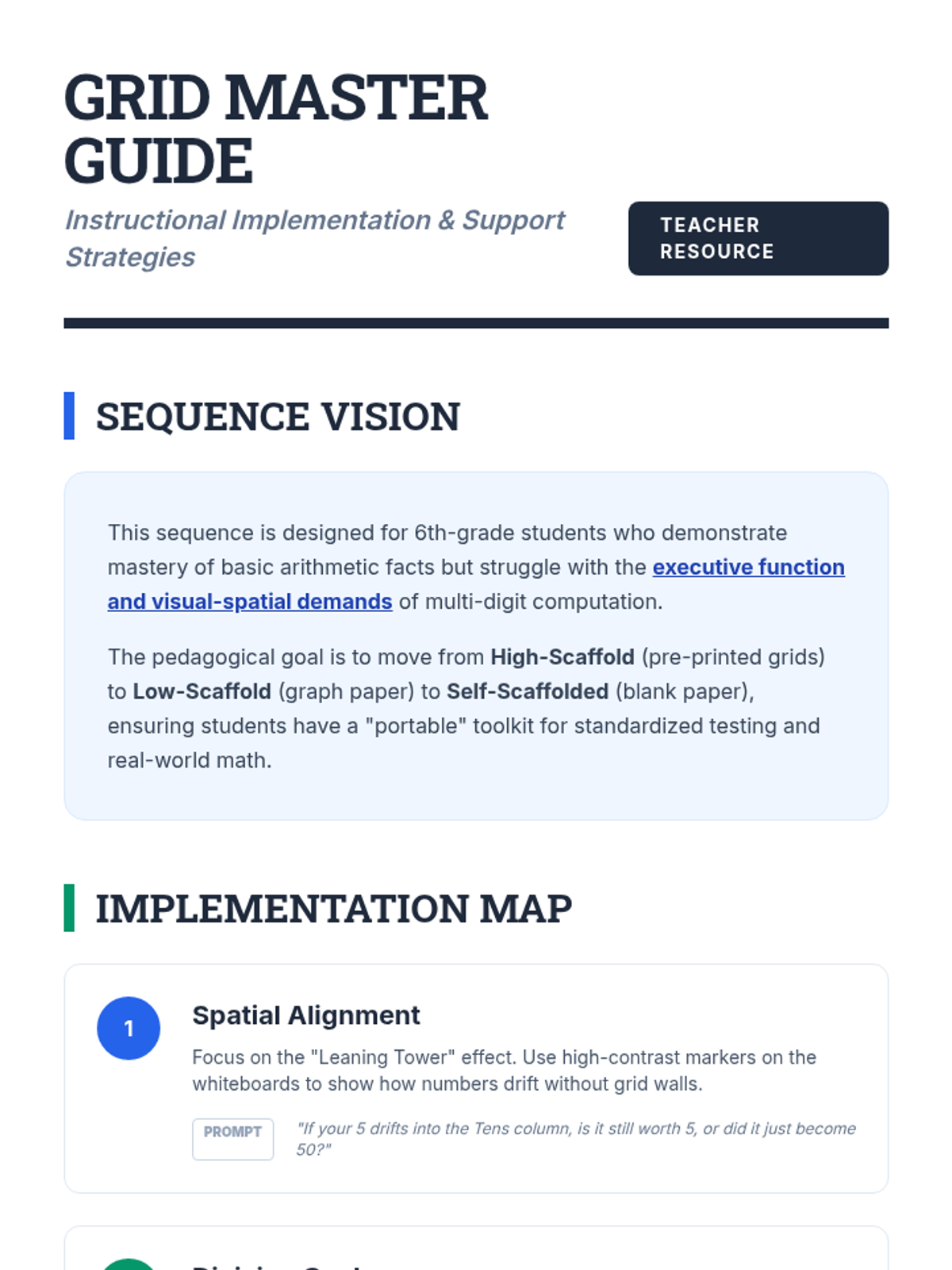 A specialized sequence for 6th-grade students focused on using graphic organizers and grid systems to support multi-digit arithmetic and decimal operations, specifically addressing spatial organization and executive function challenges.
