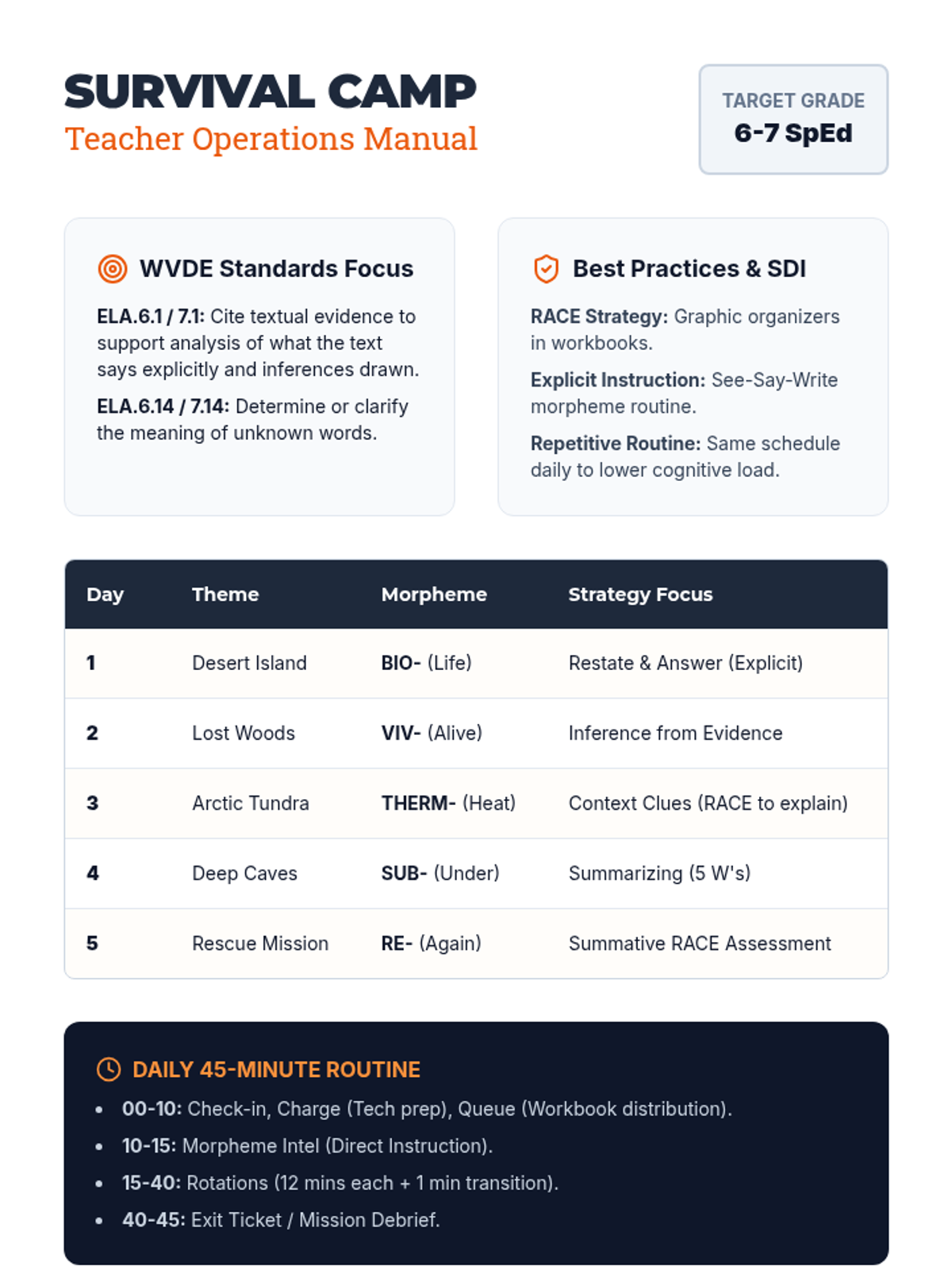 A 5-day ELA test prep intensive for 6th-7th grade special education students, themed around outdoor survival. This sequence focuses on WVDE ELA standards for citing textual evidence using the RACE strategy and daily morpheme work.