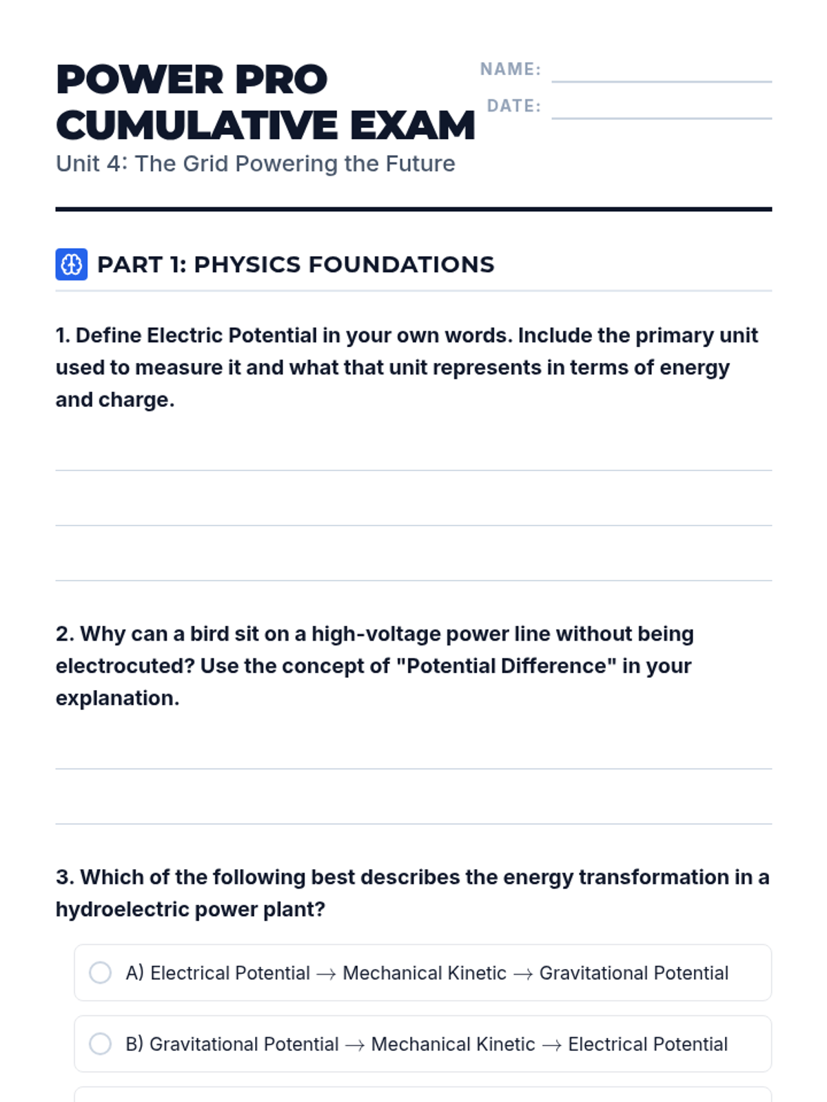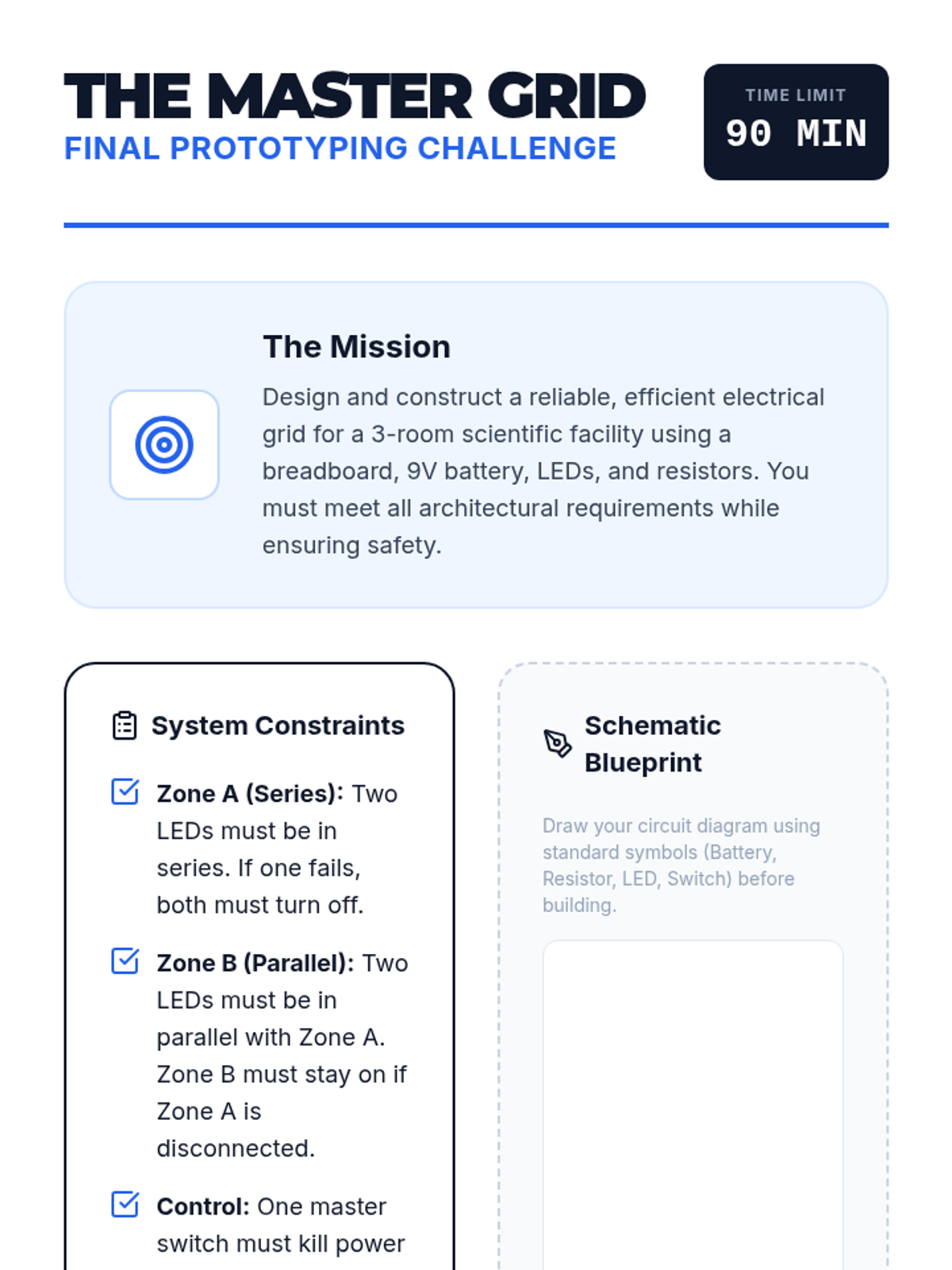 A comprehensive 2-week unit on electricity and circuits, covering electric potential, power generation, Ohm's law, and circuit analysis. Students move from the fundamental physics of voltage to the design of complex grid systems.