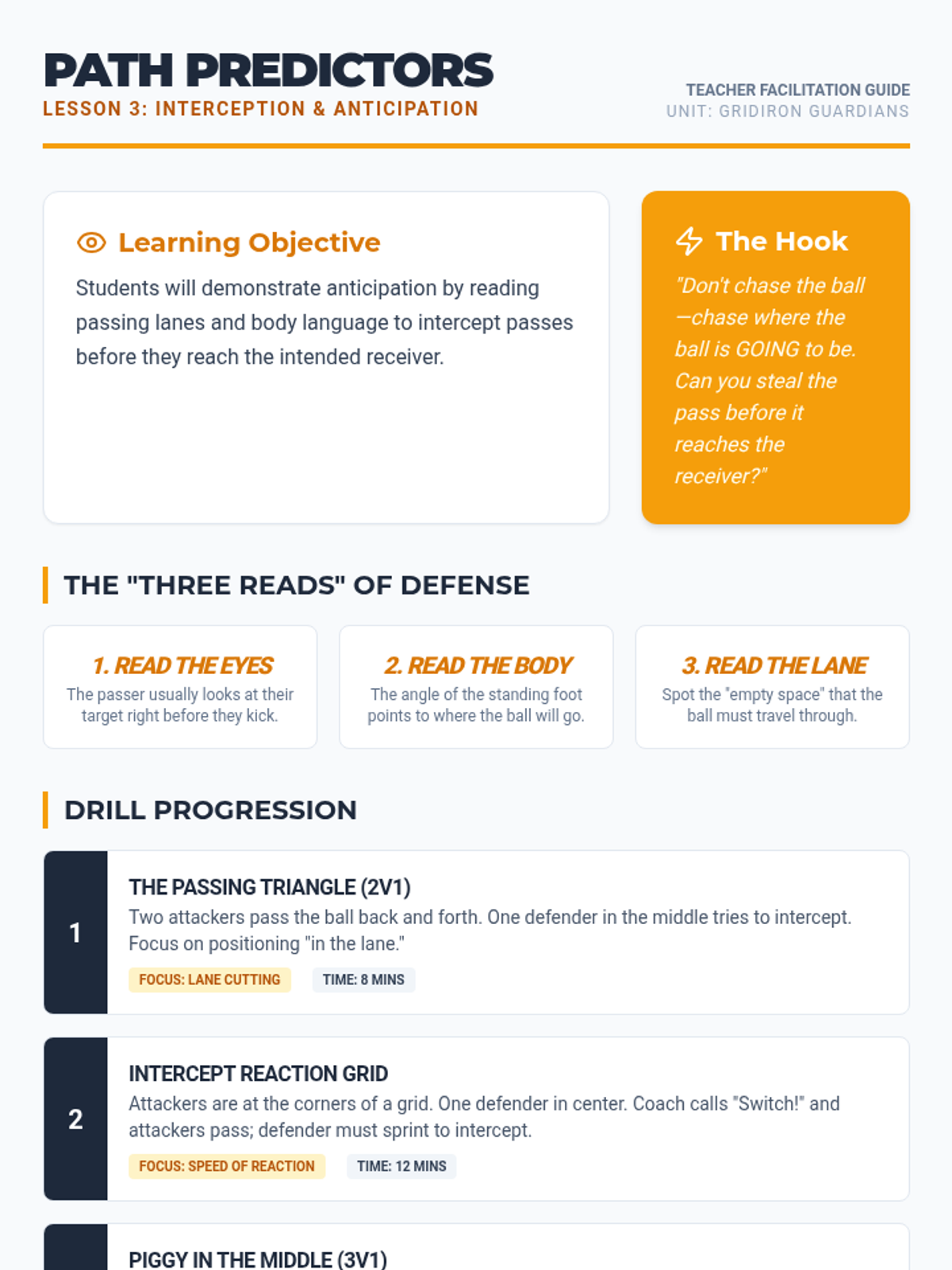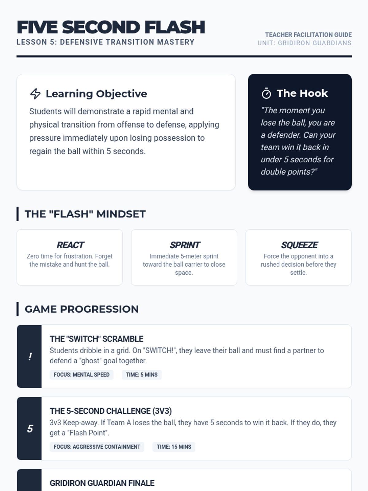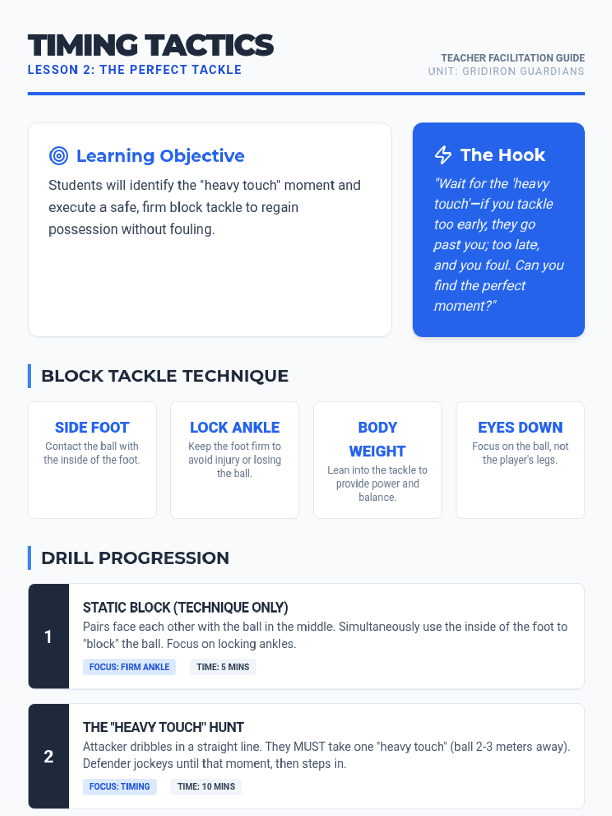 A comprehensive 5th-grade unit on defensive football skills, focusing on stance, timing, interception, and team coordination to regain possession cleanly and intelligently.
