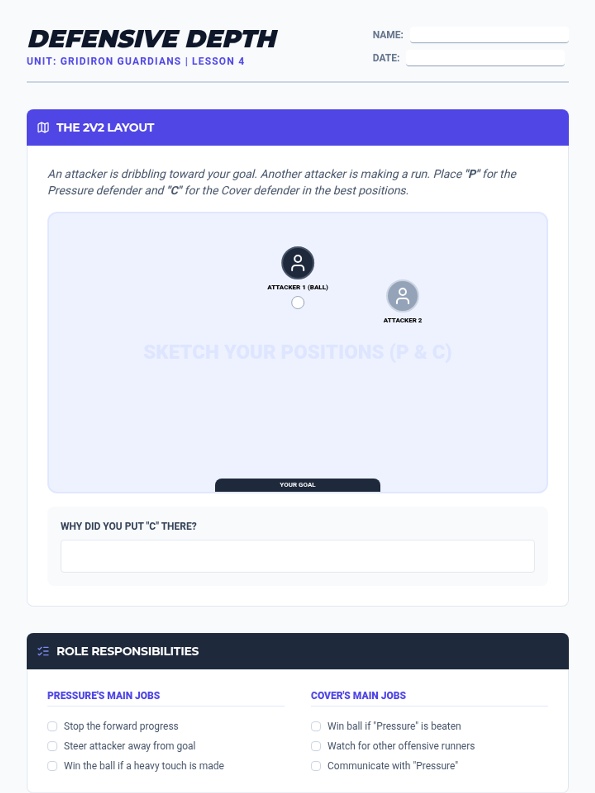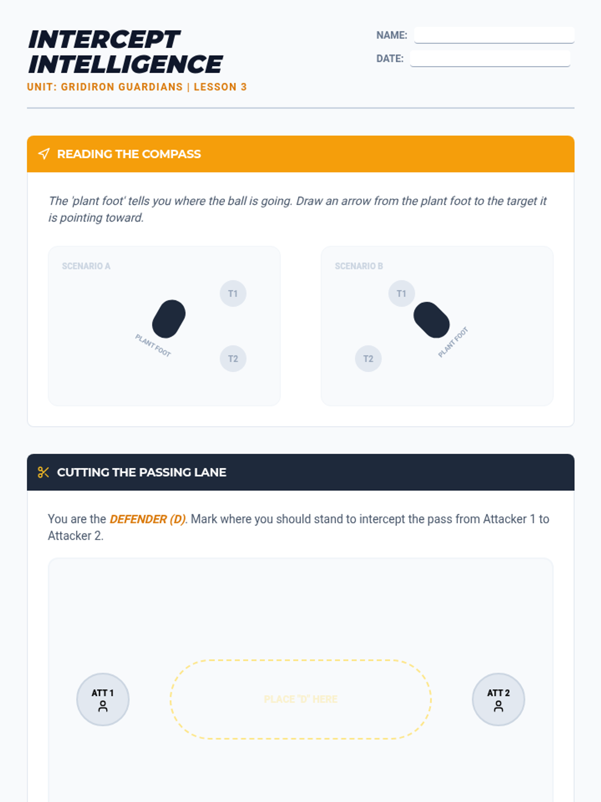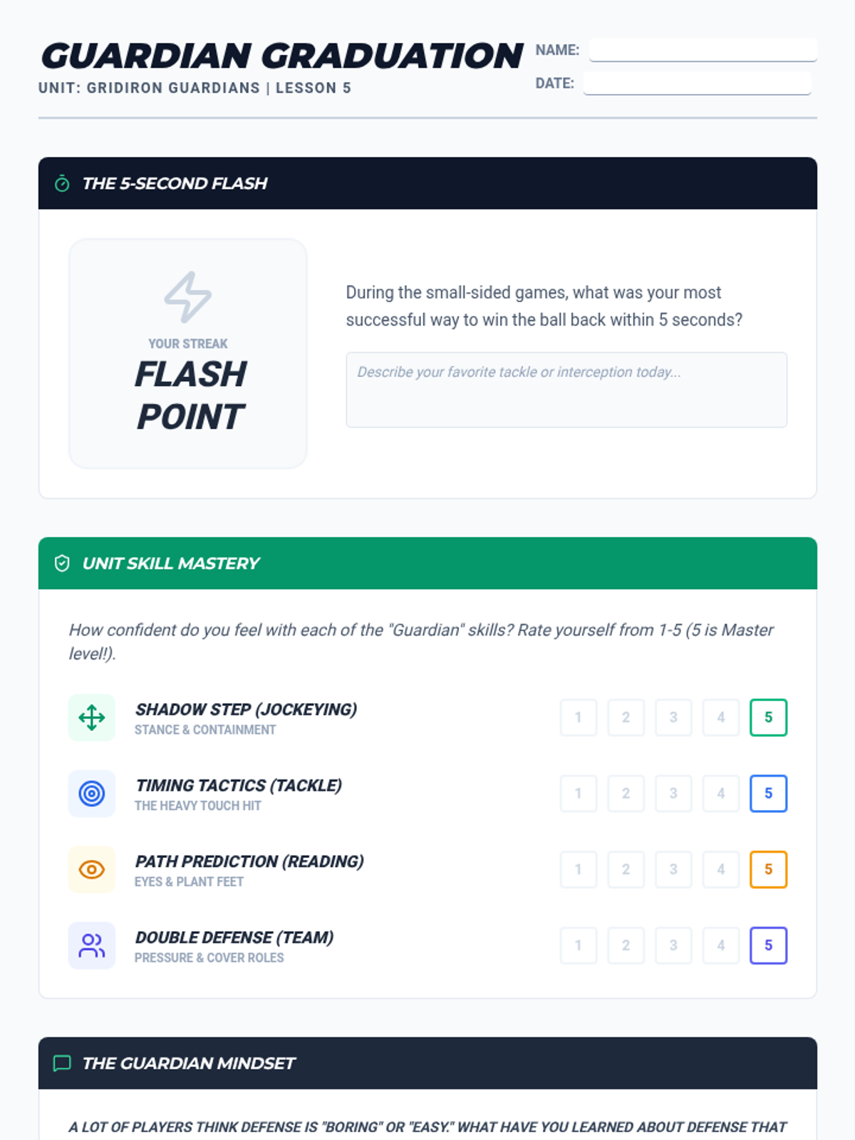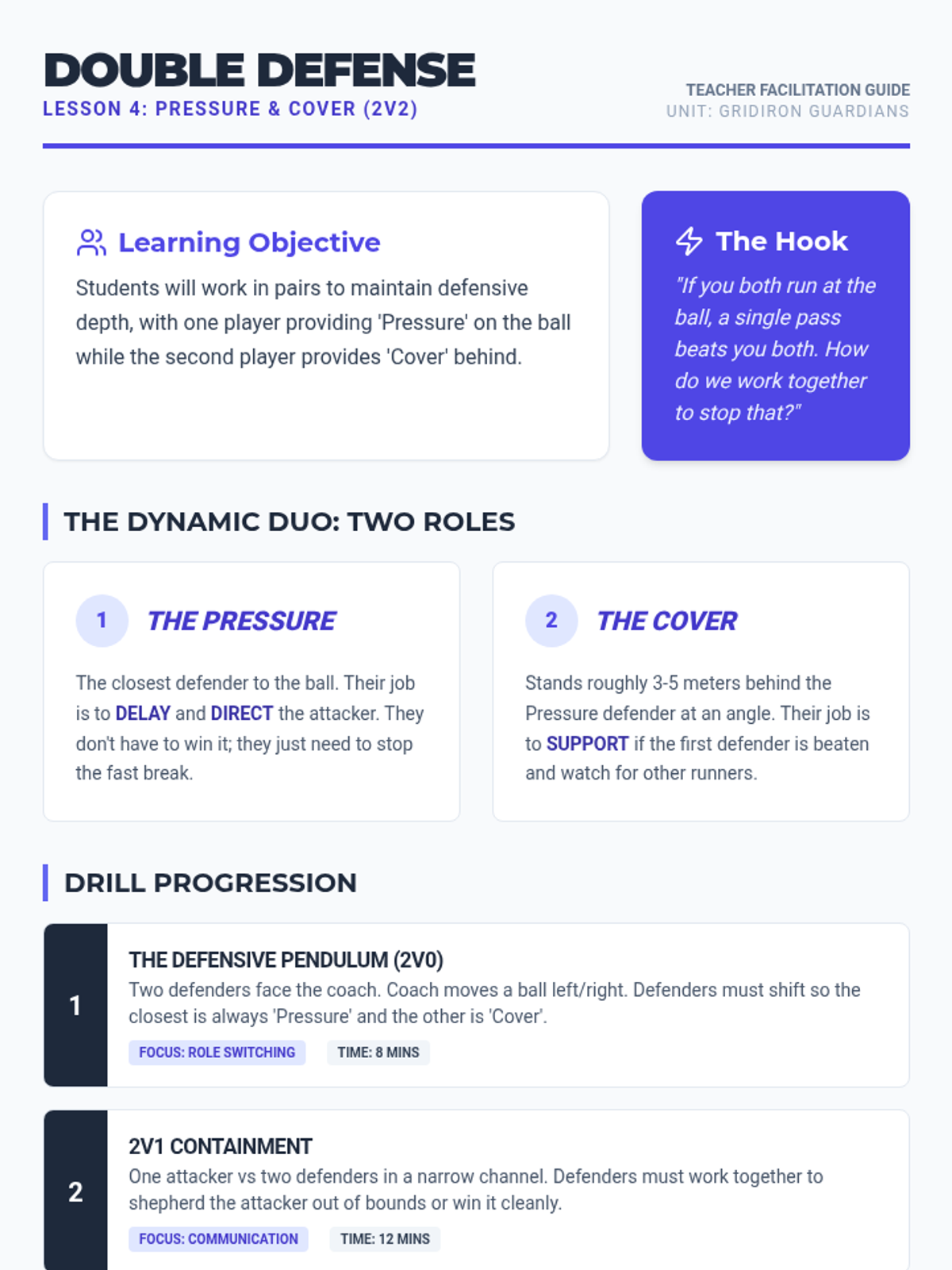 A comprehensive 5th-grade unit on defensive football skills, focusing on stance, timing, interception, and team coordination to regain possession cleanly and intelligently.