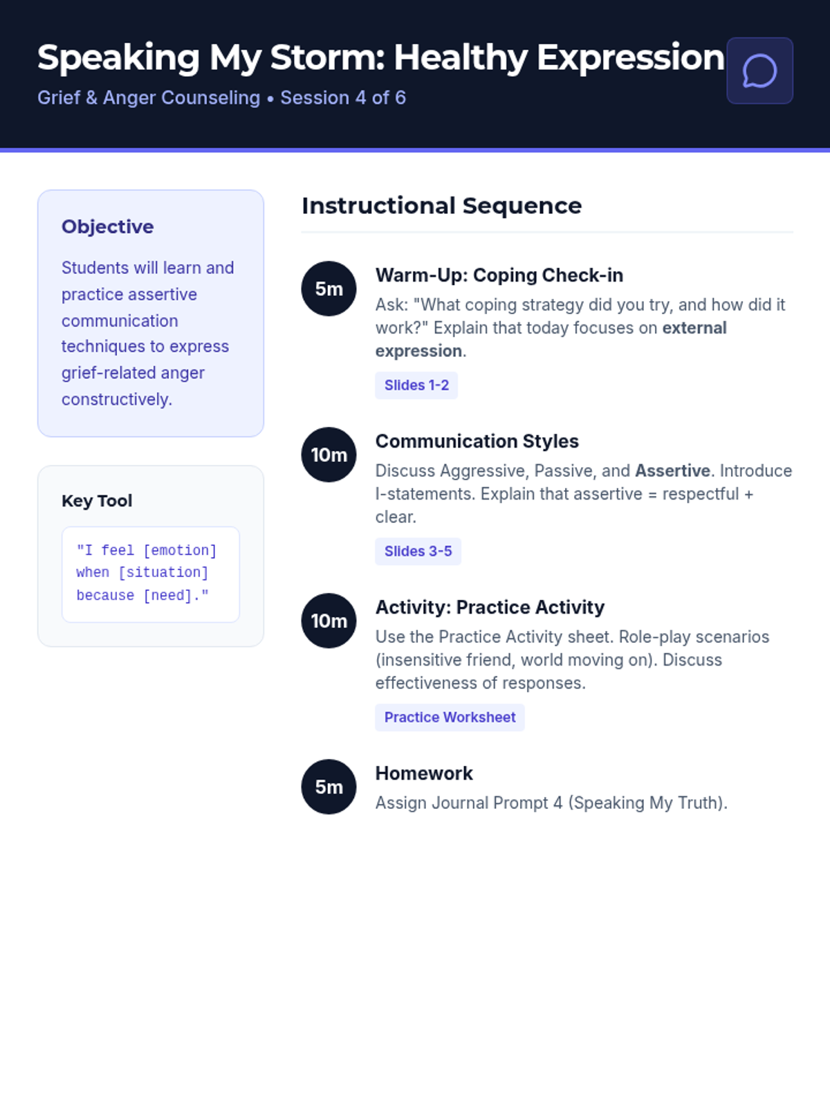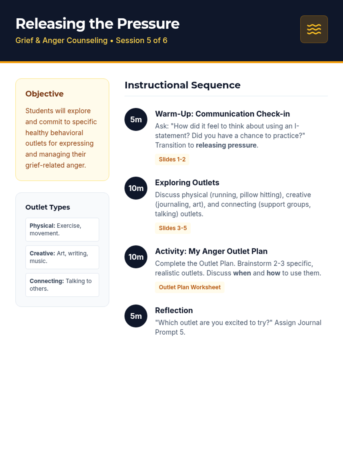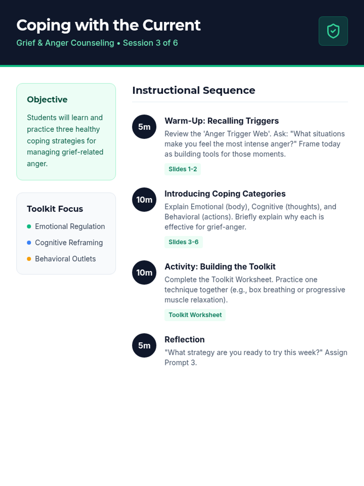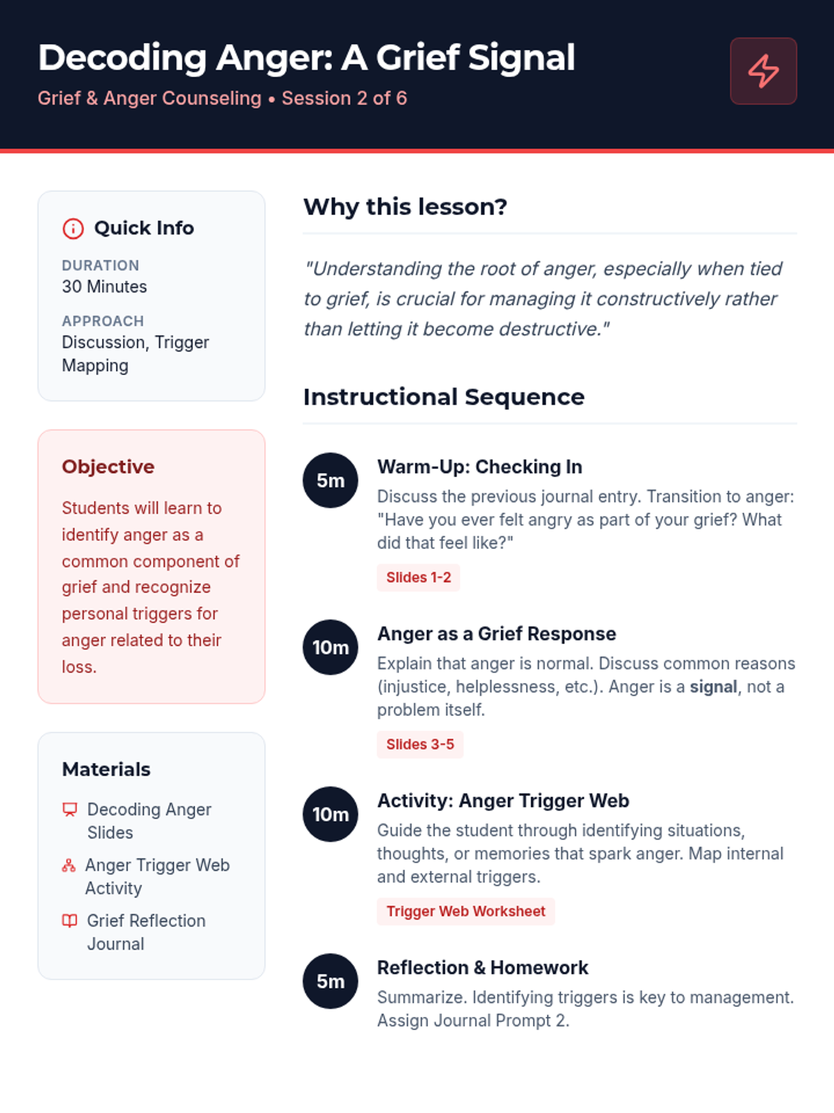 A comprehensive 6-session individual counseling sequence for 11th-grade students, focusing on the intersection of grief and anger. Students will move from understanding the nature of grief to identifying personal triggers, developing coping strategies, and creating a long-term emotional wellness plan.