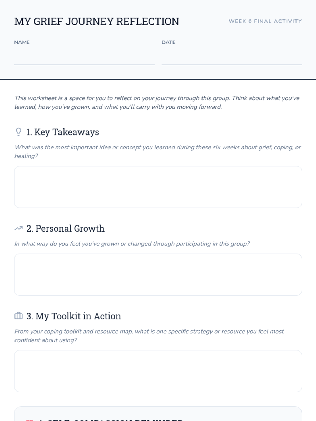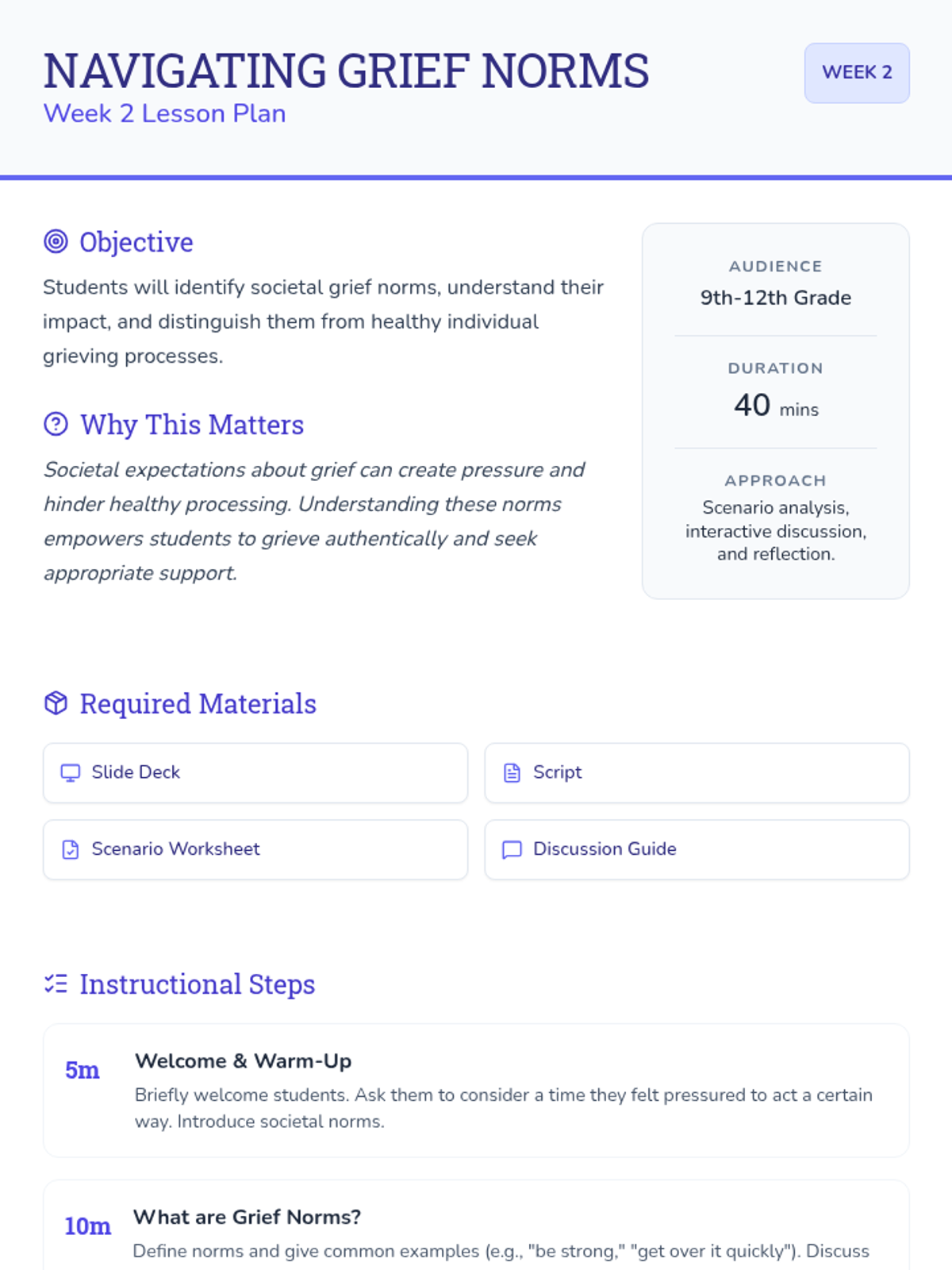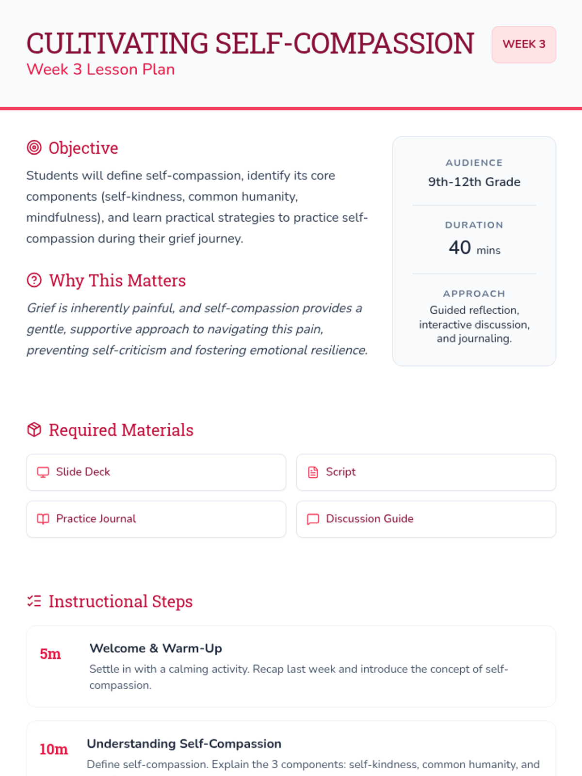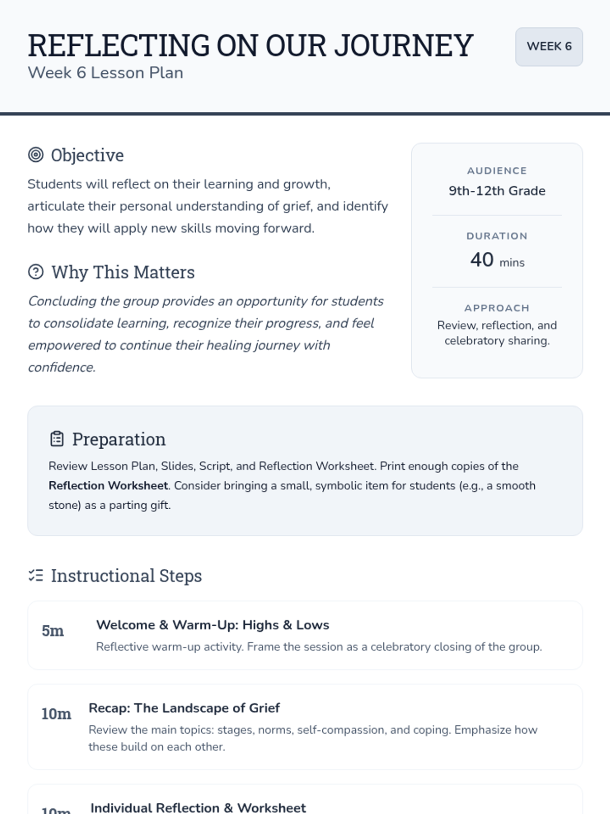 A 6-session Tier 2 small group counseling program for high schoolers to navigate the complexities of grief through understanding stages, challenging norms, and building a self-compassion toolkit.