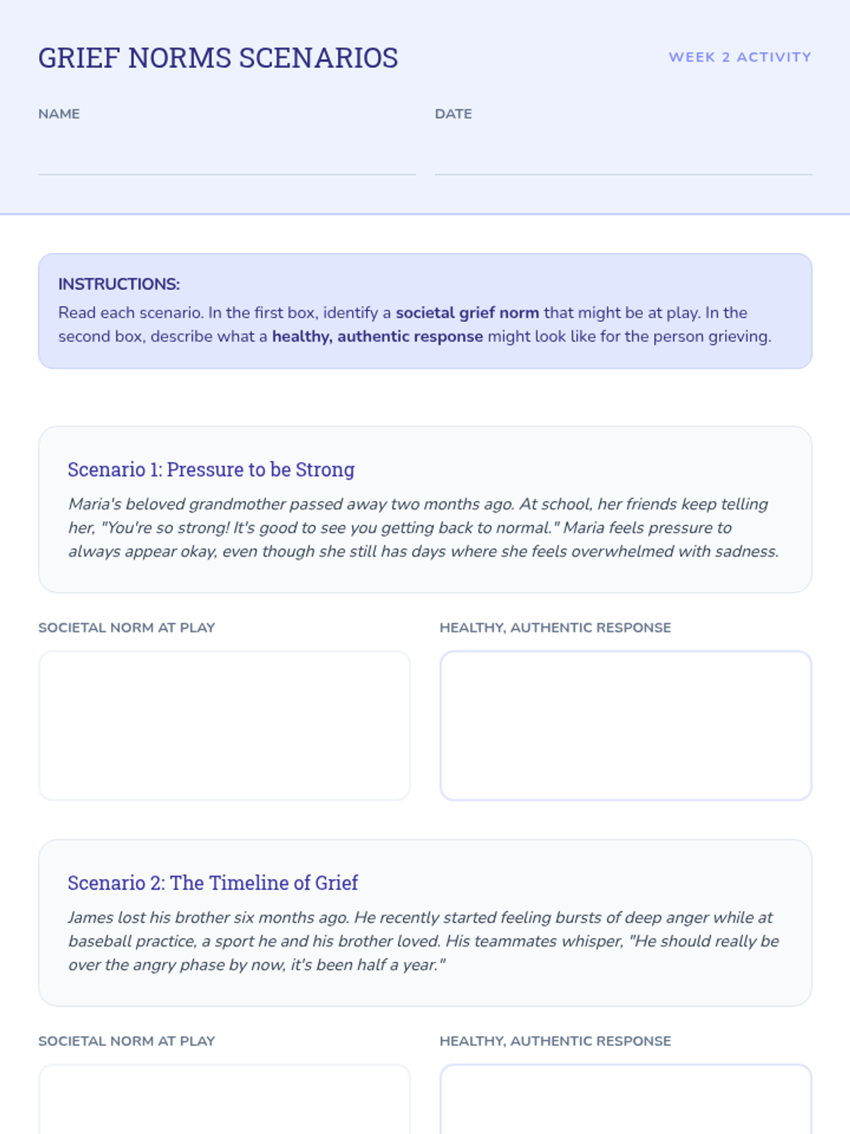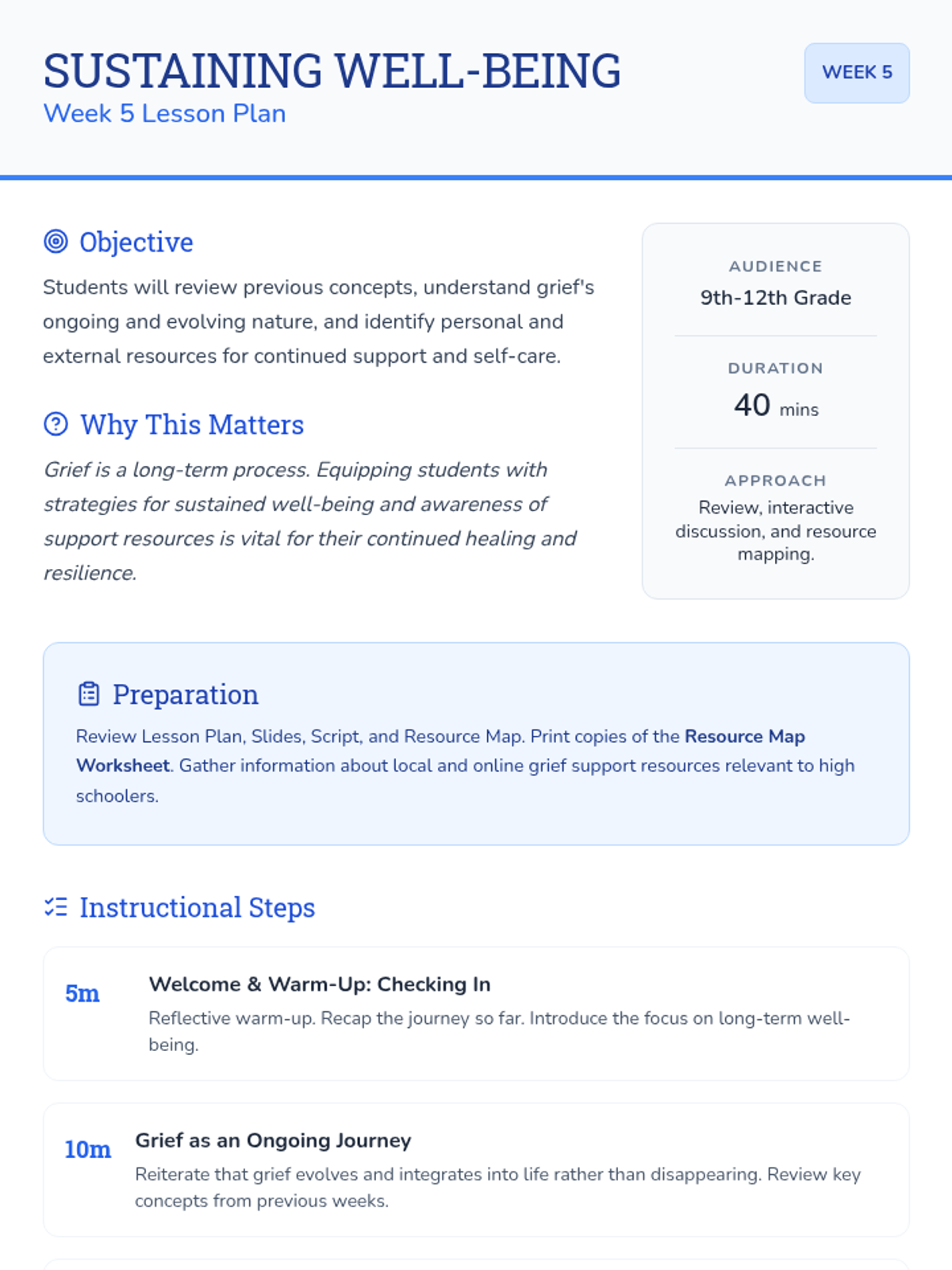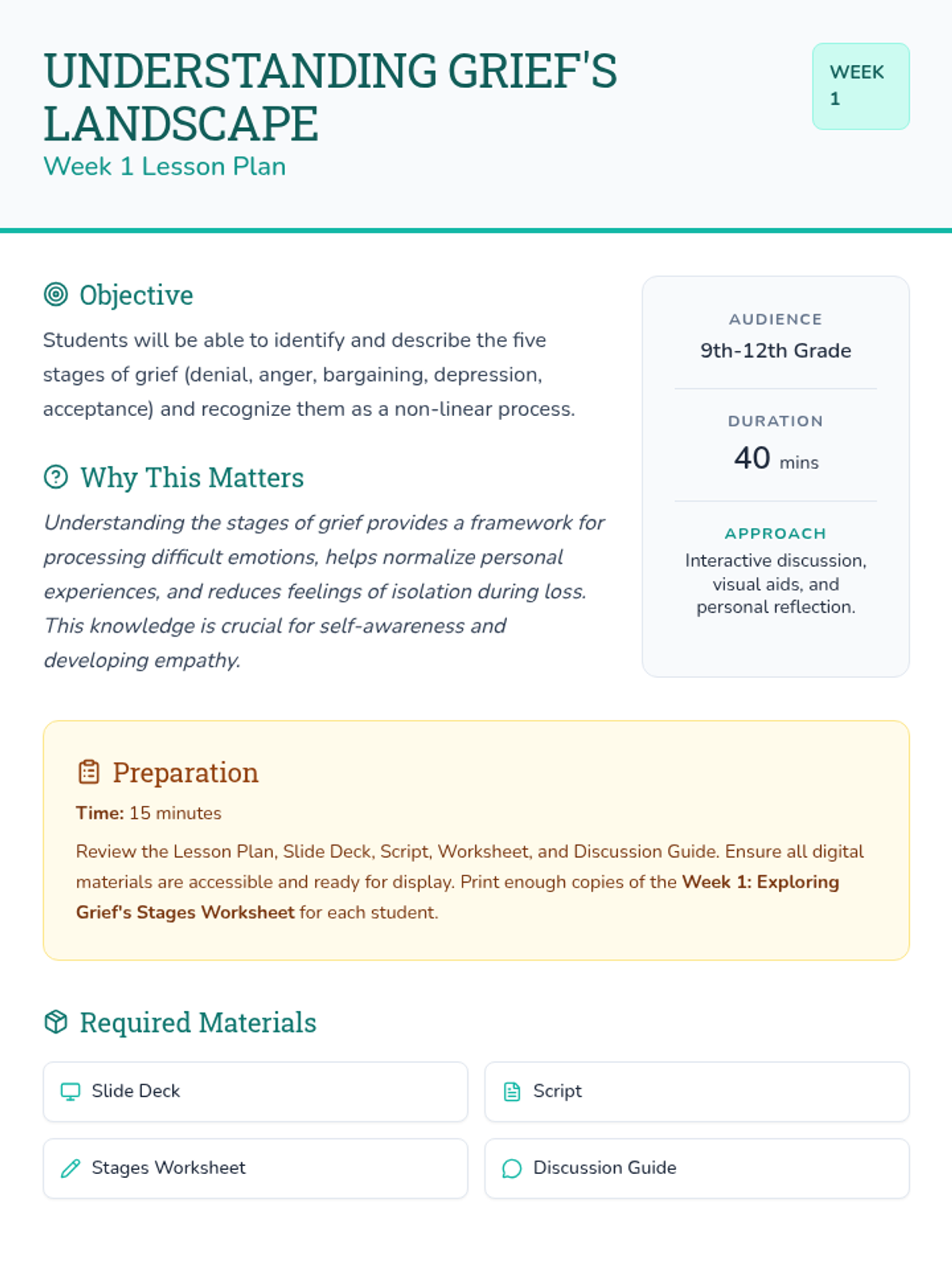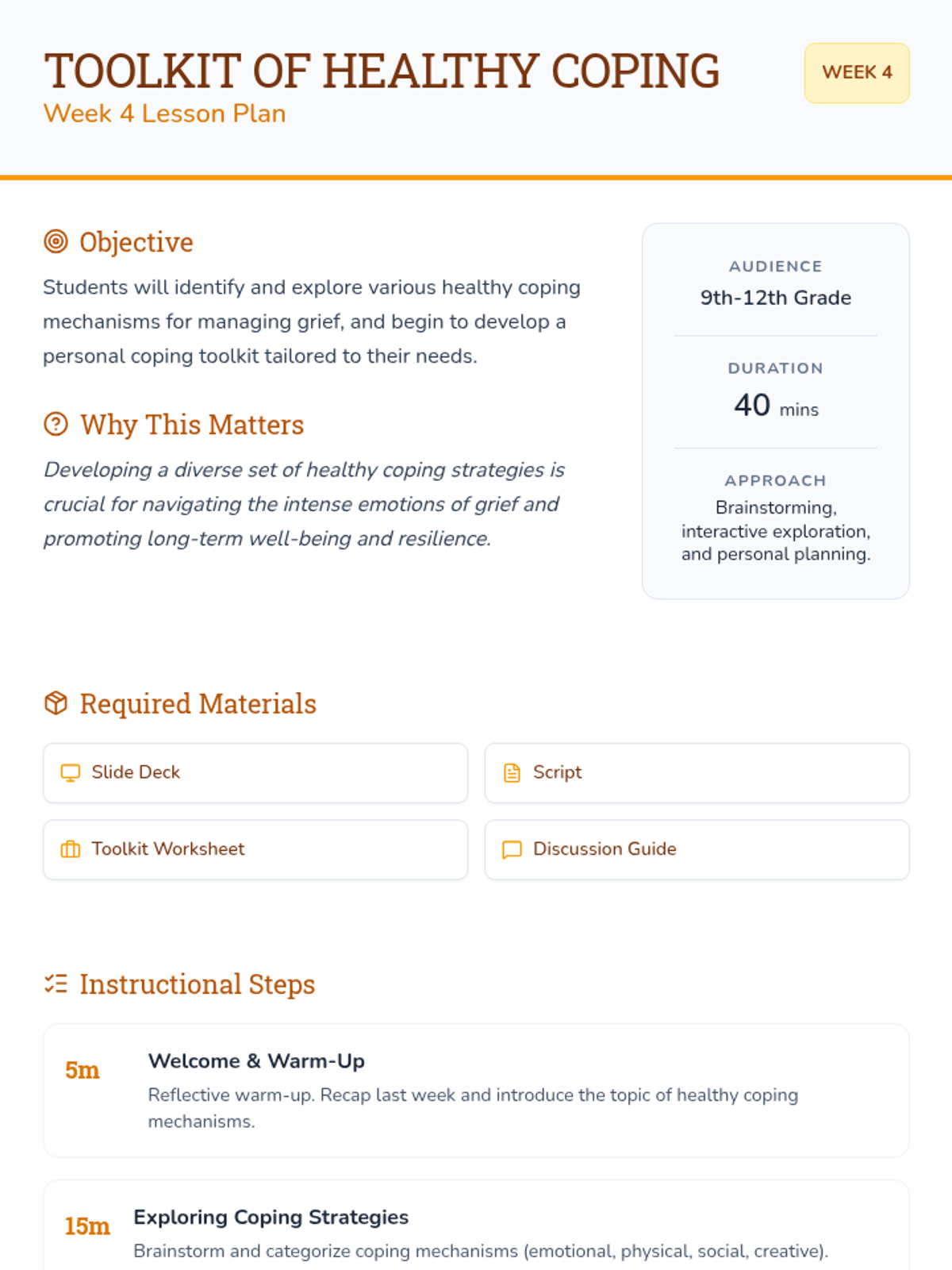 A 6-session Tier 2 small group counseling program for high schoolers to navigate the complexities of grief through understanding stages, challenging norms, and building a self-compassion toolkit.