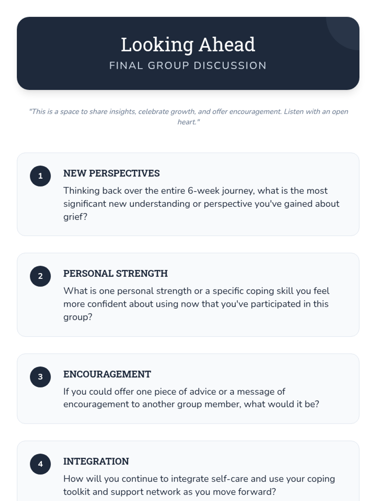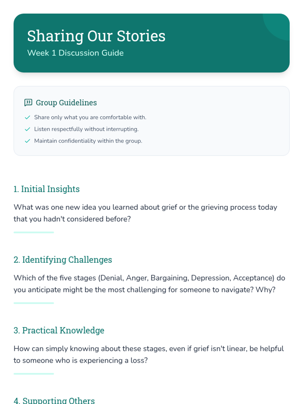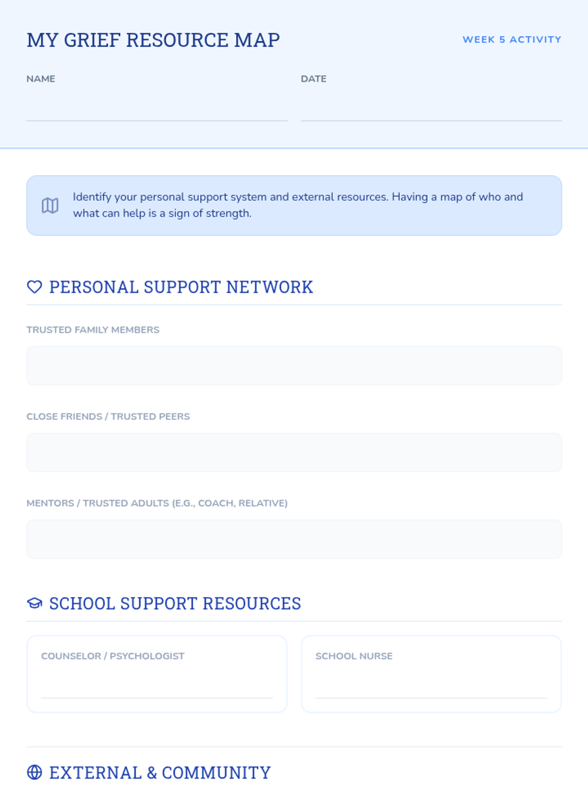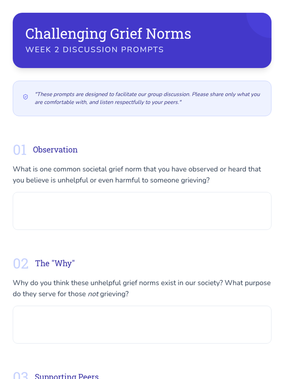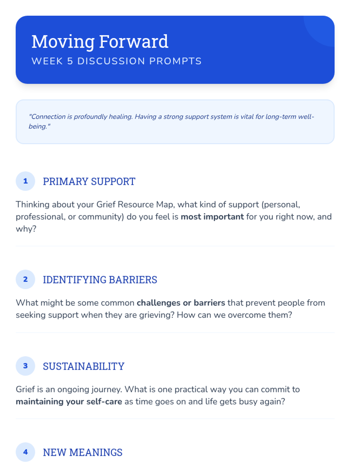 A 6-session Tier 2 small group counseling program for high schoolers to navigate the complexities of grief through understanding stages, challenging norms, and building a self-compassion toolkit.