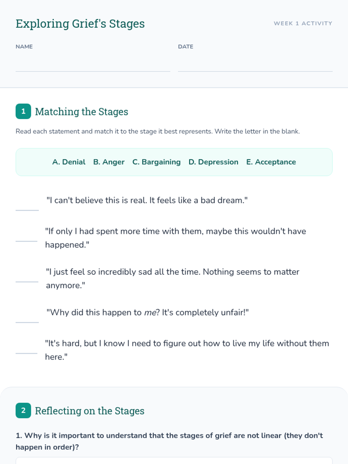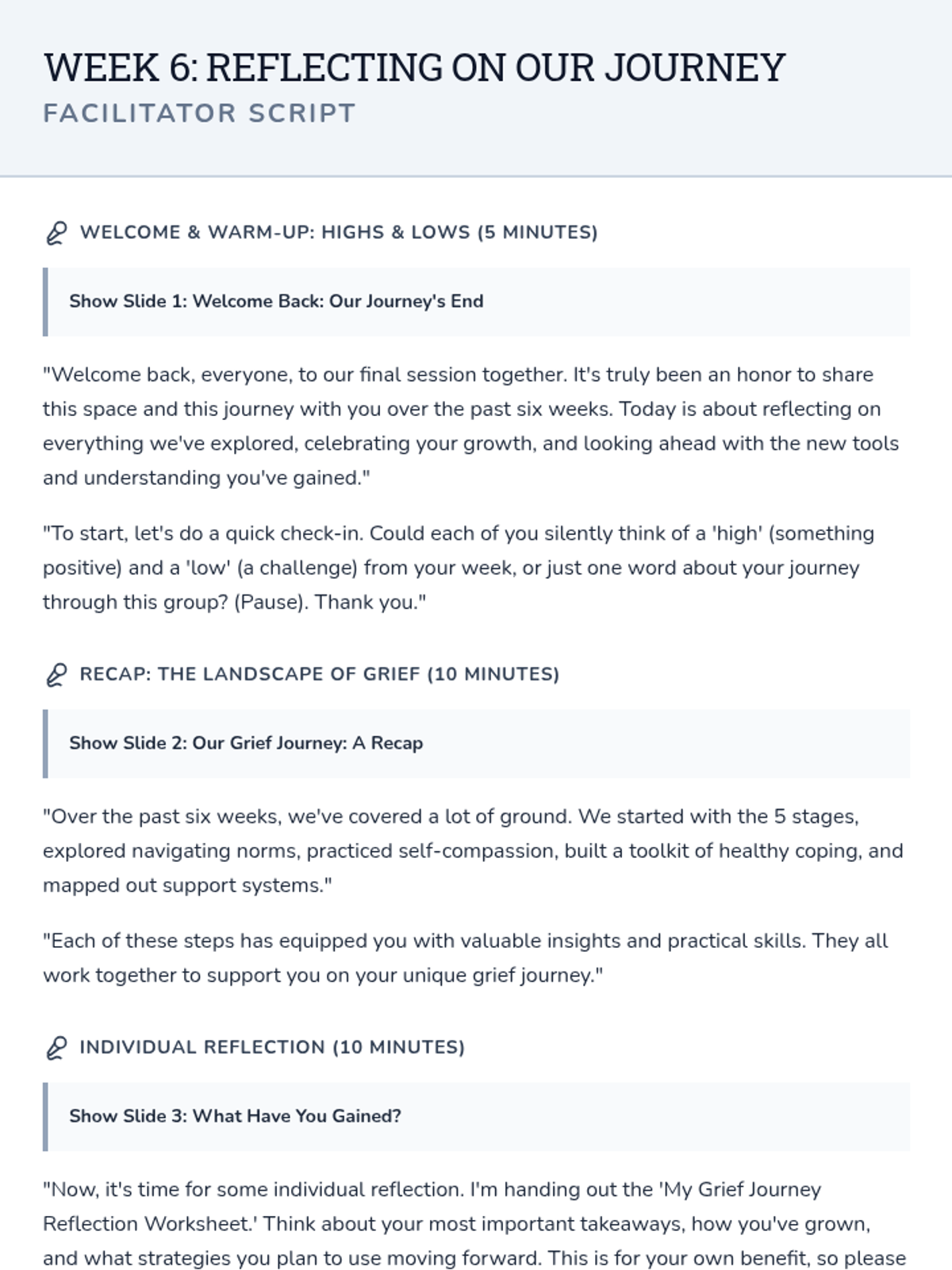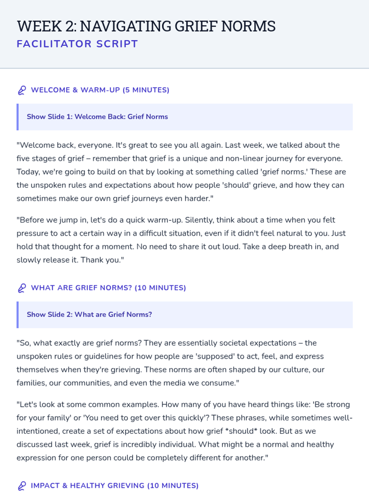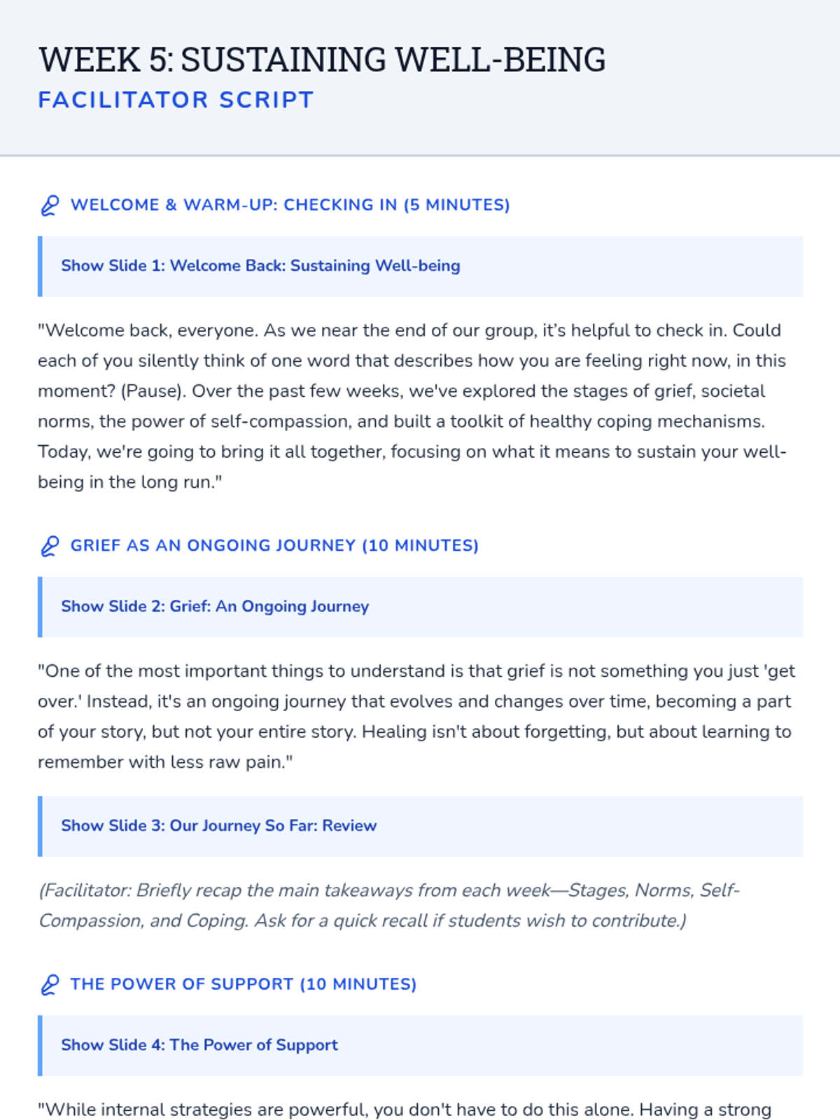 A 6-session Tier 2 small group counseling program for high schoolers to navigate the complexities of grief through understanding stages, challenging norms, and building a self-compassion toolkit.