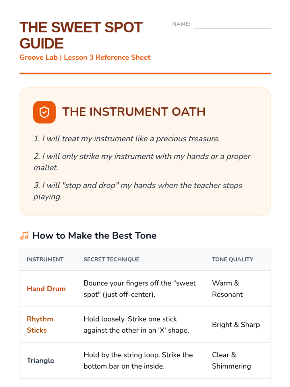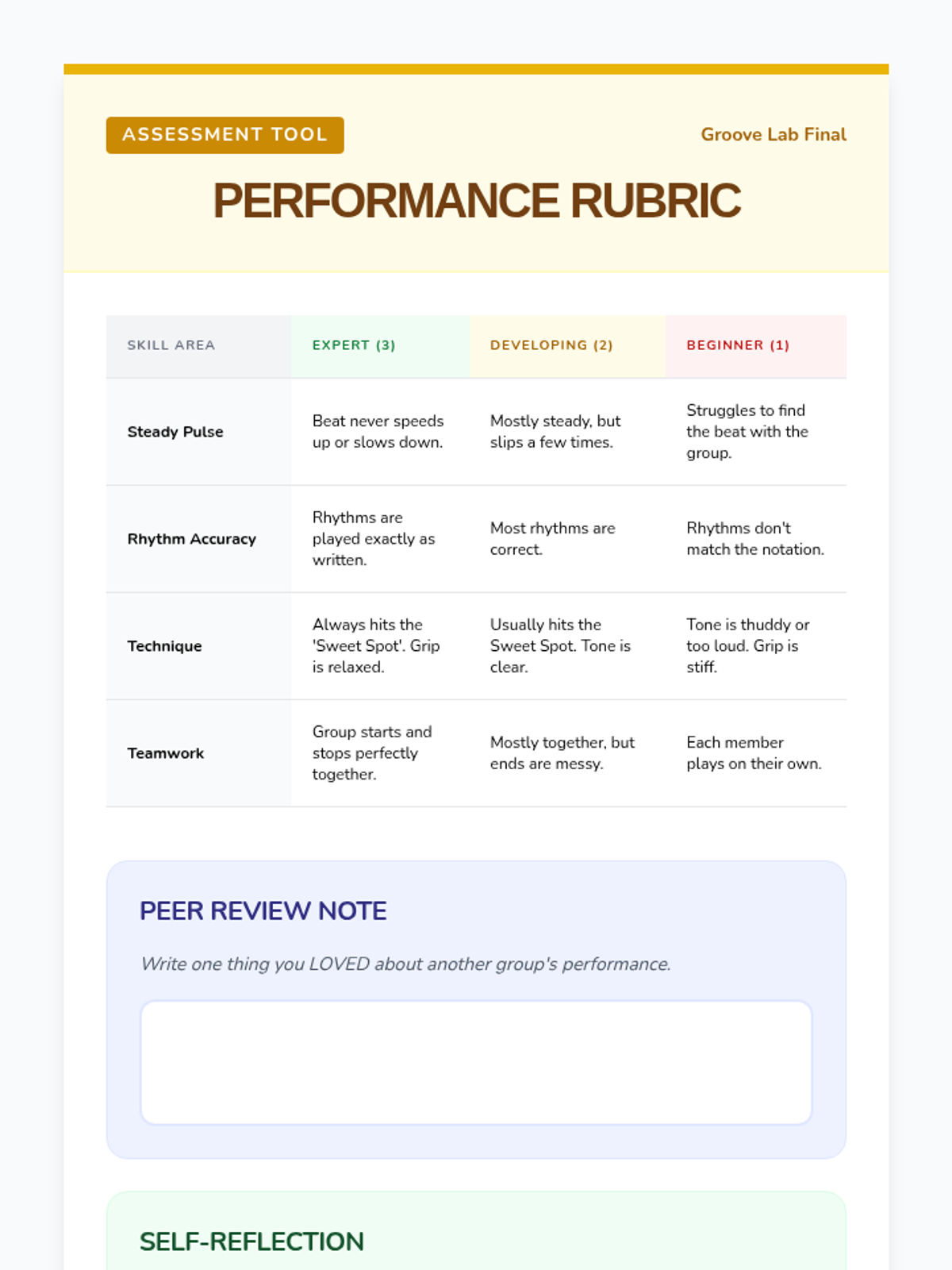 A 3rd-grade music sequence focusing on rhythmic accuracy, notation literacy, and percussion technique through the 'Groove Lab' theme. Students progress from internalizing a steady pulse to composing and performing multi-part ensemble pieces.