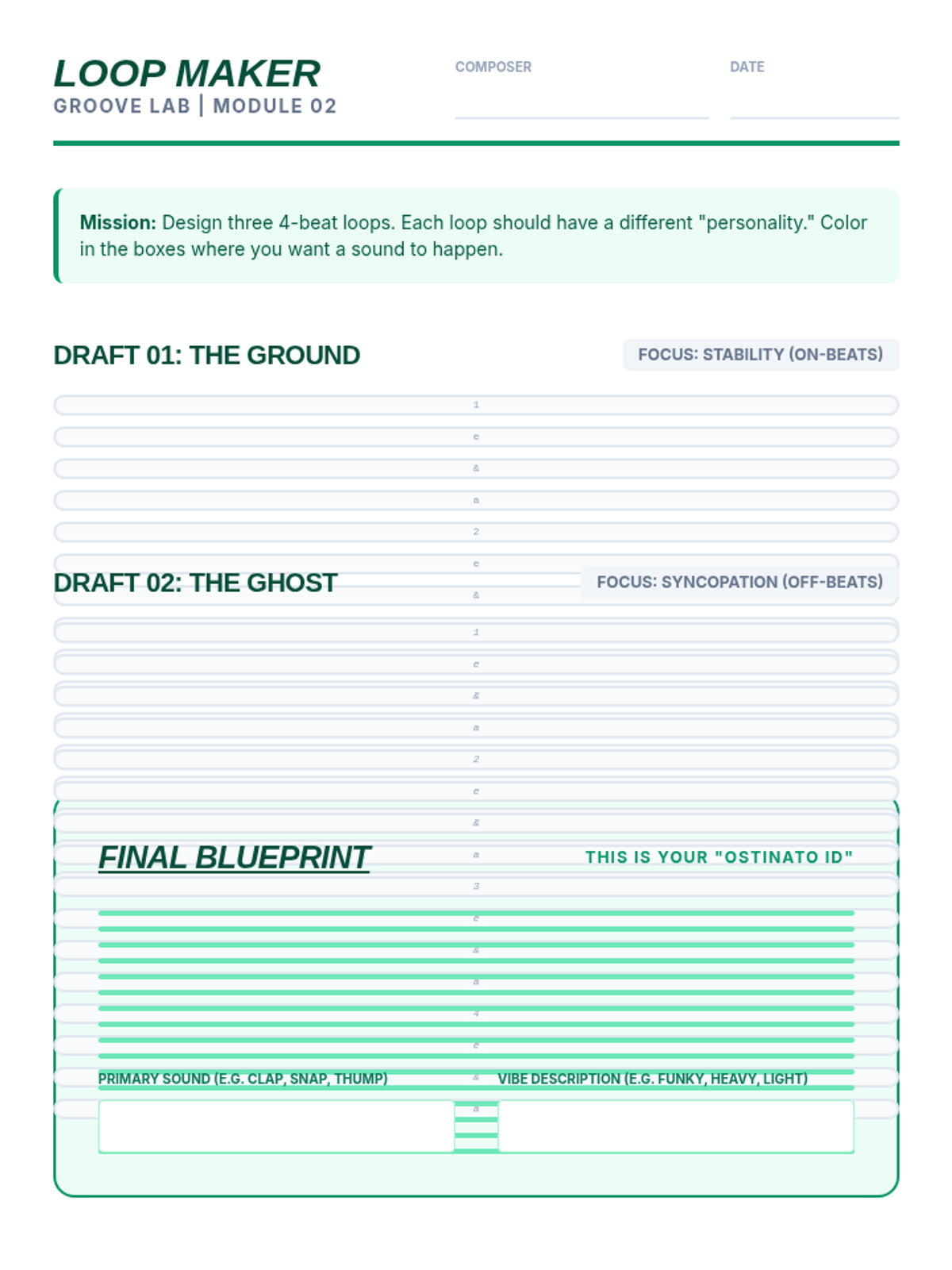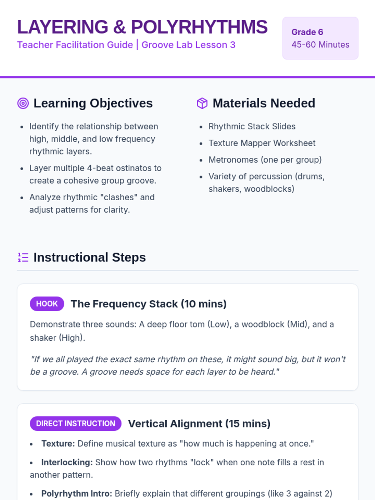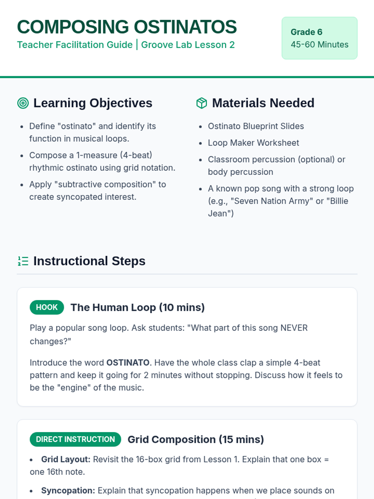 This sequence introduces students to the foundations of rhythmic composition through the creation of layered ostinatos. Students progress from internalizing pulse to composing and layering original rhythms, culminating in a group performance.