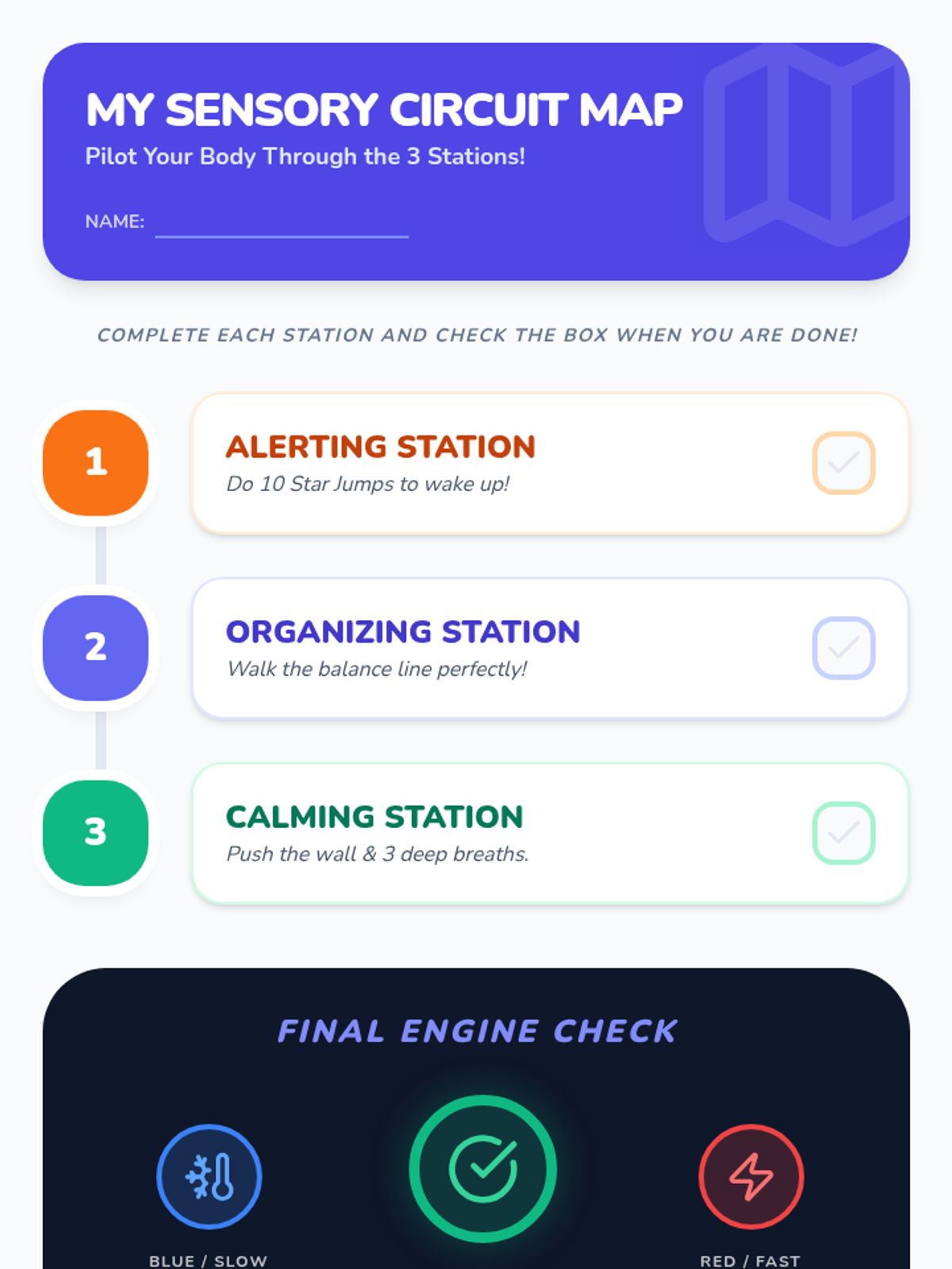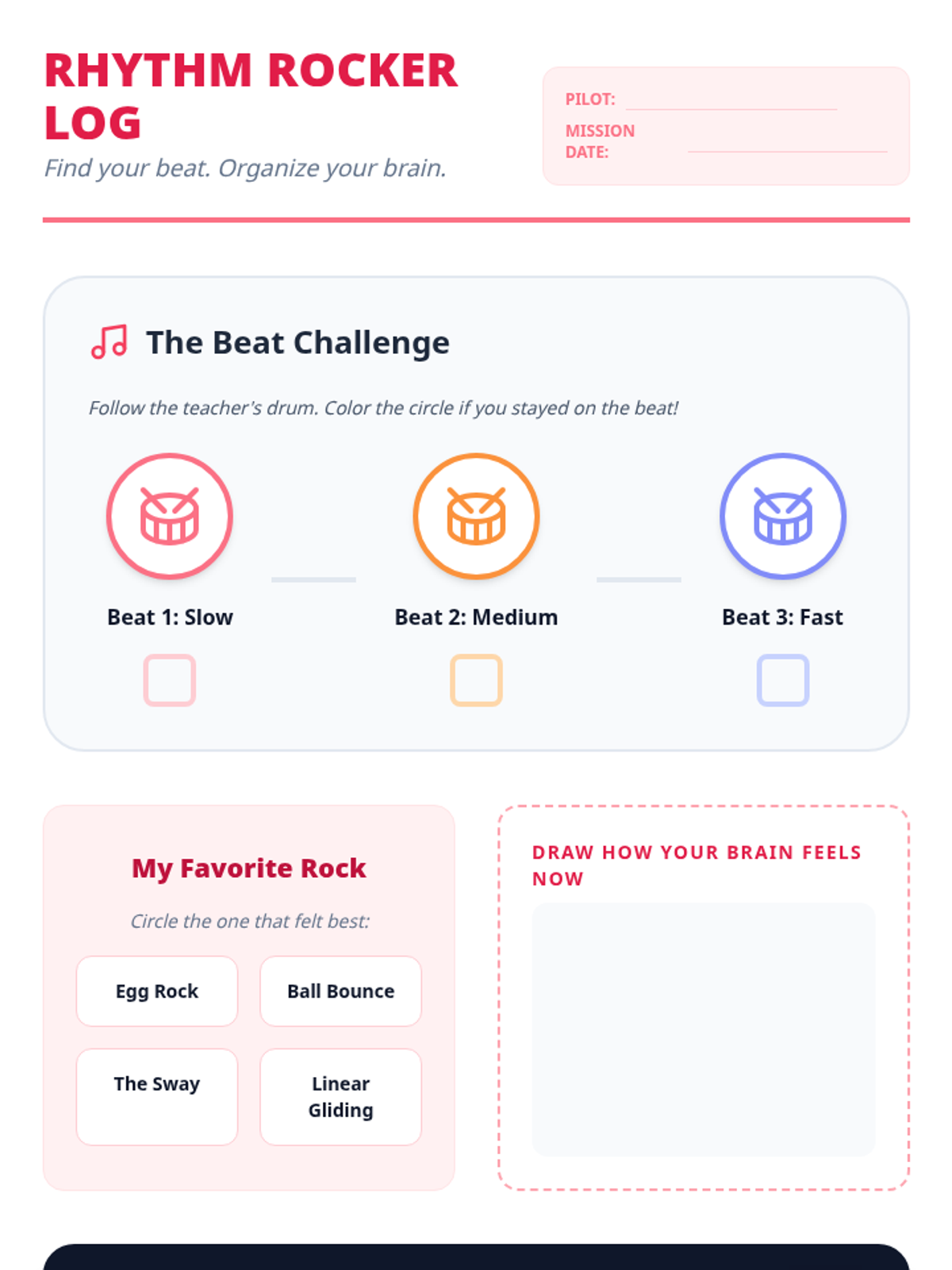 A 5-lesson sequence for 1st-grade students focused on proactive sensory breaks through heavy work, slow-motion control, vestibular activities, and isometric exercises to improve self-regulation.