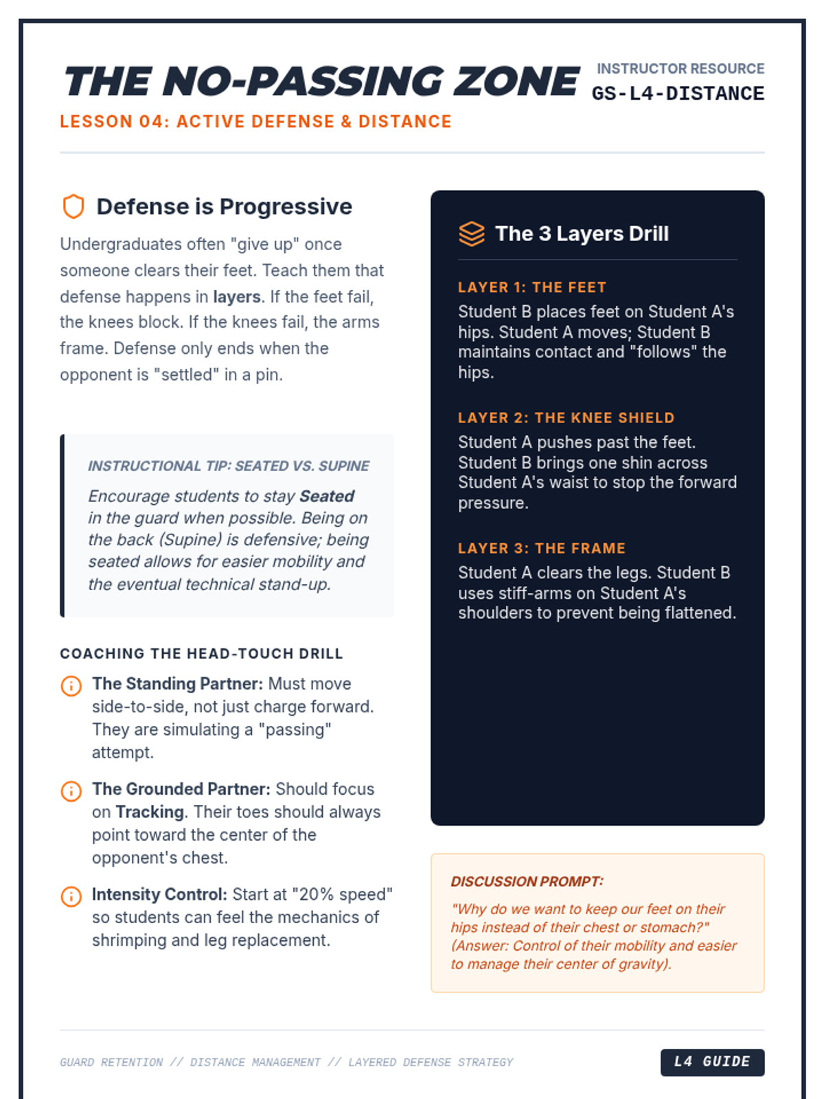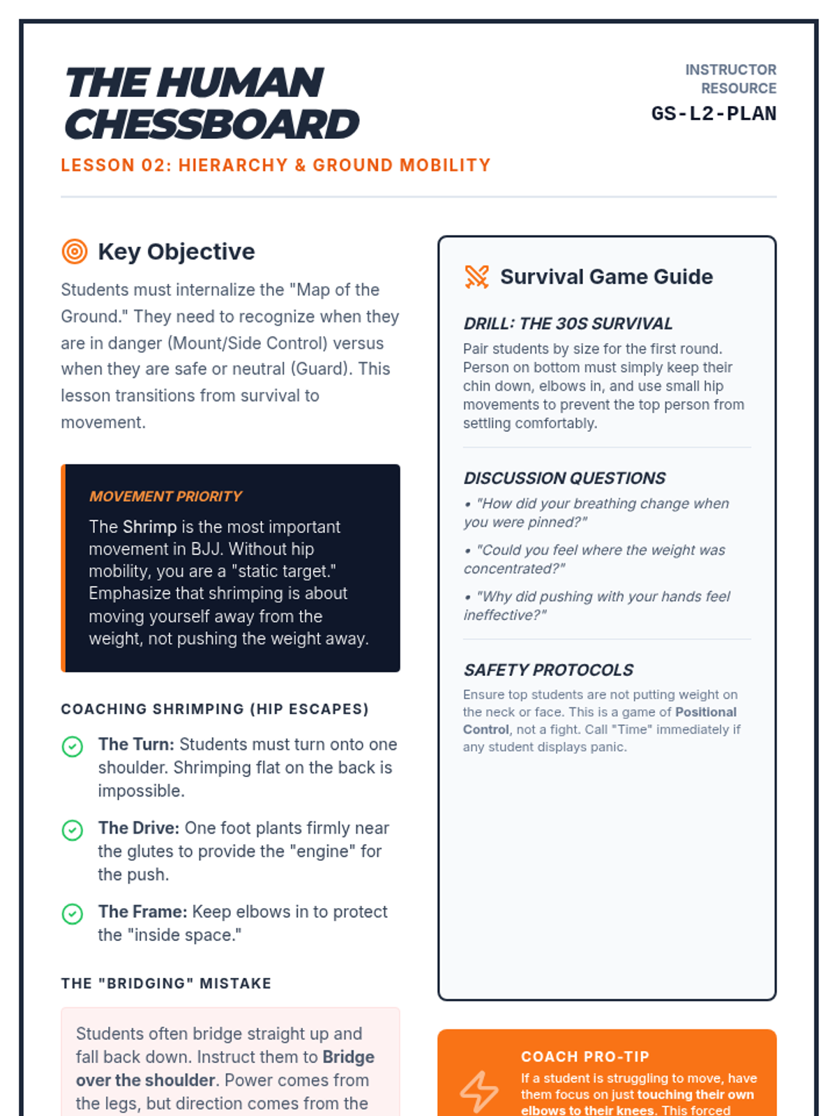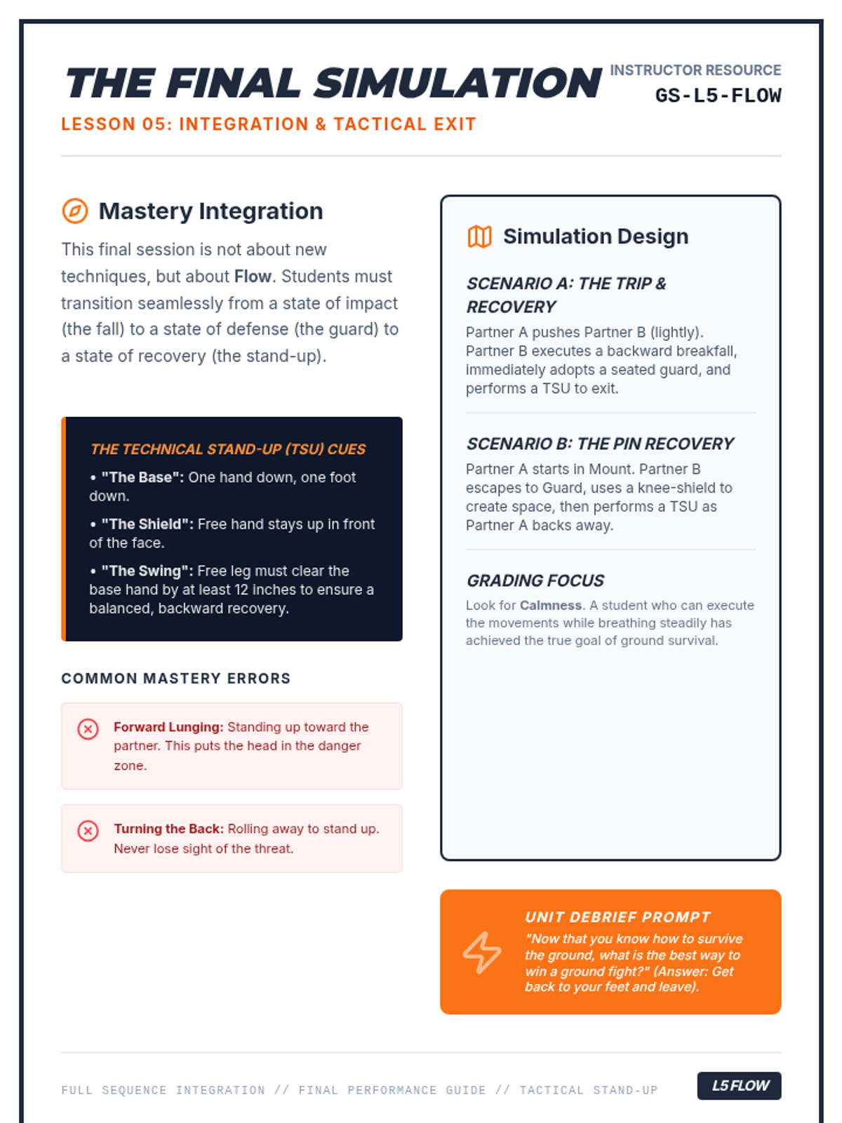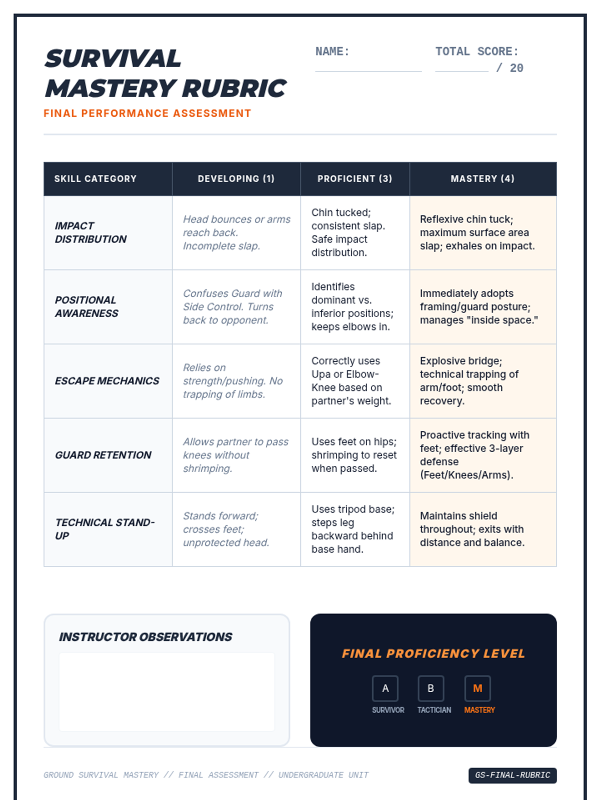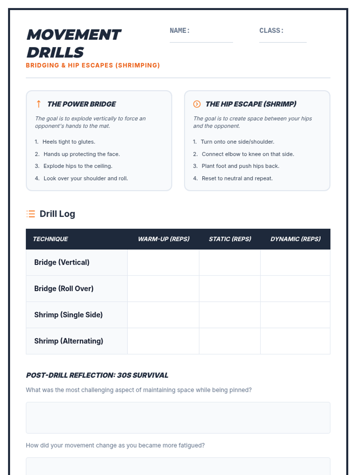 A comprehensive unit on Brazilian Jiu-Jitsu and wrestling-based ground survival. Students learn how to fall safely, manage positions of disadvantage, and use leverage to escape pins and return to their feet.