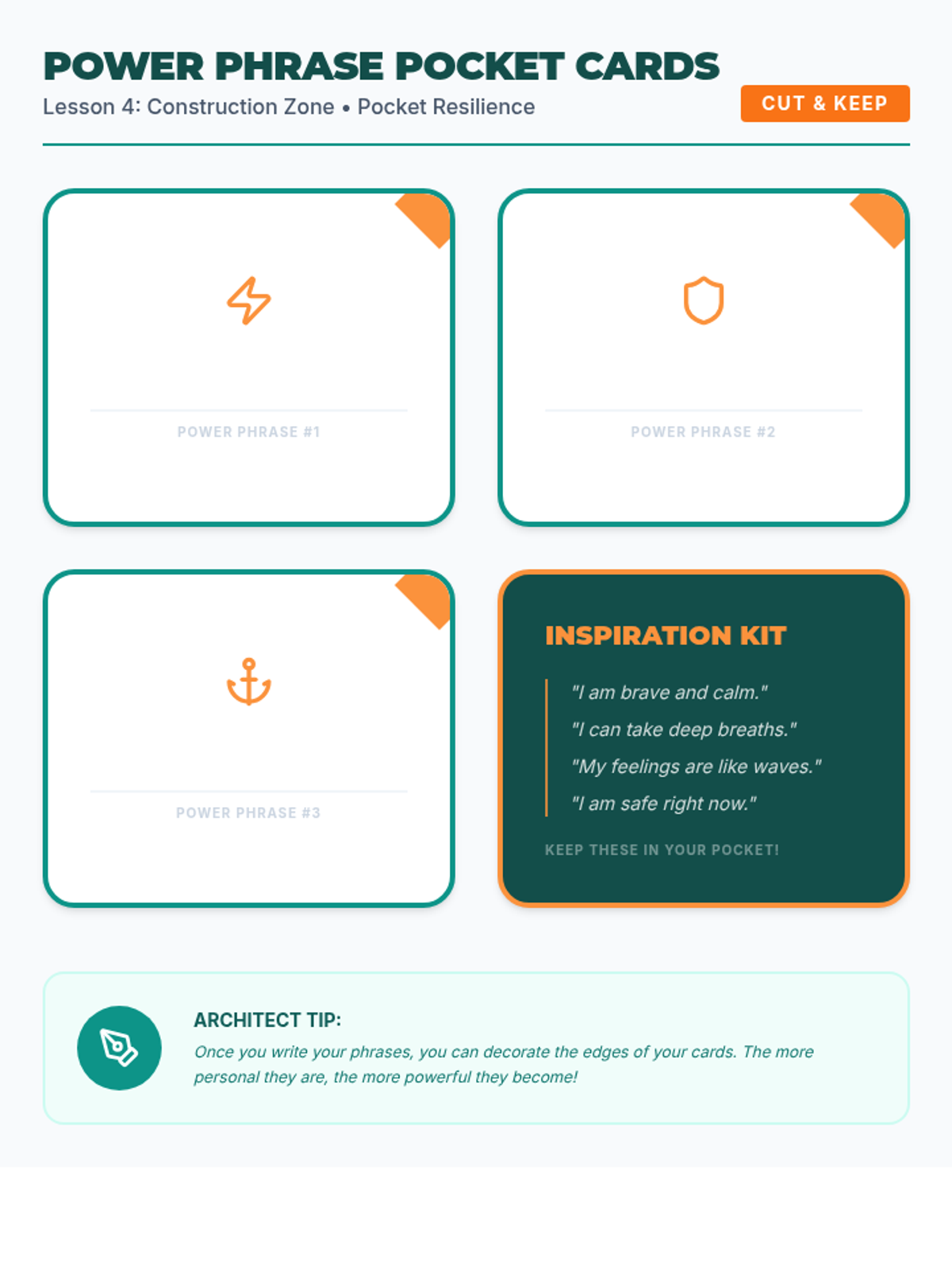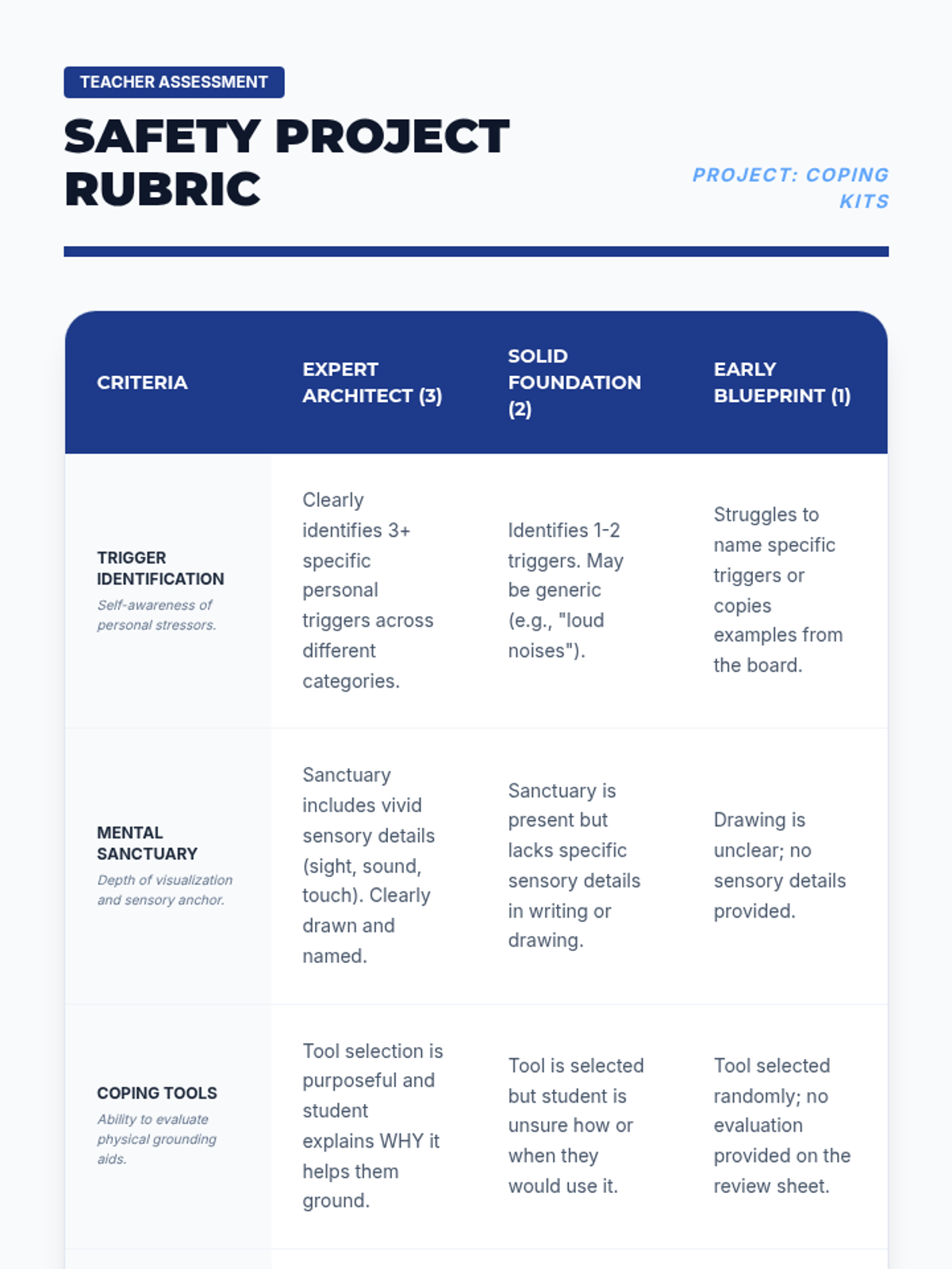 Students design and create a personalized 'Coping Kit' (mental or physical) containing tools for managing crisis moments. This project-based sequence guides 3rd graders through self-reflection, visualization techniques, tool selection, and the creation of a comprehensive safety plan.
