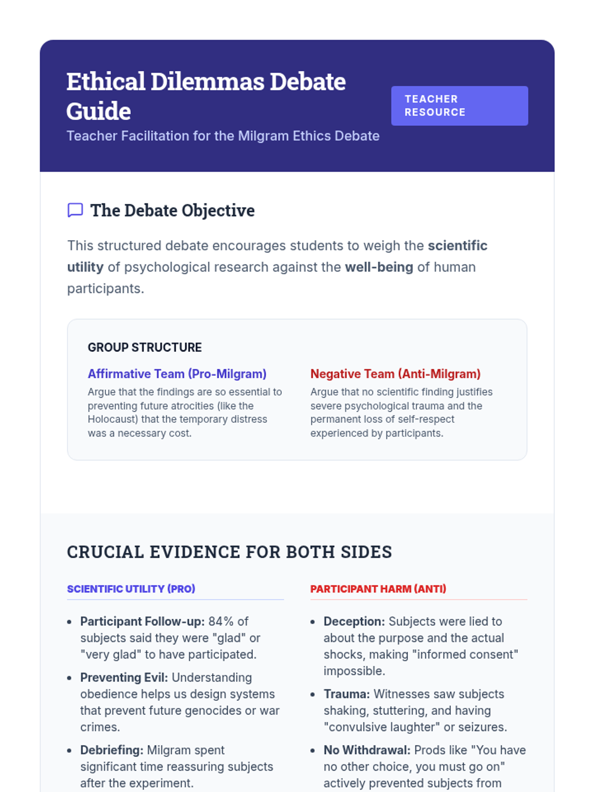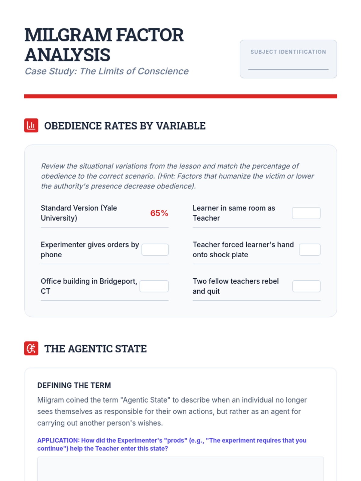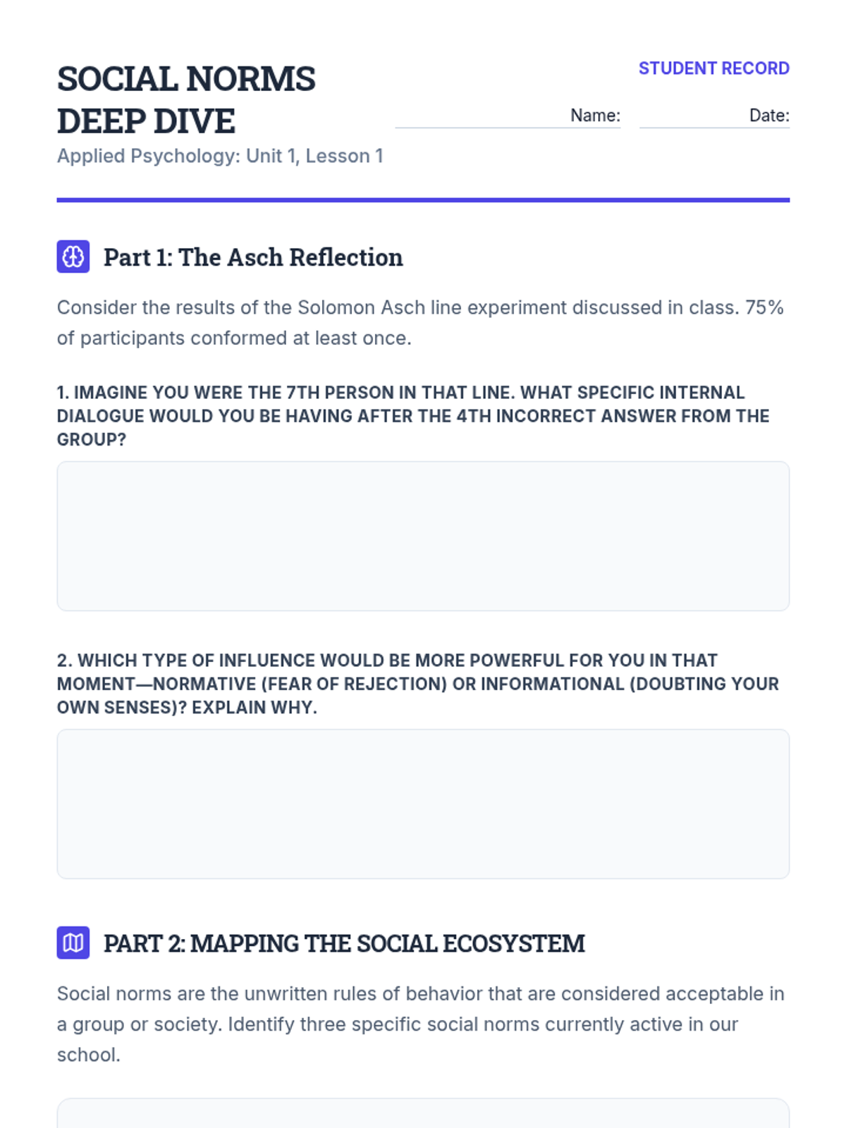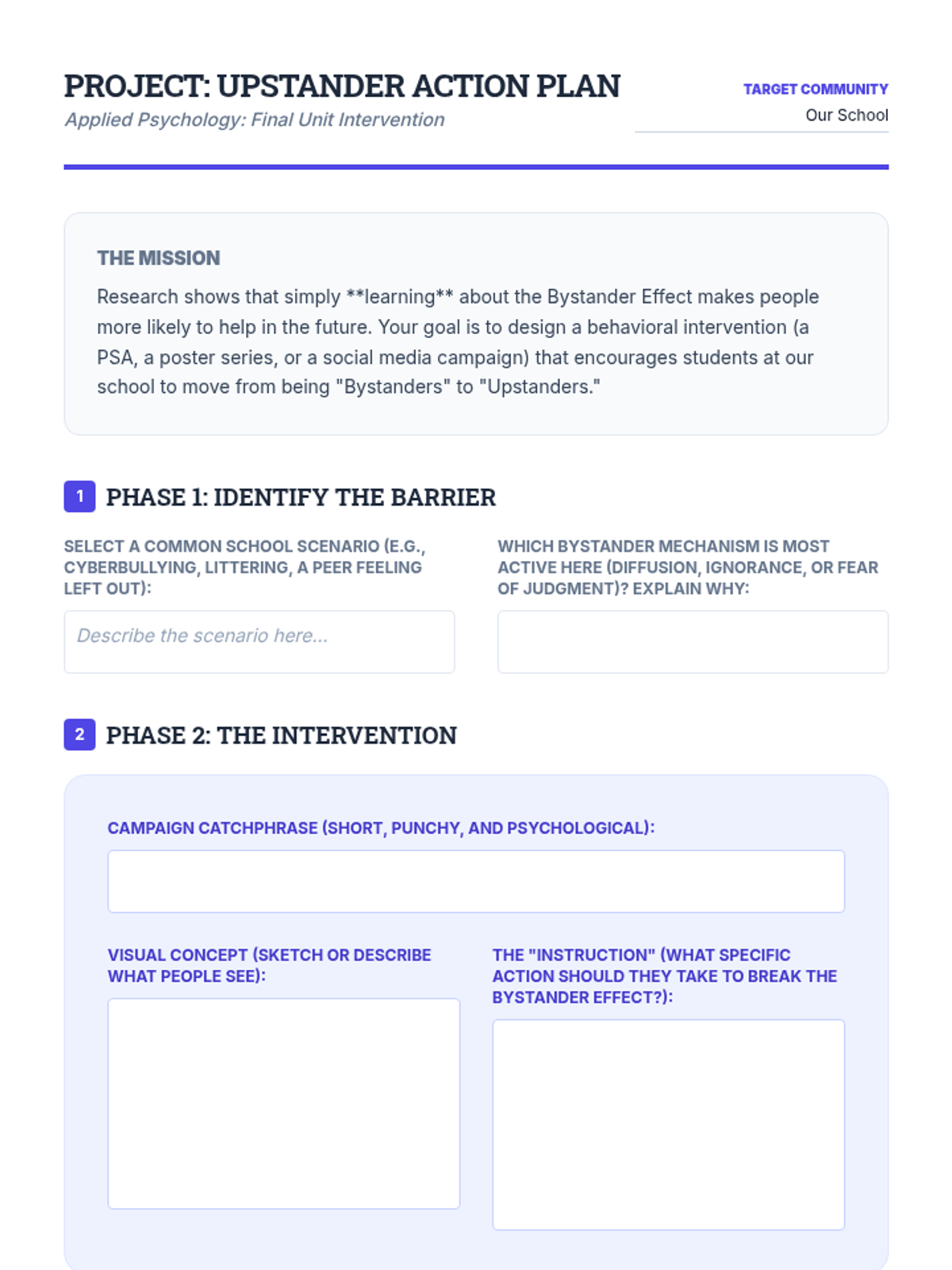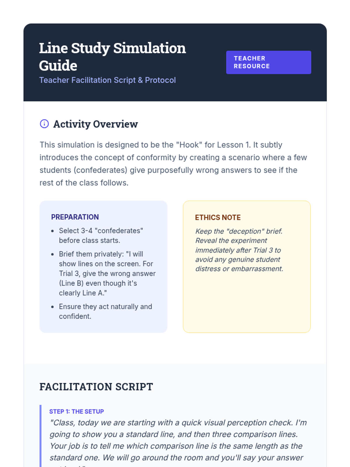 A comprehensive 10th-grade psychology unit exploring the forces of social influence, including conformity, obedience, deindividuation, groupthink, and the bystander effect. Students analyze classic experiments and historical case studies to understand the impact of groups on individual behavior.