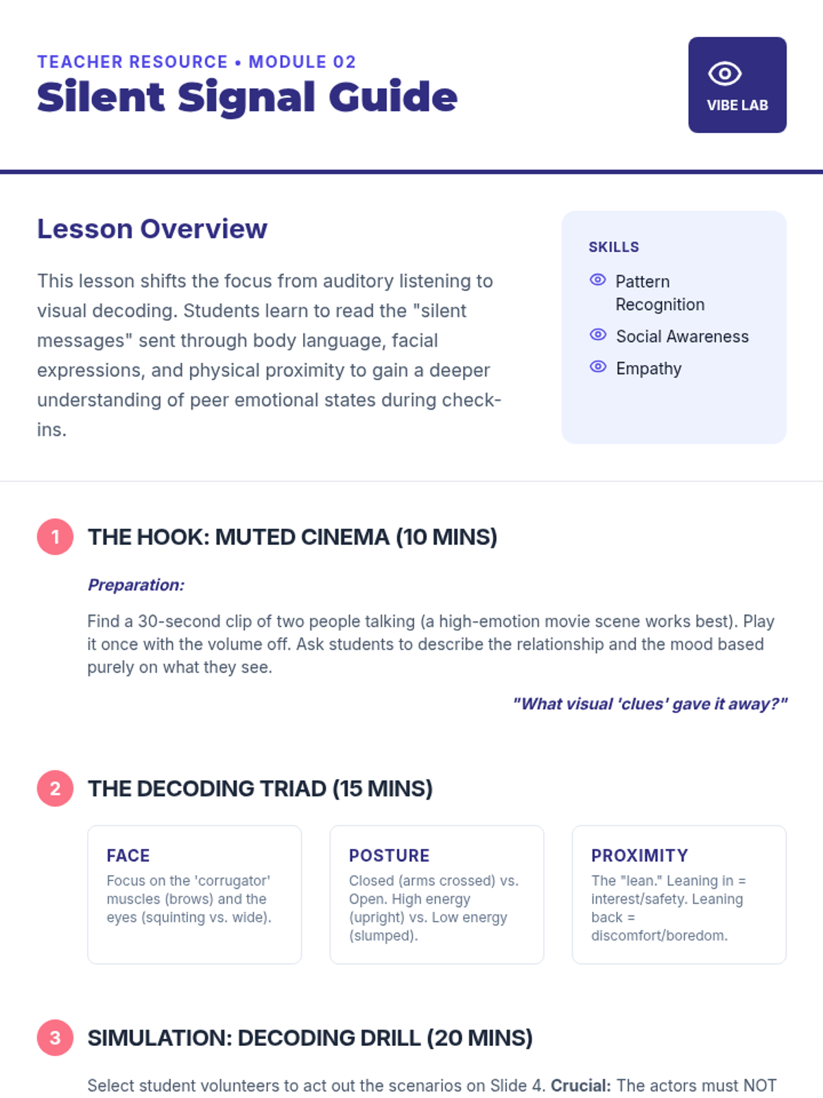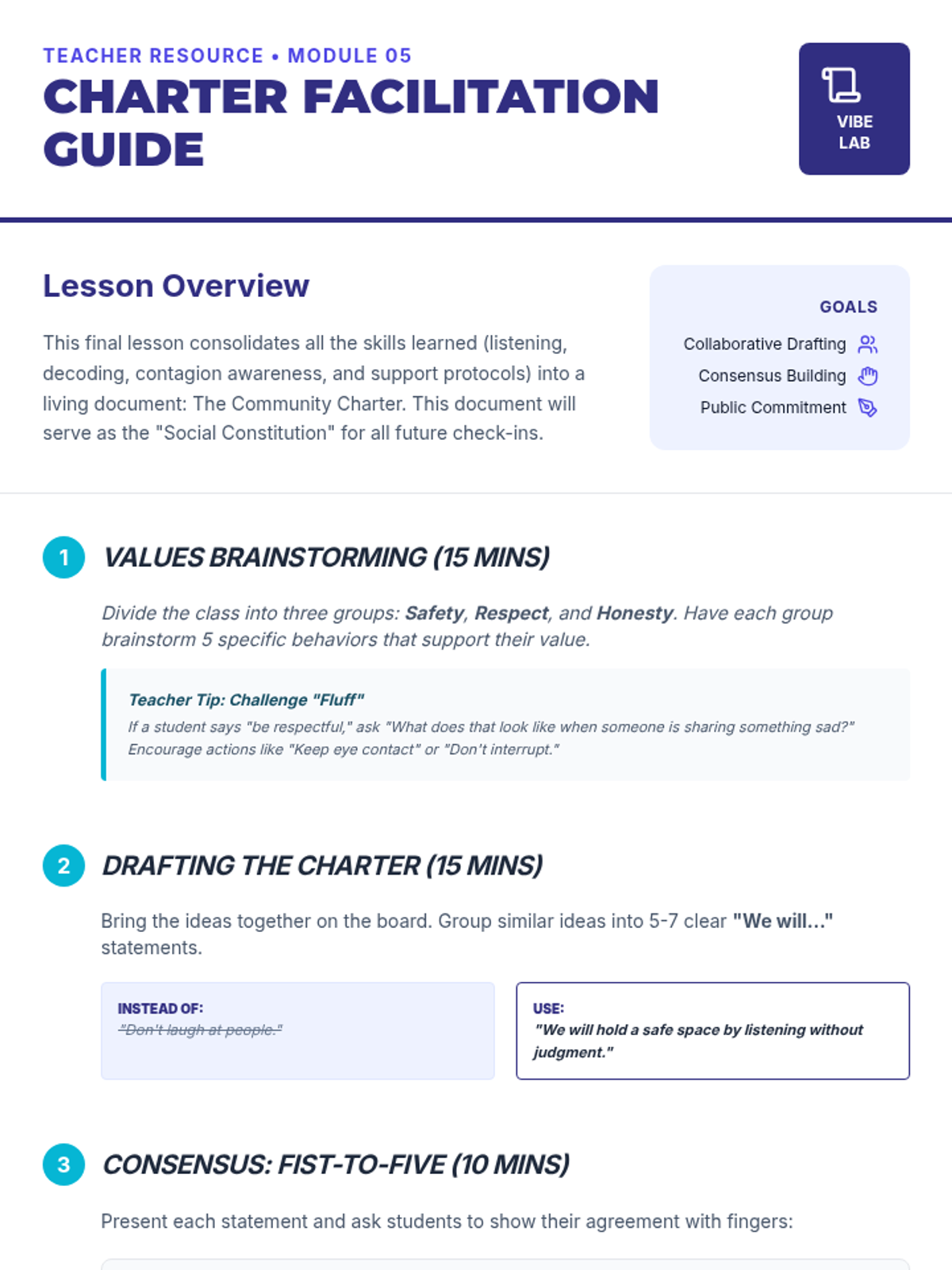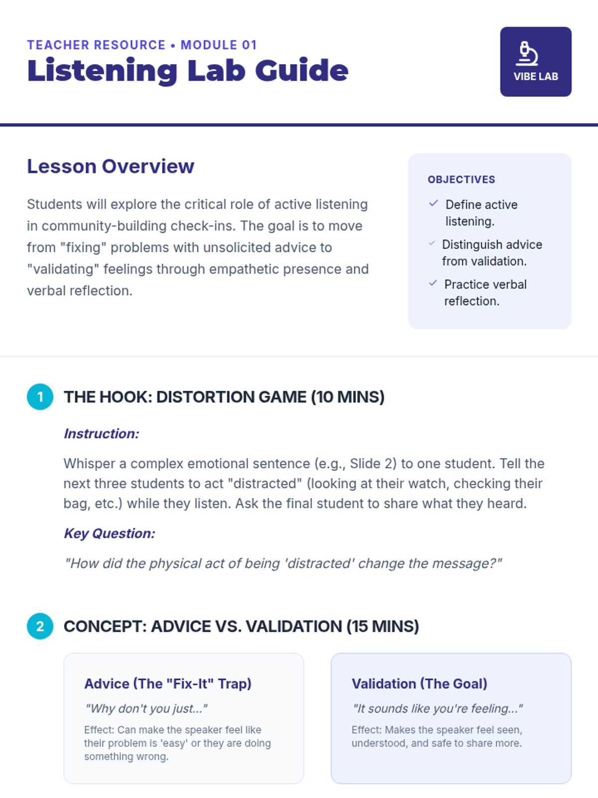 This 8th-grade sequence explores group dynamics through daily check-in procedures, focusing on active listening, non-verbal cues, emotional contagion, and peer support. Students will develop social awareness and community-building skills to foster a supportive classroom environment.