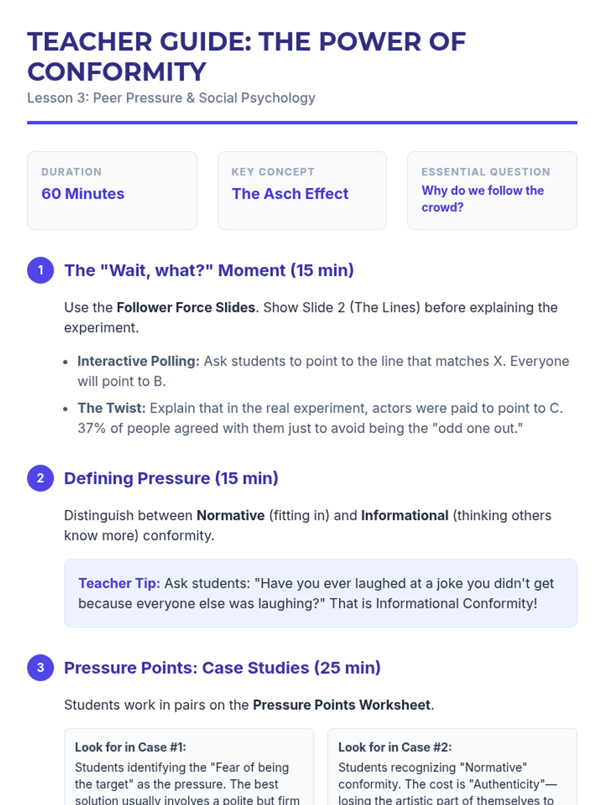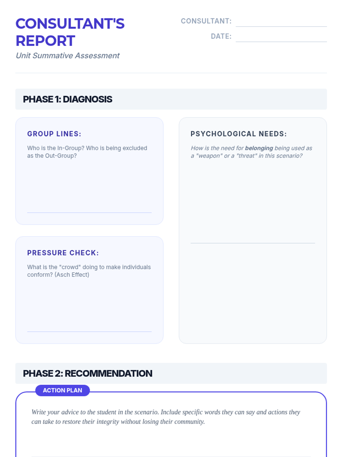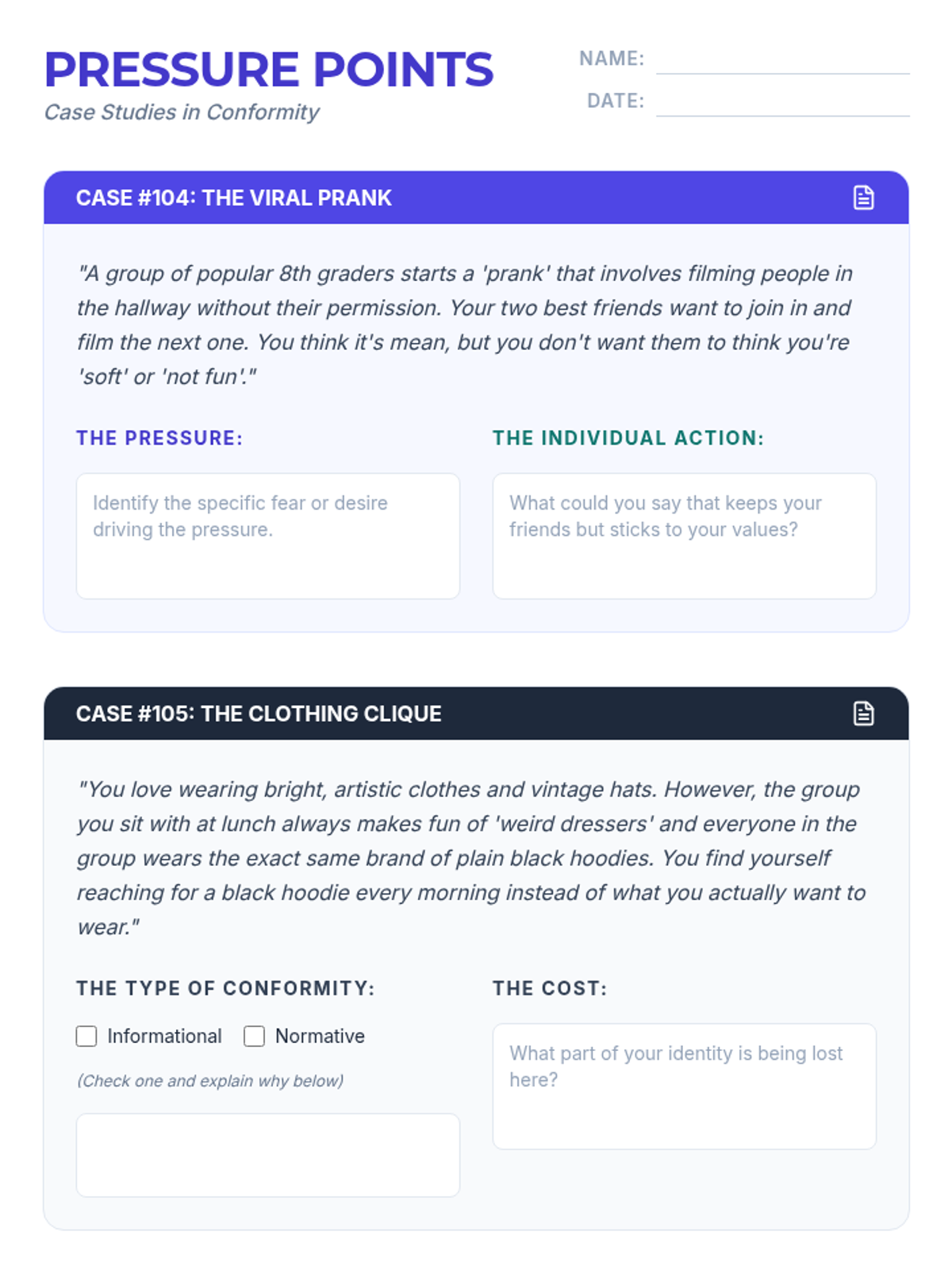 This social studies sequence for 6th graders explores the psychological impact of social groups and peer influence on identity formation. Students investigate the need for belonging, the dynamics of in-groups and out-groups, the pressure of conformity, and the concept of code-switching through simulations and case studies.