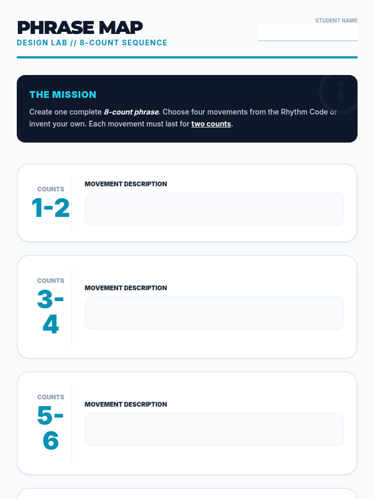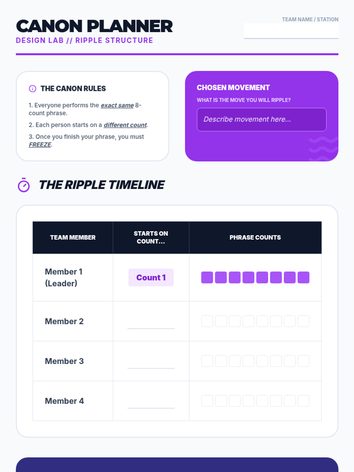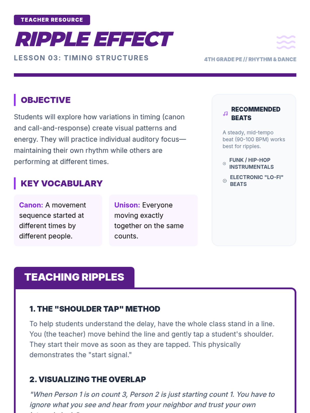 A project-based unit where 4th-grade students learn the fundamentals of rhythm, timing, and synchronization. Students progress from partner mirroring to creating complex 32-count group routines using 8-count phrases and canon techniques.