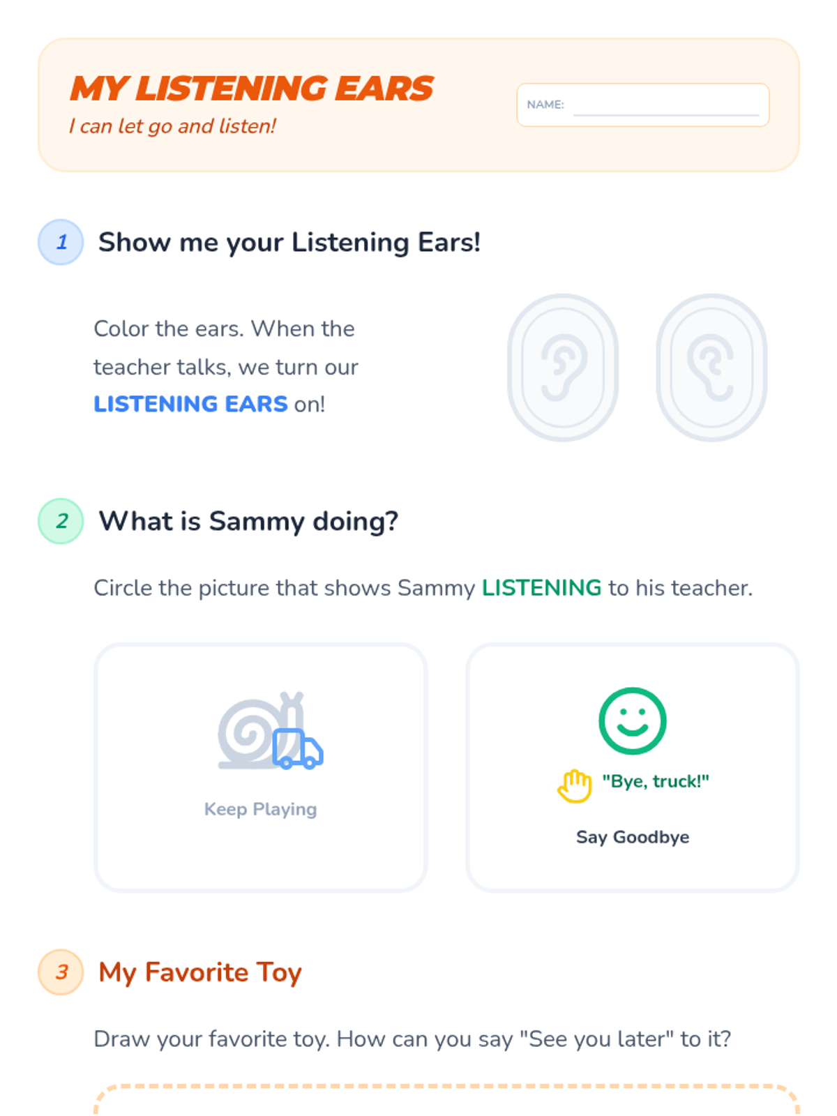 A 5-lesson series designed for a kindergarten student to understand the importance of school attendance, healthy habits, asking for help, and home routines. The sequence uses visual support and engaging activities to build school readiness.