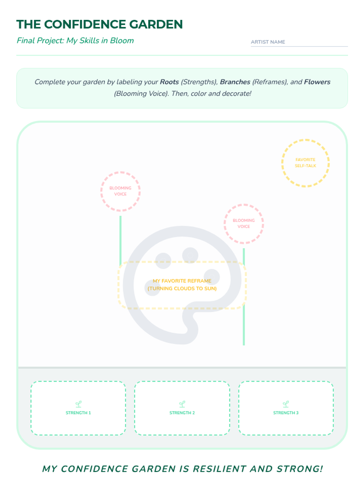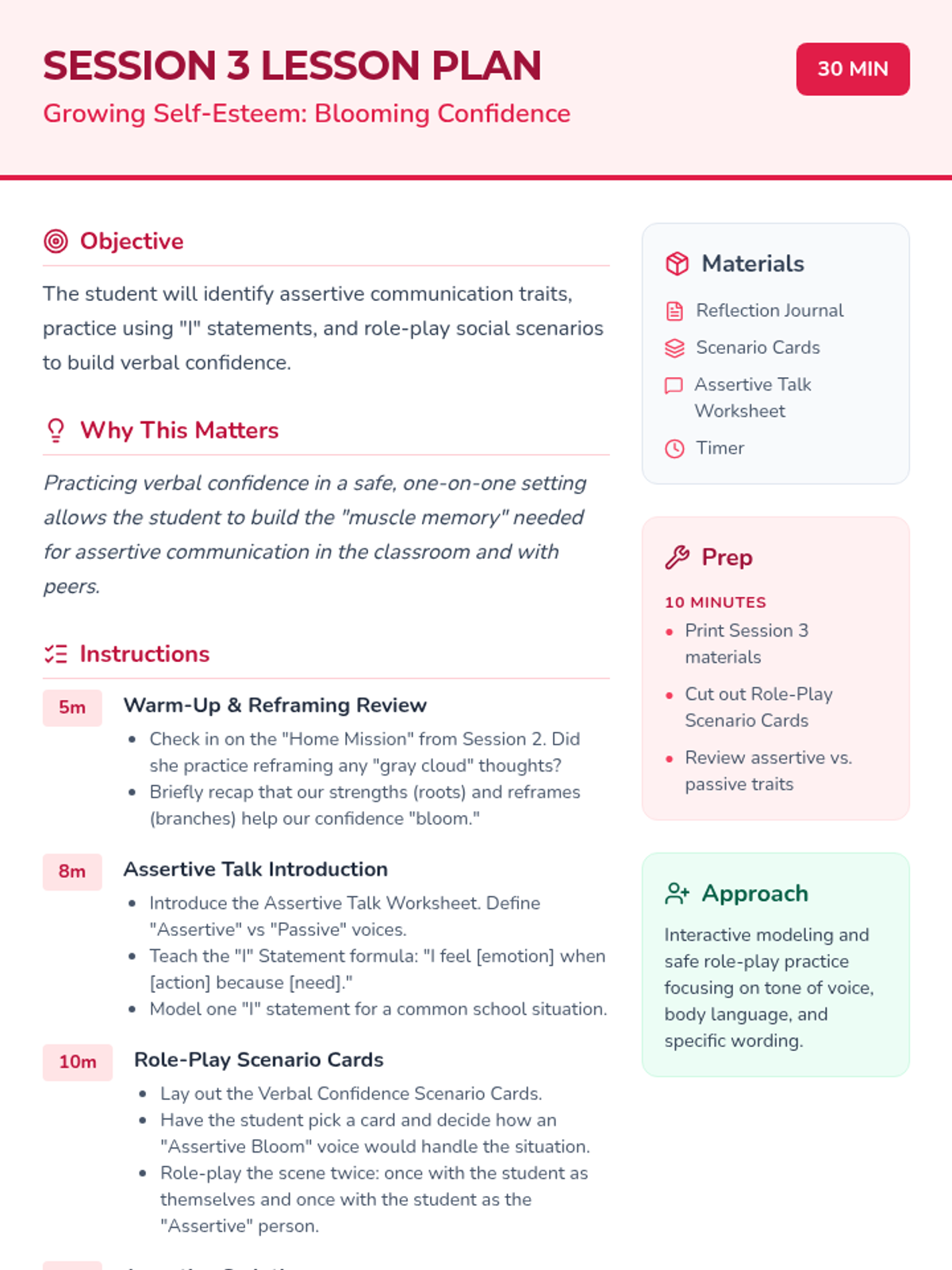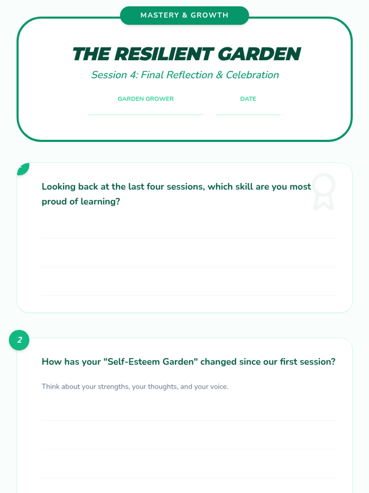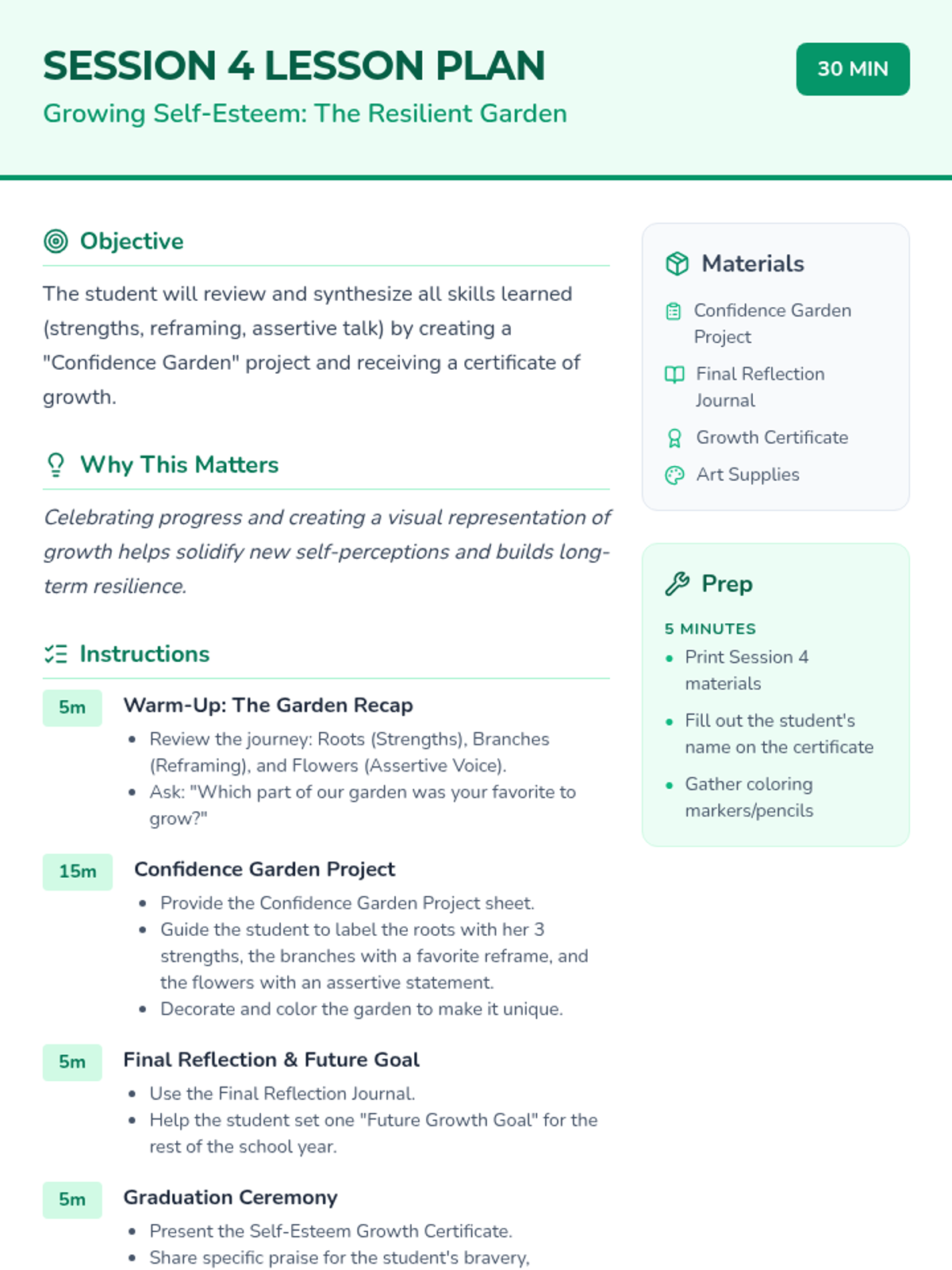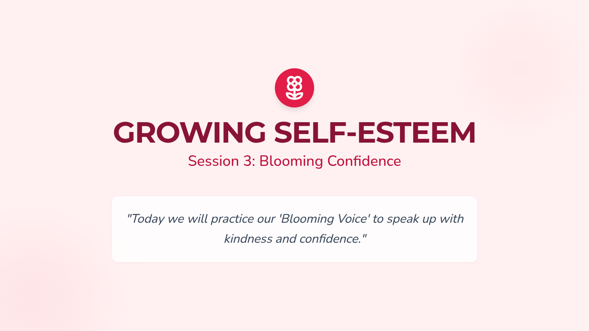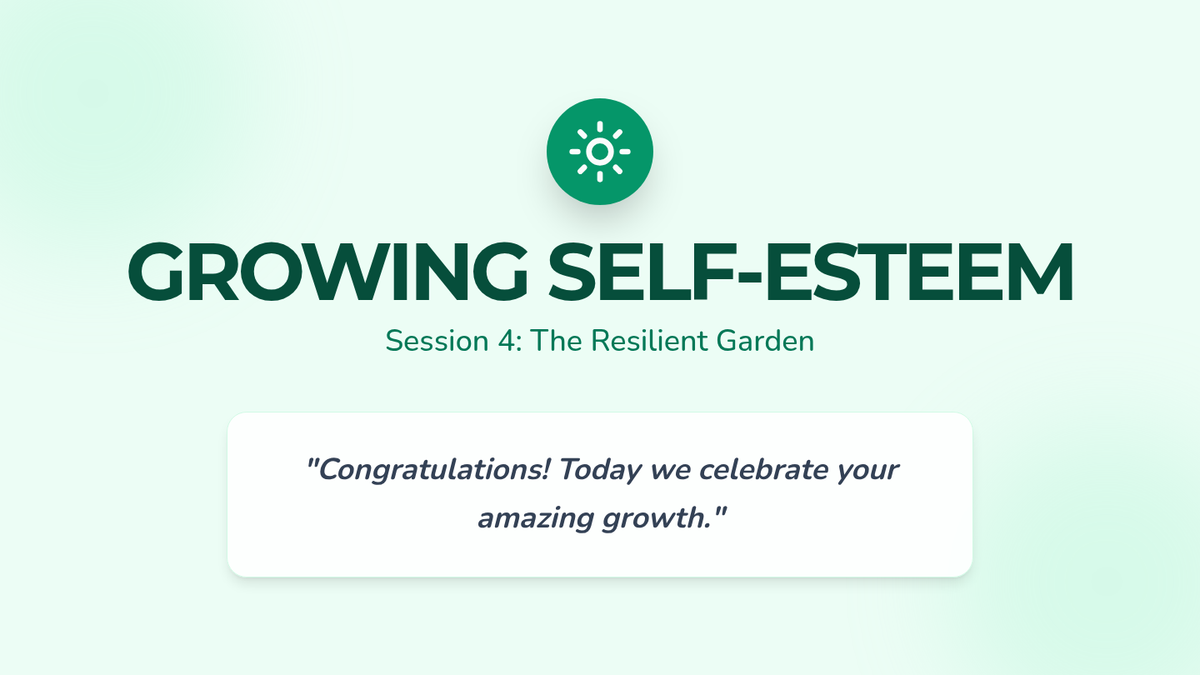 A four-session individual counseling series designed to boost self-esteem and verbal confidence in a 4th-grade student through the metaphor of a growing garden. The sequence covers identifying strengths, reframing negative thoughts, practicing social confidence, and celebrating personal growth.