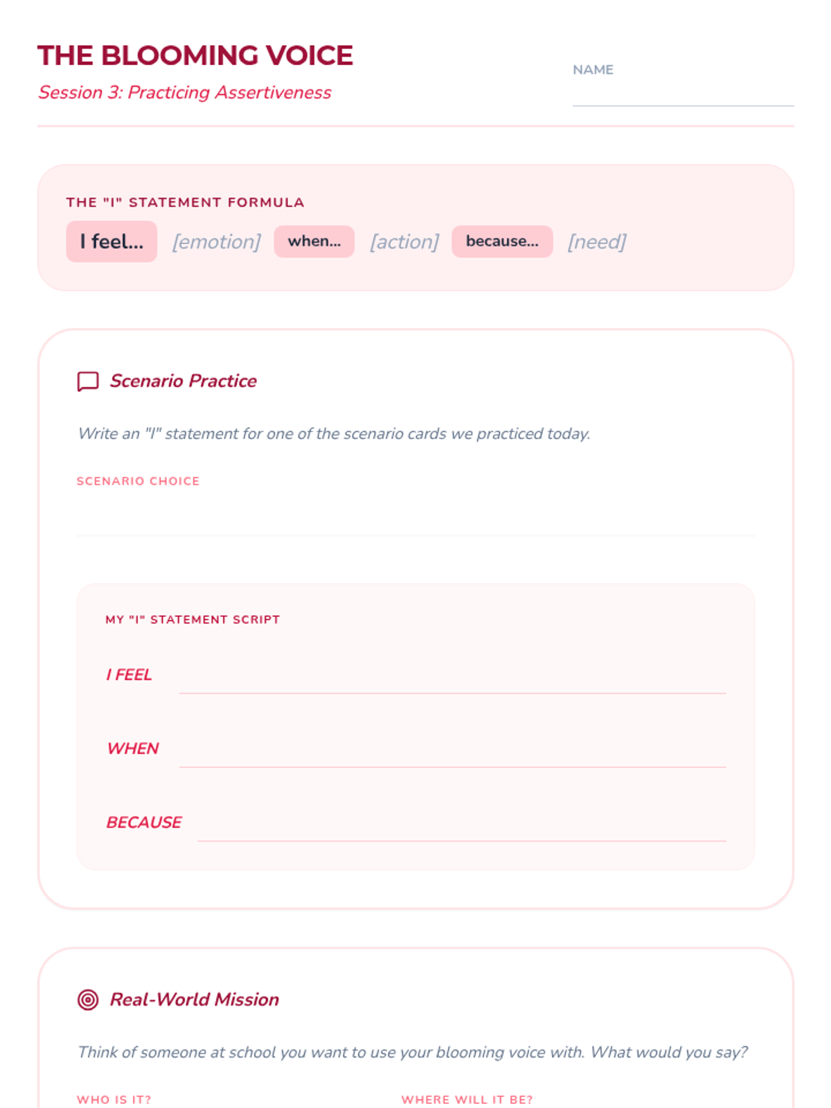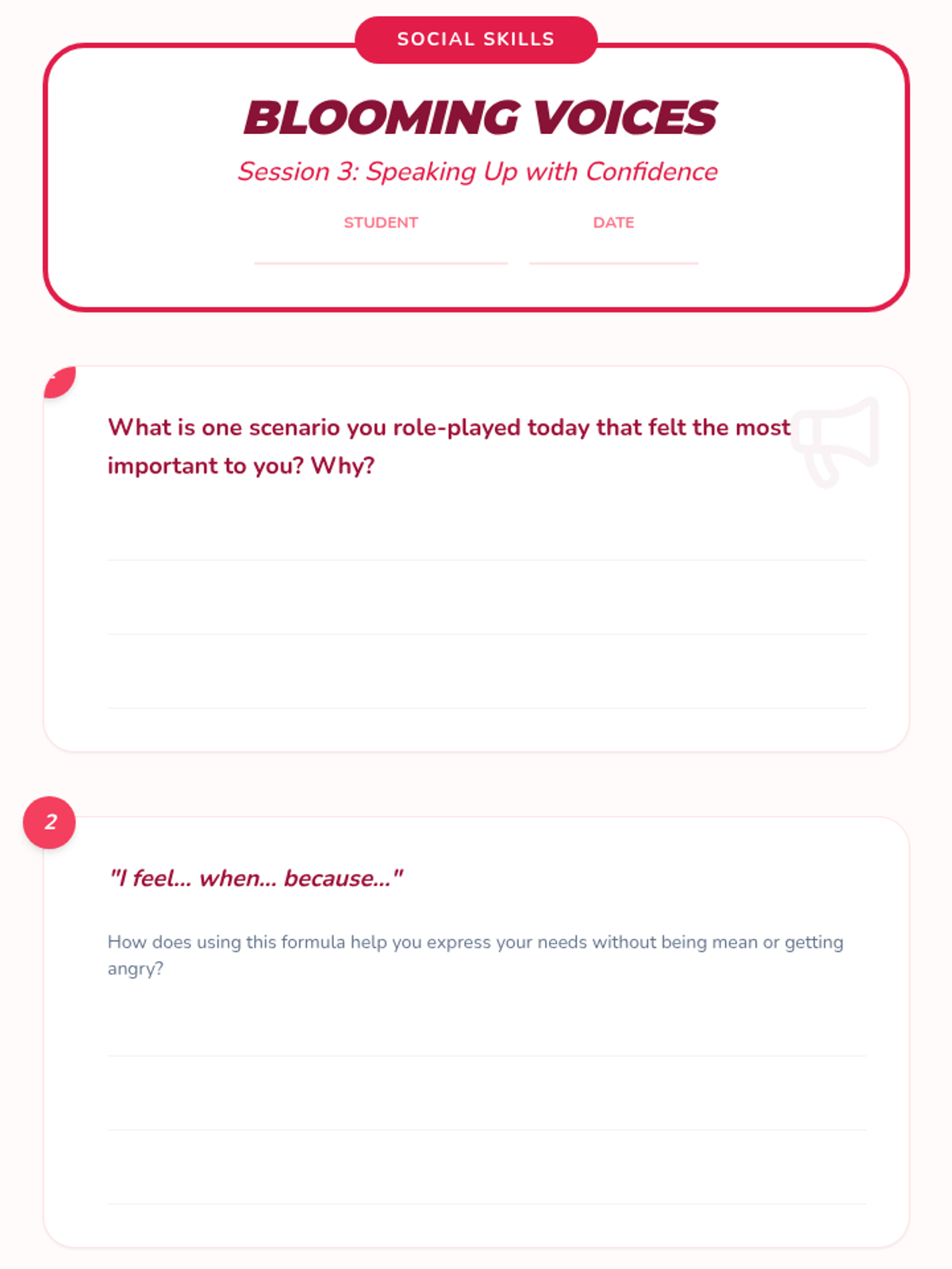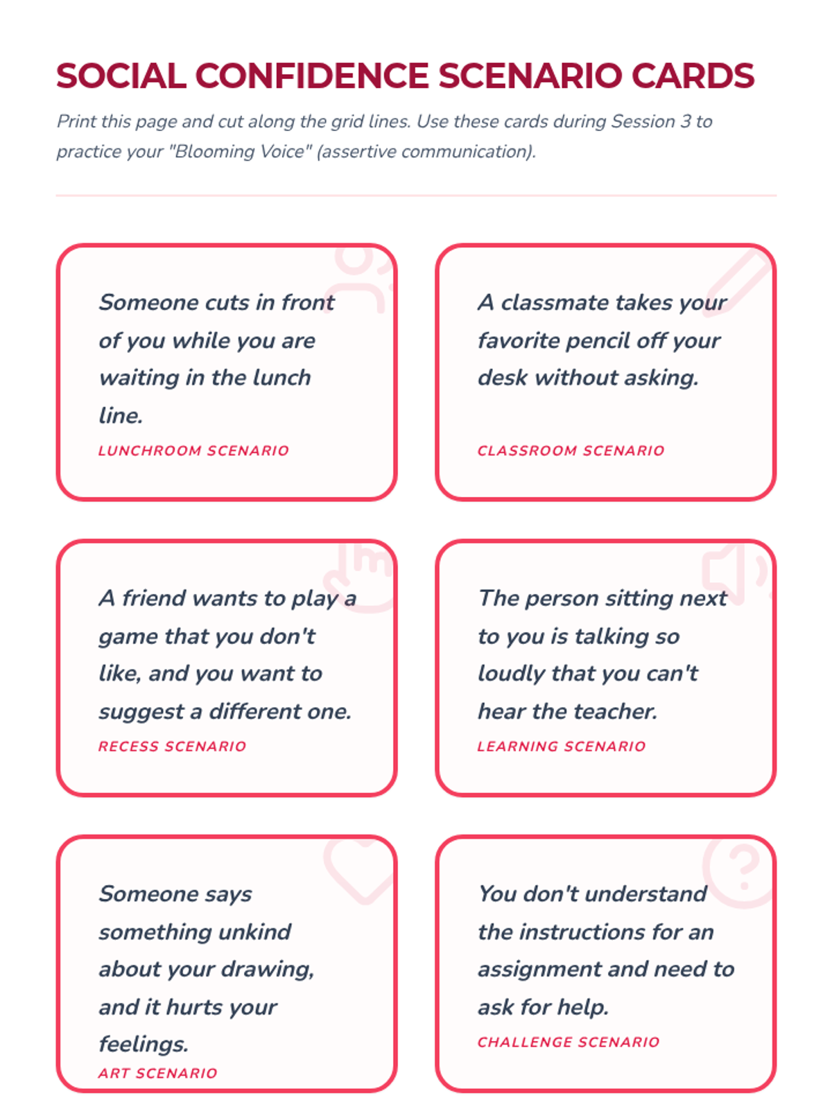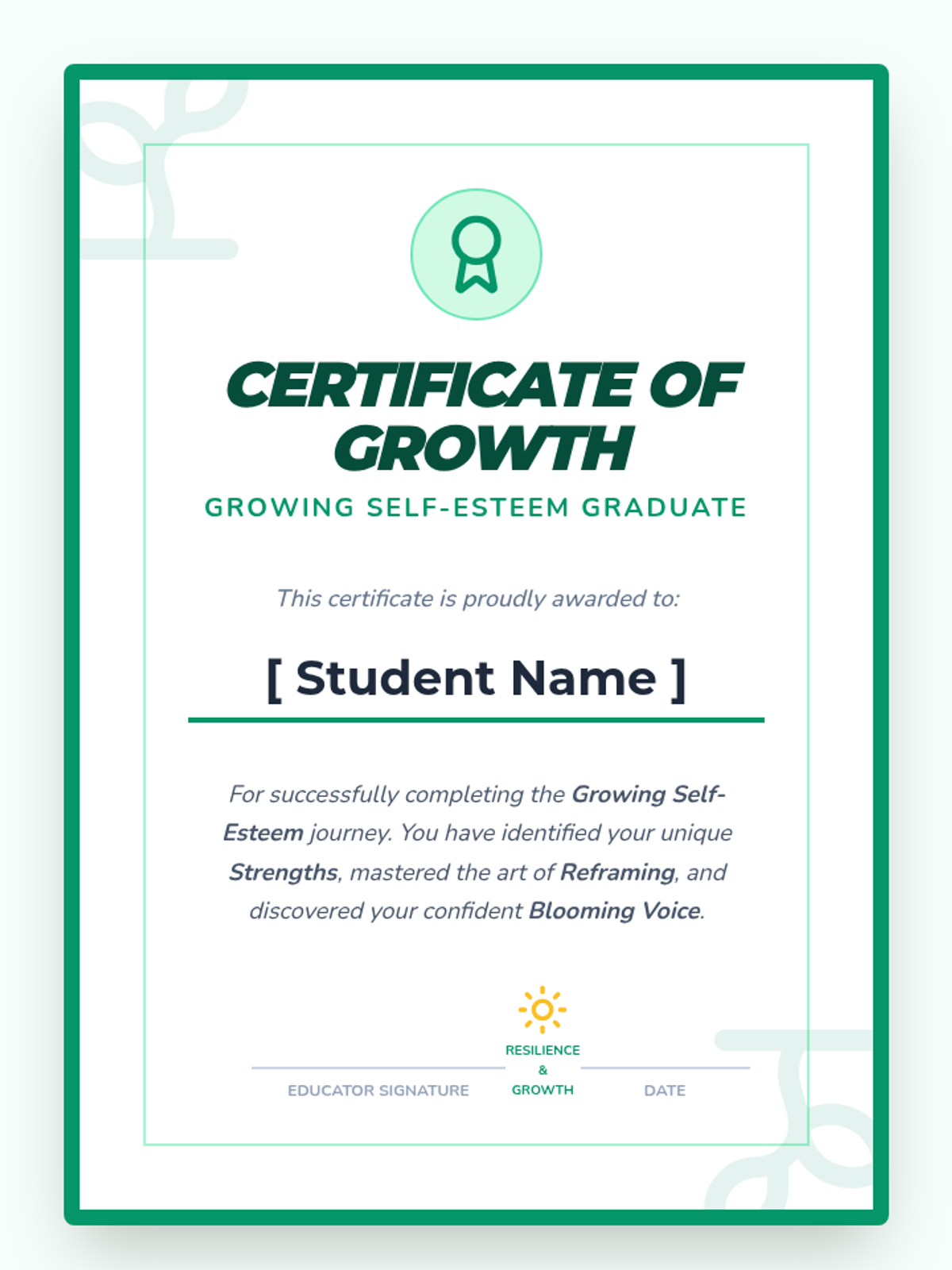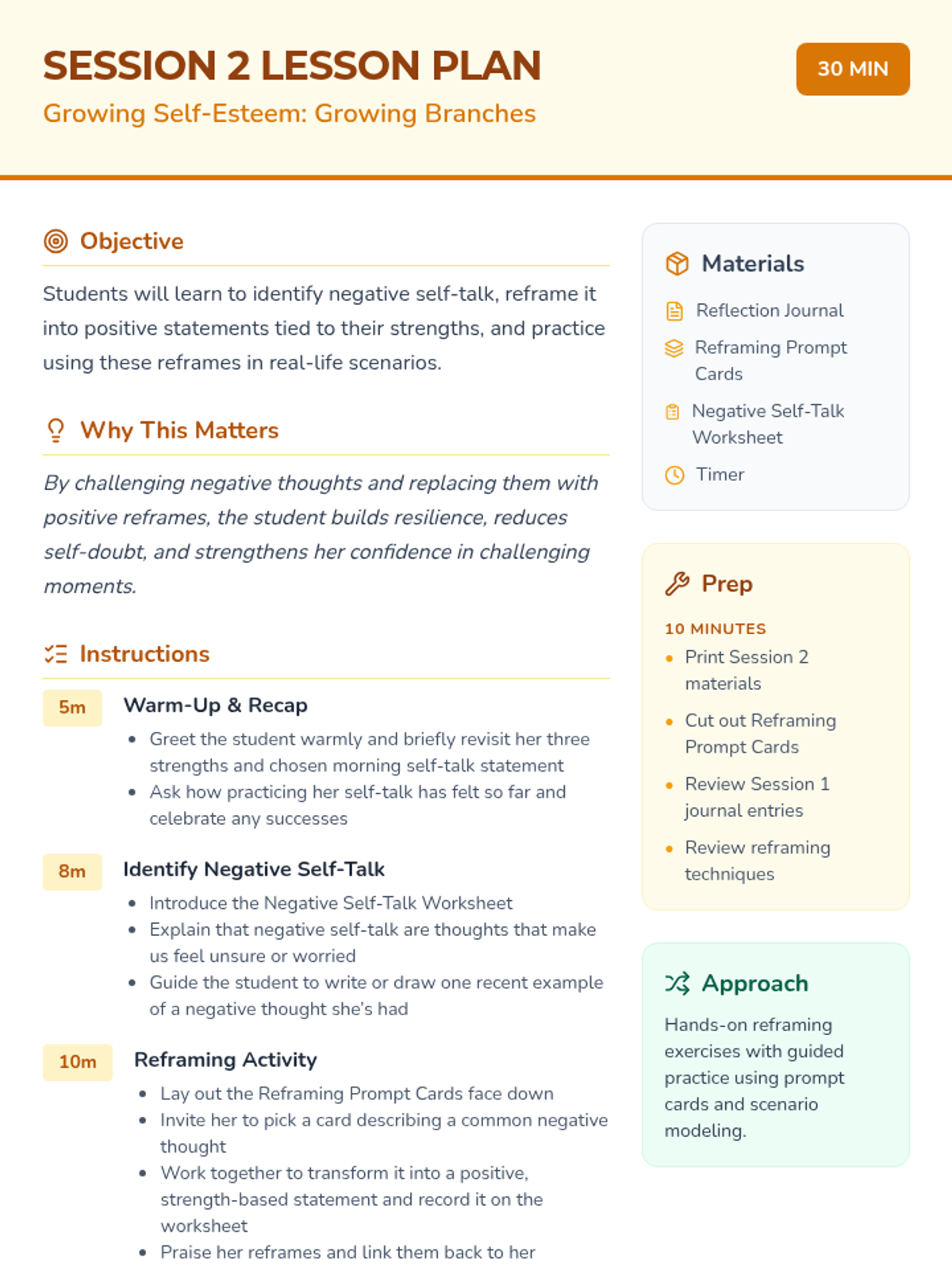 A four-session individual counseling series designed to boost self-esteem and verbal confidence in a 4th-grade student through the metaphor of a growing garden. The sequence covers identifying strengths, reframing negative thoughts, practicing social confidence, and celebrating personal growth.