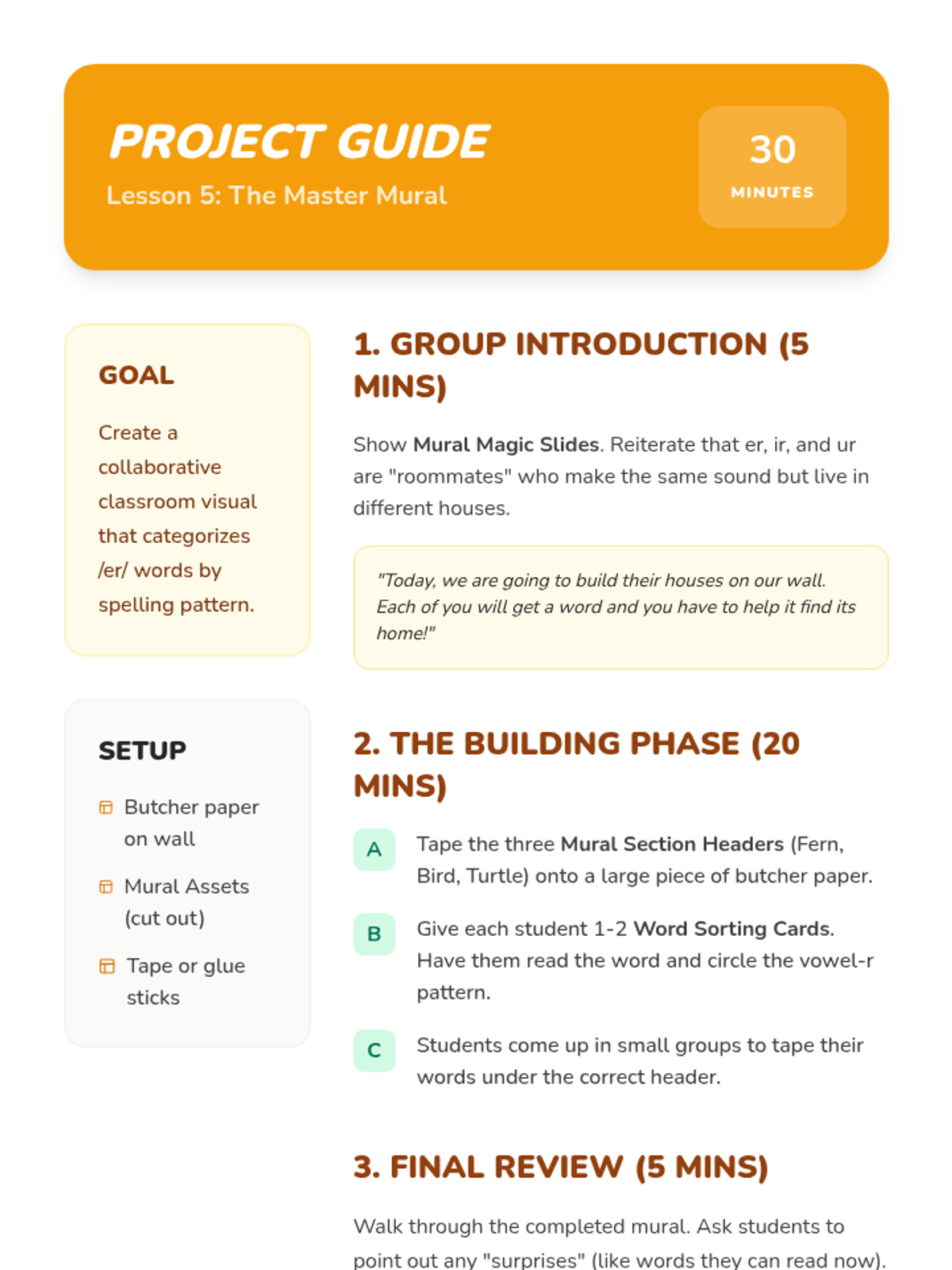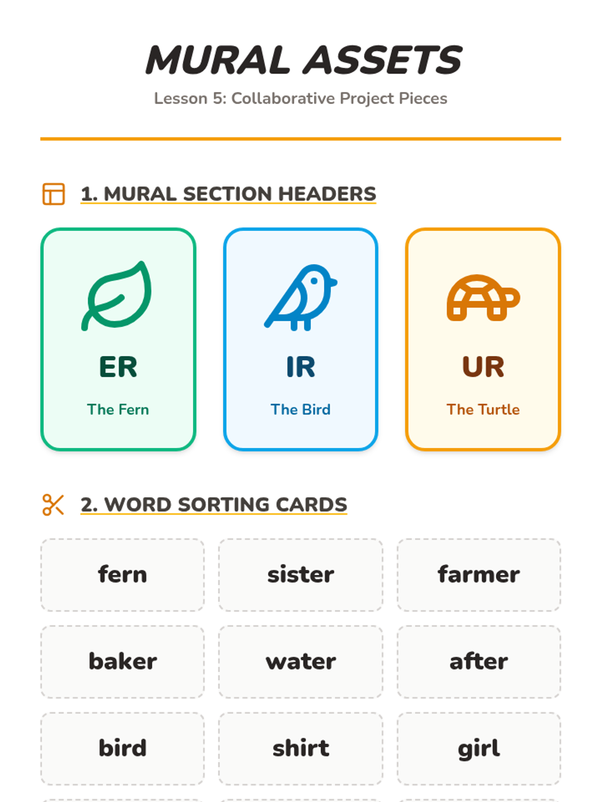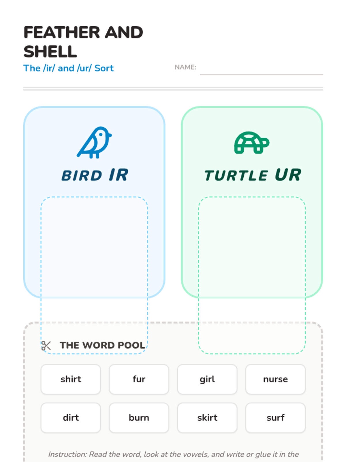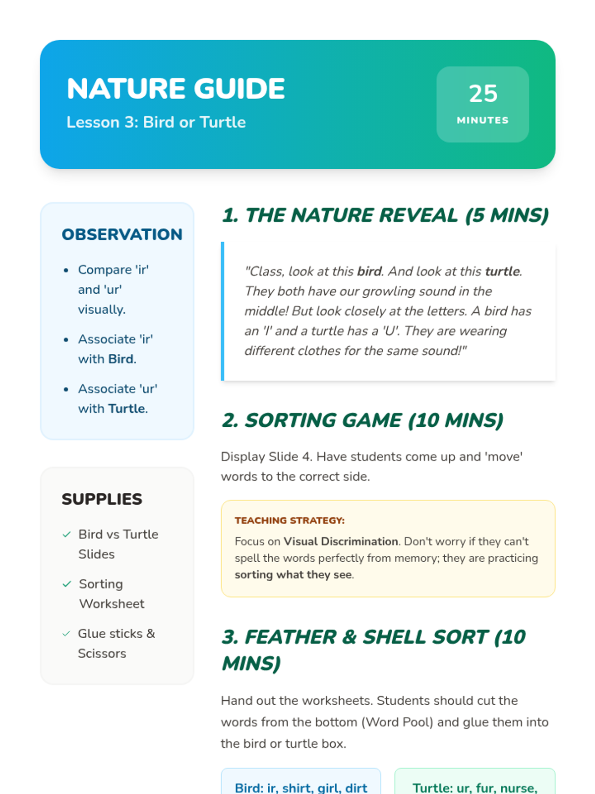 A Kindergarten sequence introducing the /er/ sound and its three common spellings: 'er', 'ir', and 'ur'. Using an animal and nature theme, students learn to recognize these patterns through oral practice, case studies, word sorting, and collaborative activities.