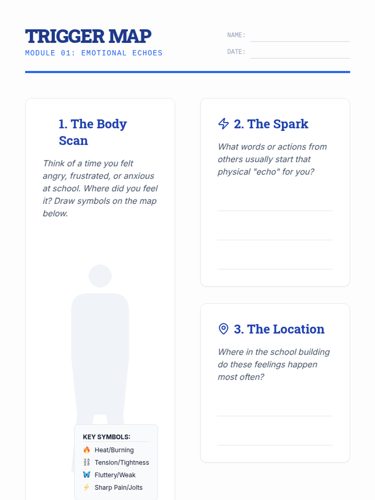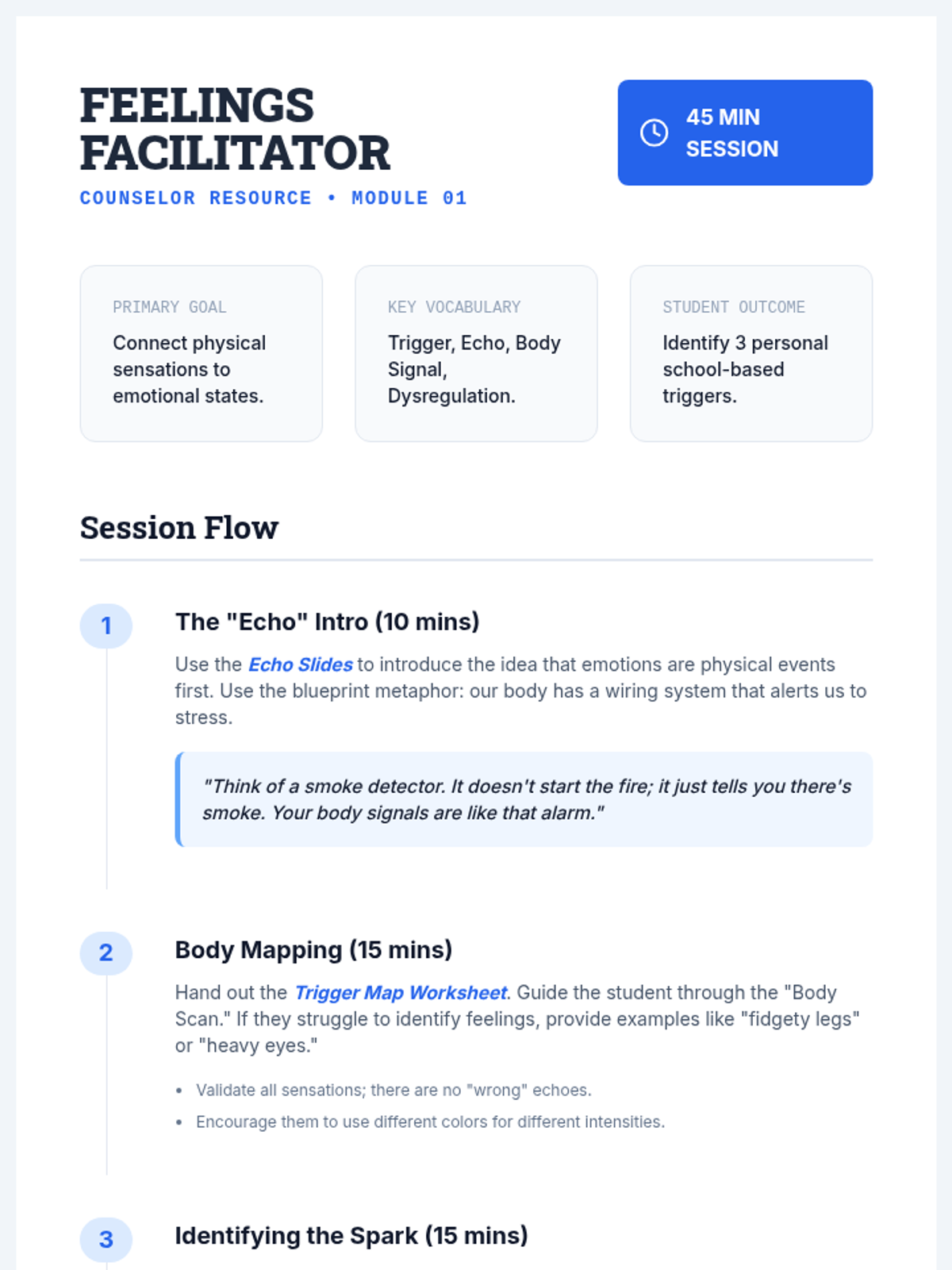 A comprehensive counseling sequence designed to help students navigate their emotional landscape, understand the impact of their actions on school relationships, and build a personalized repertoire of coping strategies. Through three core modules, students move from awareness to accountability to action.