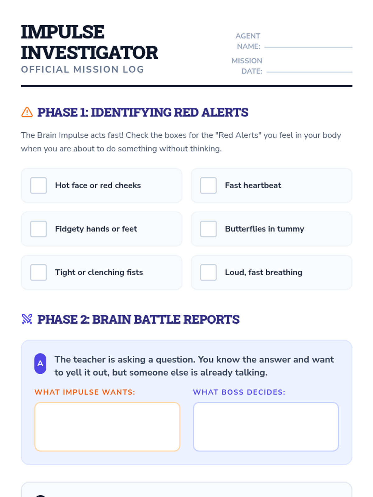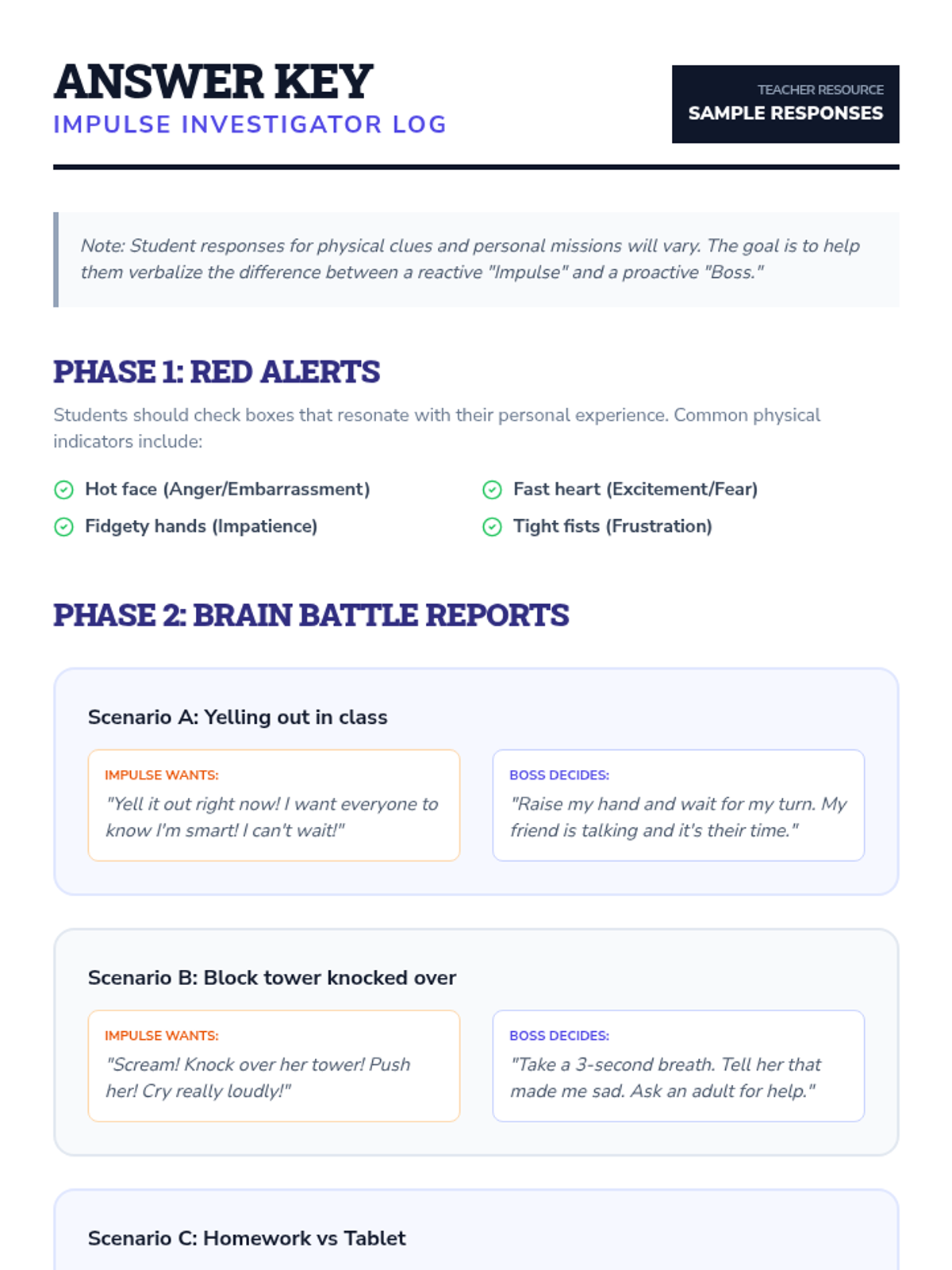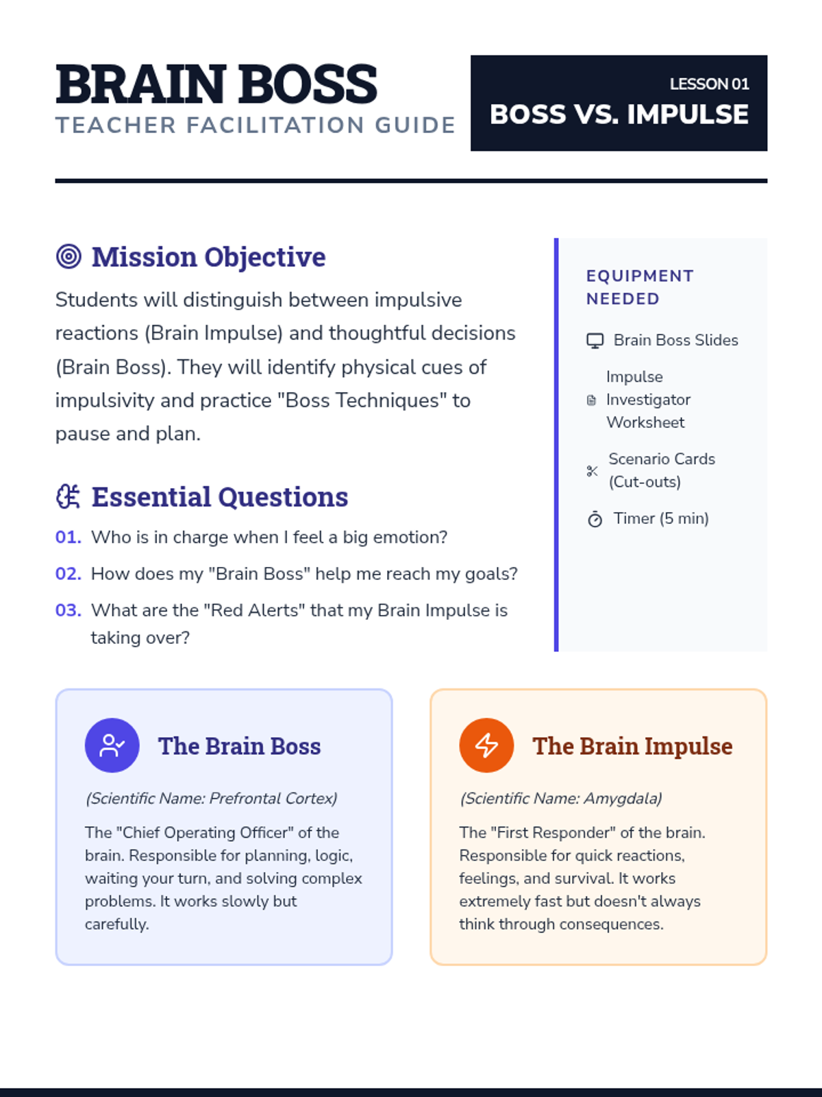 A unit focused on developing executive functioning skills in young learners by teaching them to recognize and manage impulsive reactions in favor of thoughtful, planned actions.