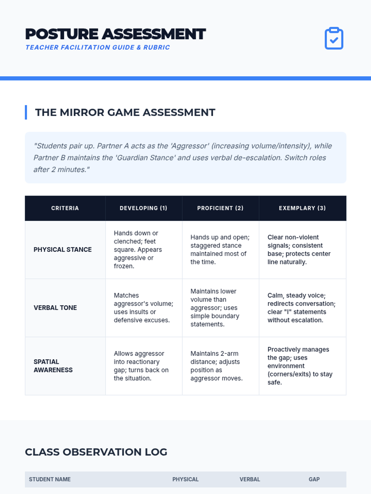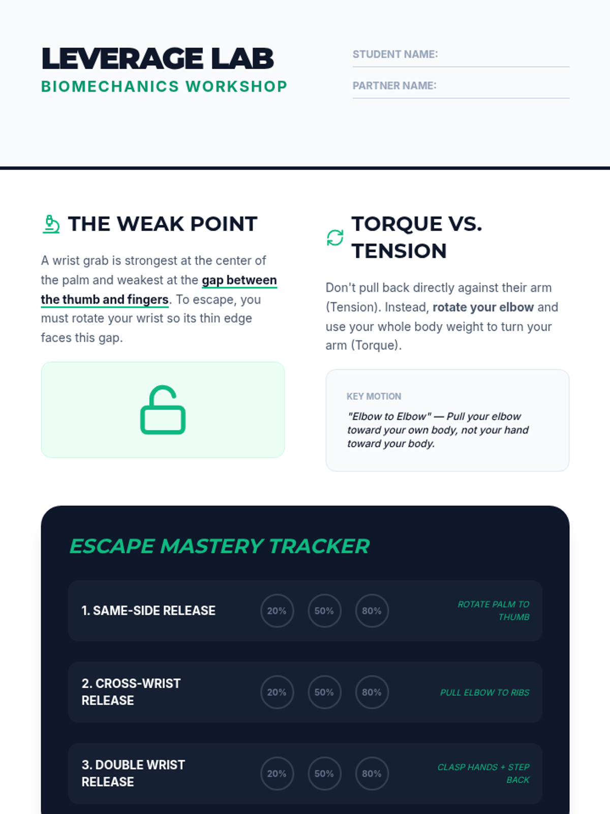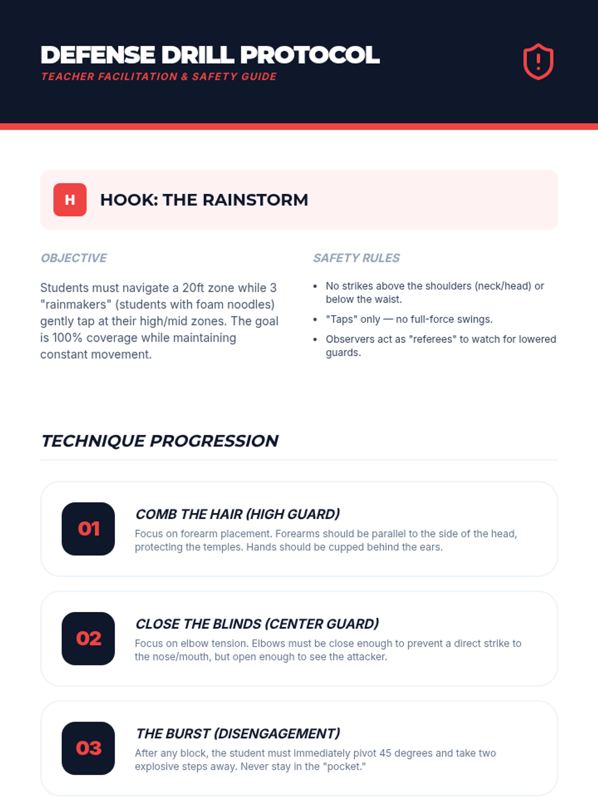 A comprehensive 7th-grade unit on personal safety, situational awareness, and non-combative defense. Students learn to assess risks, set boundaries, de-escalate conflicts, and master basic escape mechanics to prioritize safety and avoid physical engagement.