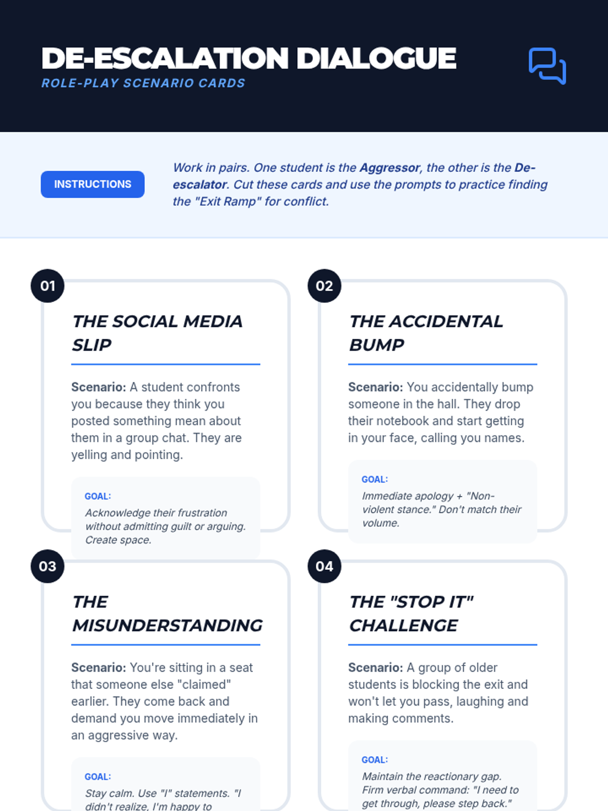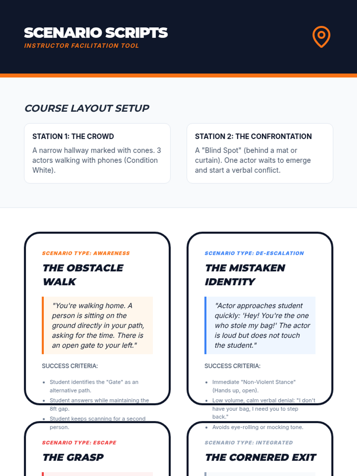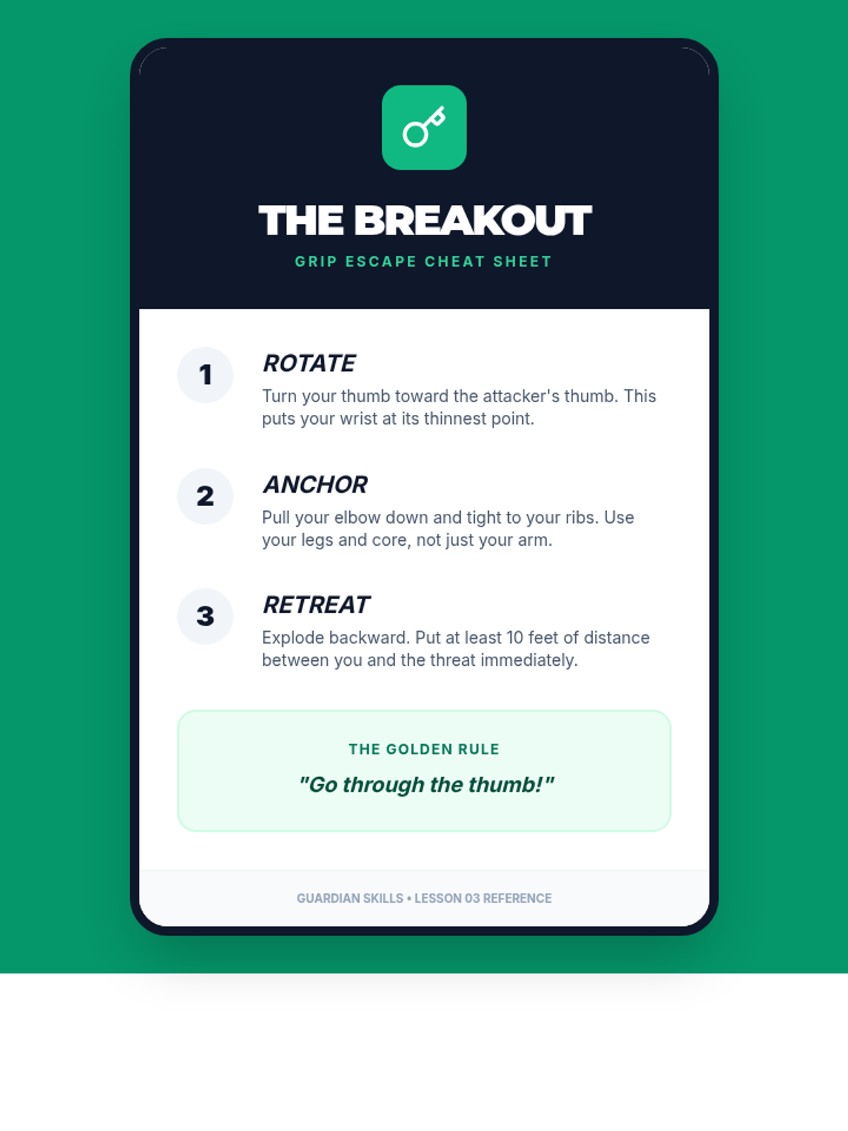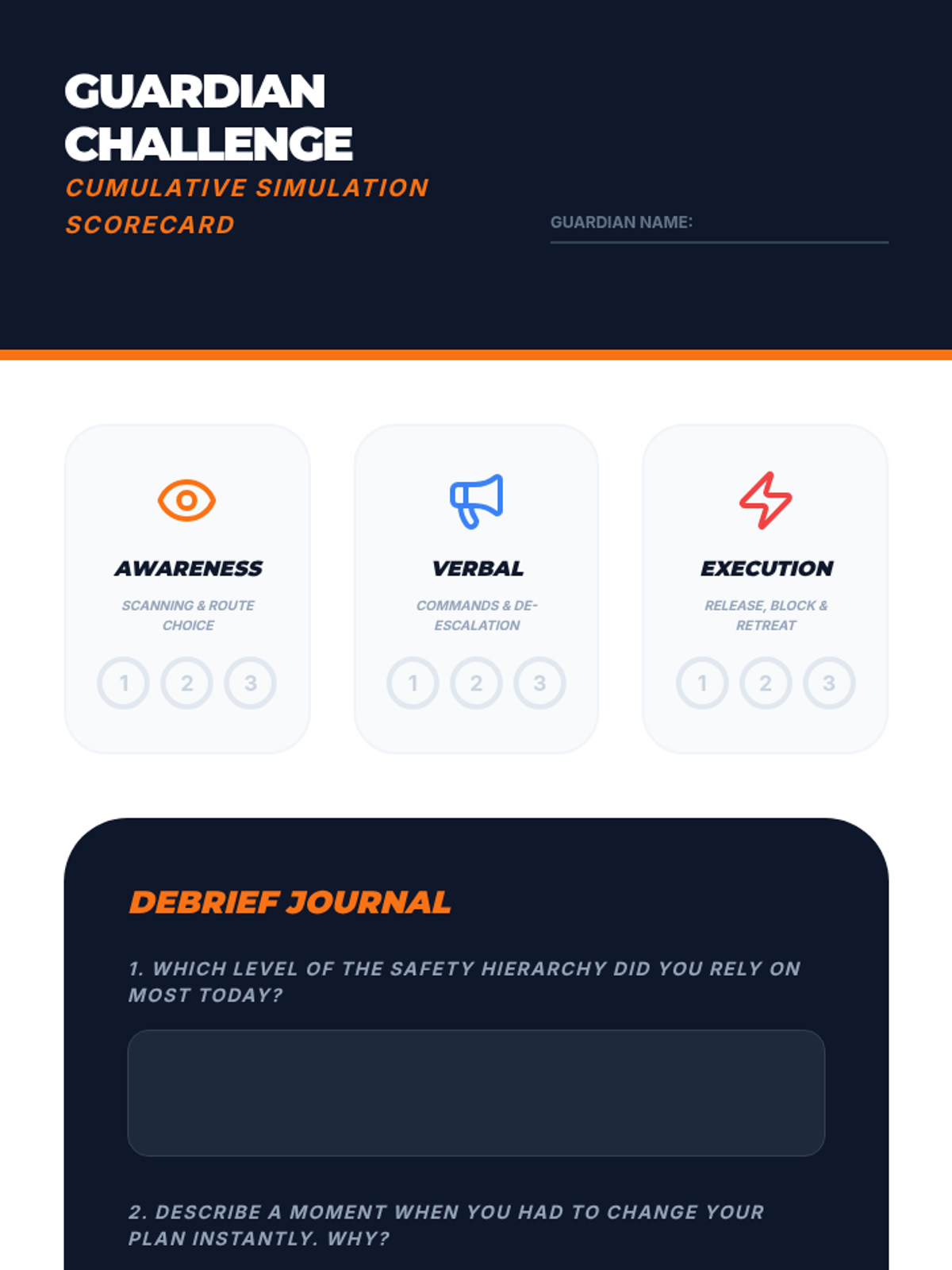 A comprehensive 7th-grade unit on personal safety, situational awareness, and non-combative defense. Students learn to assess risks, set boundaries, de-escalate conflicts, and master basic escape mechanics to prioritize safety and avoid physical engagement.
