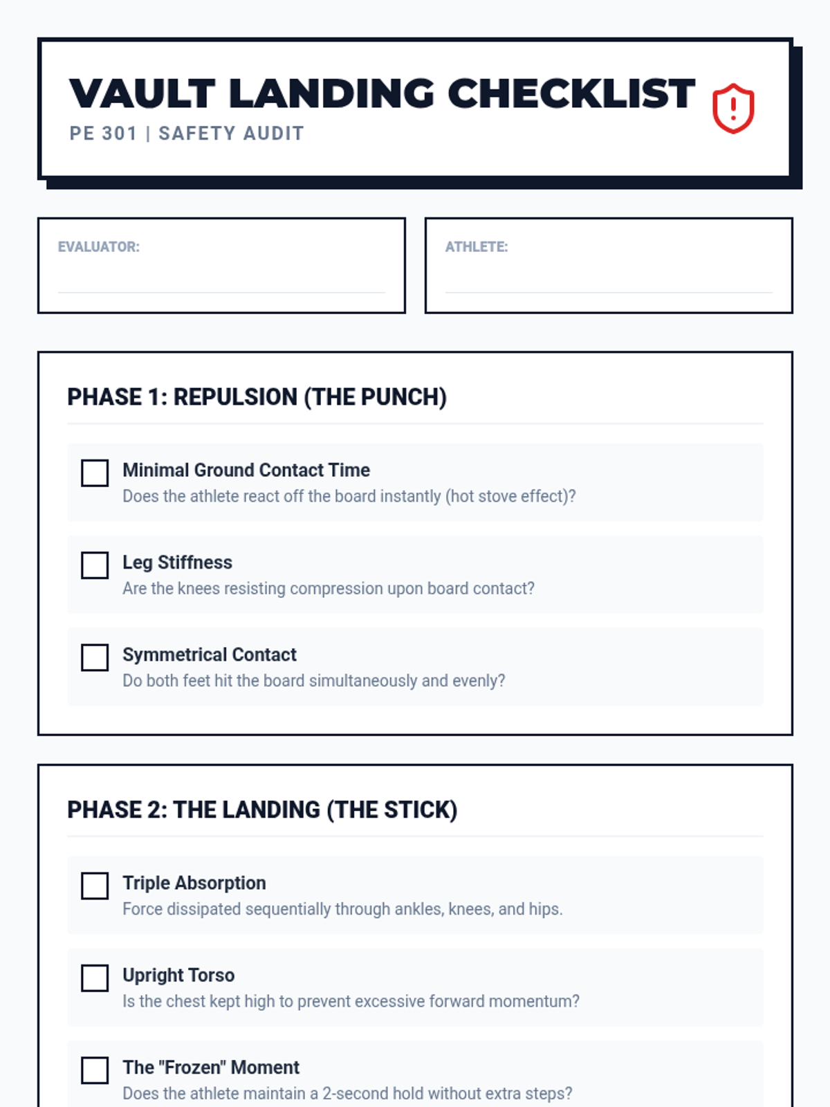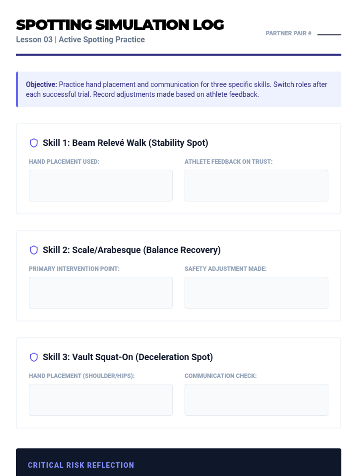 A comprehensive unit for undergraduate students focusing on the balance beam and vault. This sequence emphasizes the intersection of technical precision, biomechanical safety, and artistic composition in gymnastics, with a strong focus on peer-coaching and spotting.