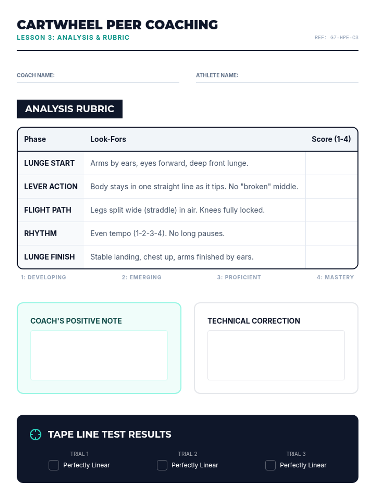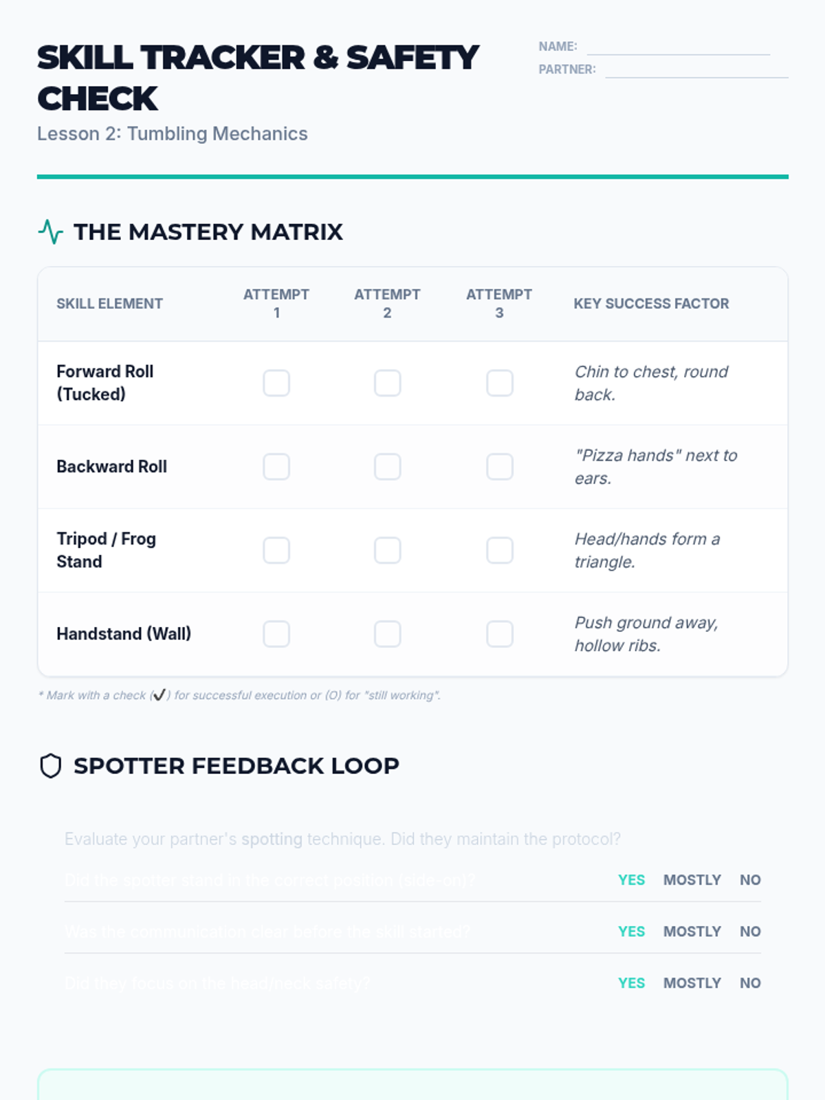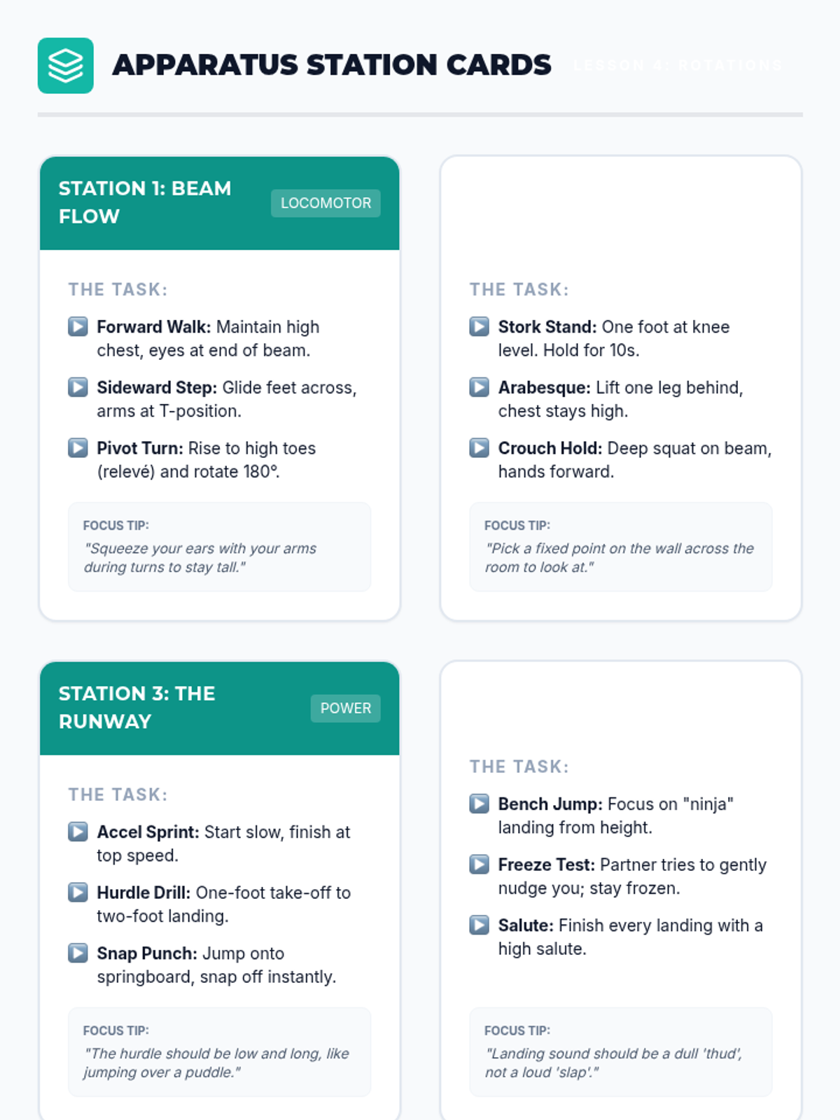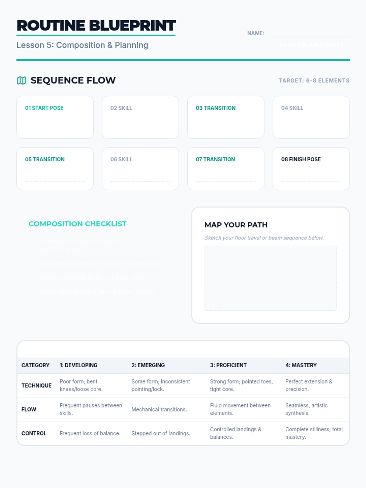 A comprehensive 7th-grade gymnastics unit focusing on the progression from core stability and flexibility to complex tumbling, apparatus work, and routine composition. Students develop technical proficiency, safety awareness, and creative expression through structured skill-building and peer feedback.