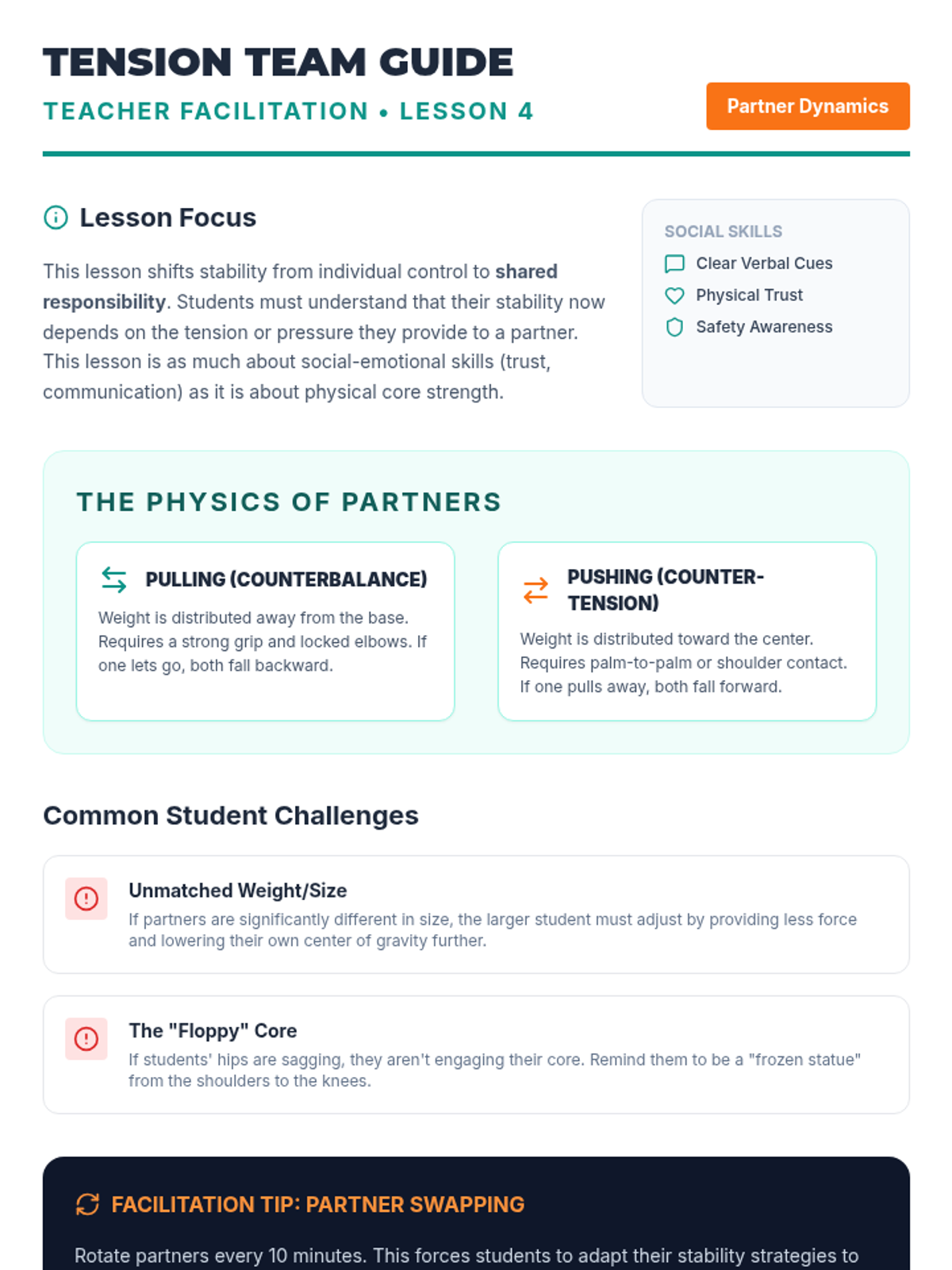 This sequence focuses on developing essential communication skills for 3rd-grade students through physical team-building activities. Students progress from basic verbal instructions to complex non-verbal cues and group synchronization, culminating in a complex problem-solving challenge.